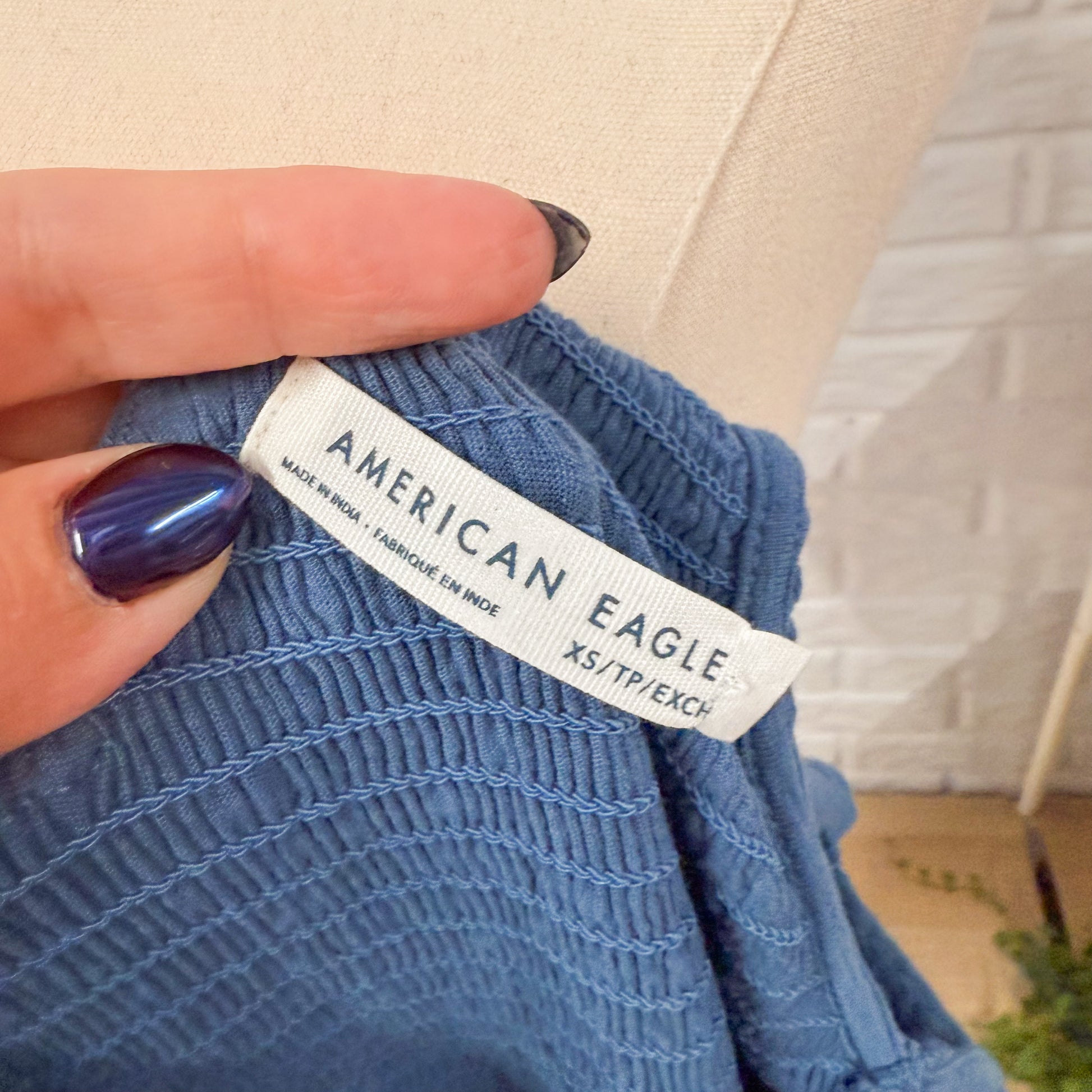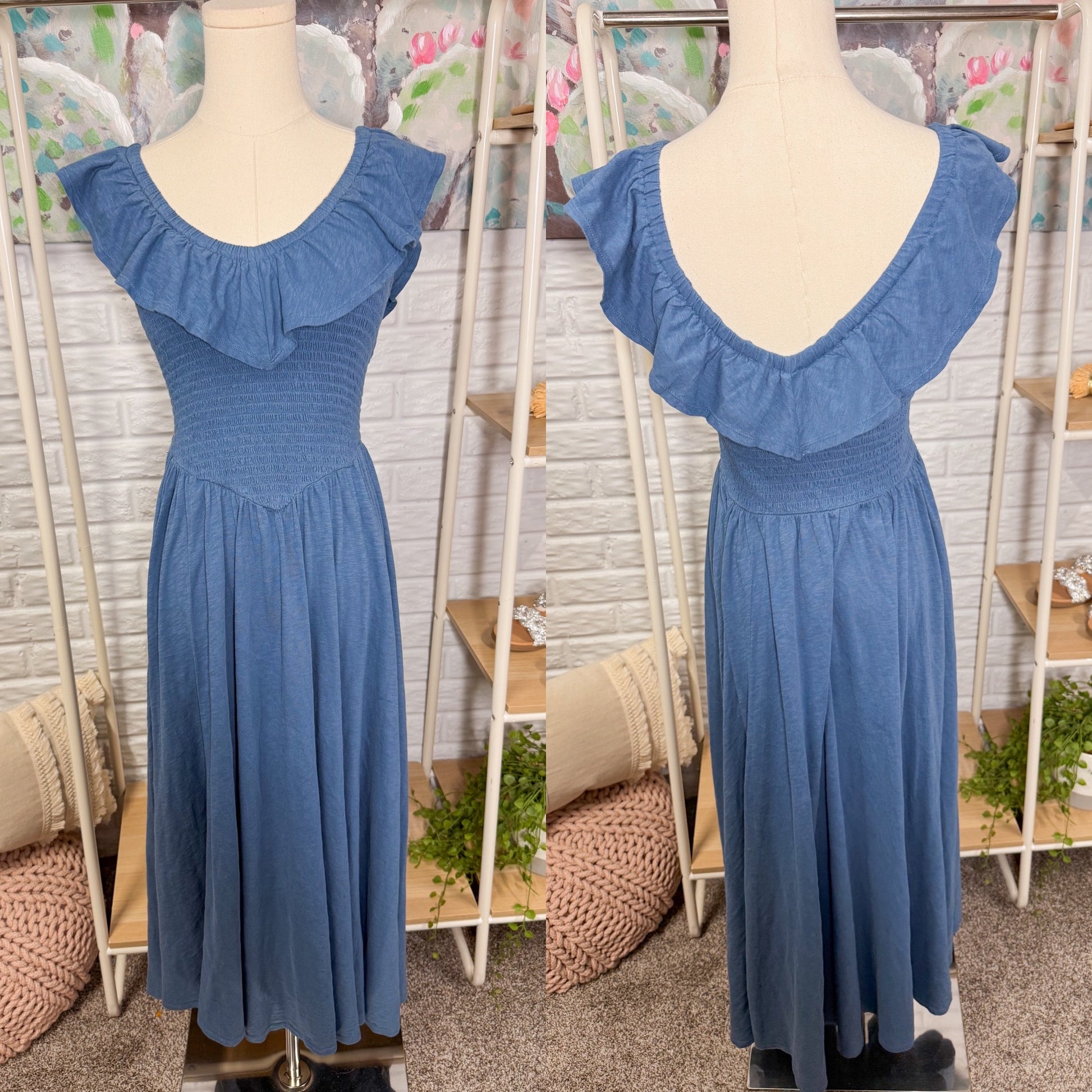 A blue midi dress with a ruffle scoop neckline, smocked bust, and flowy skirt.