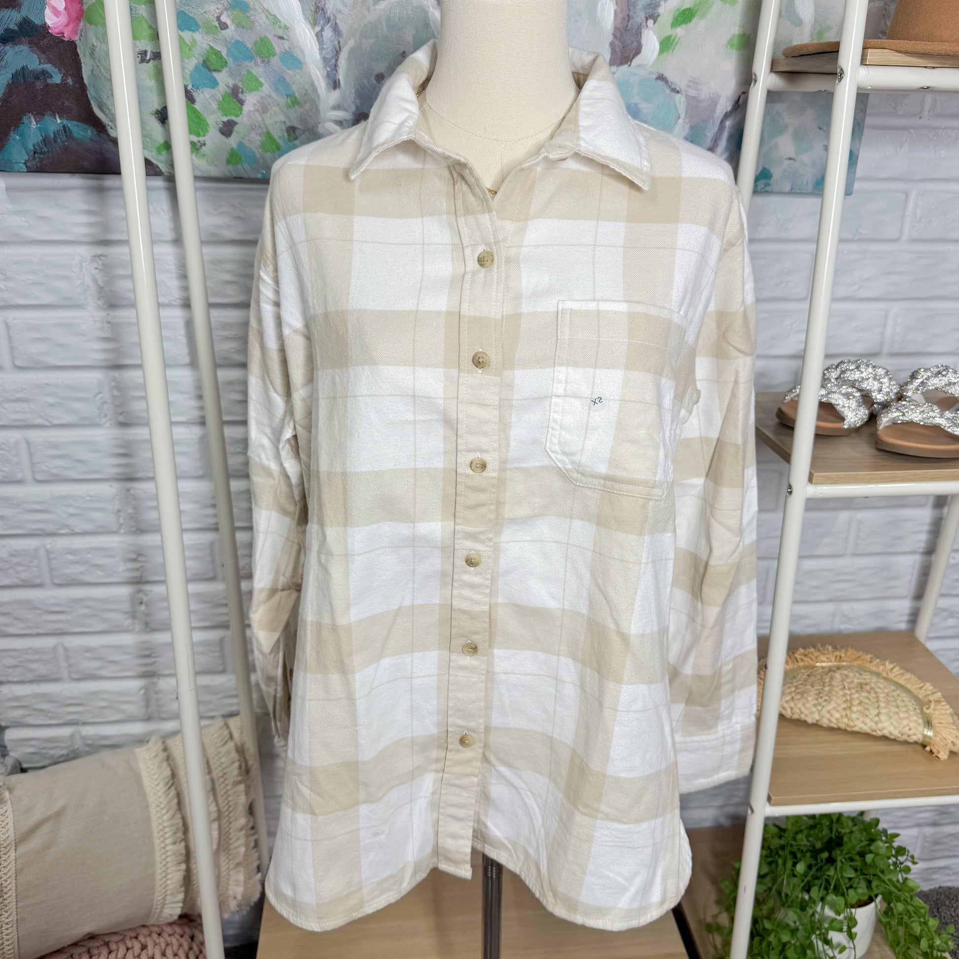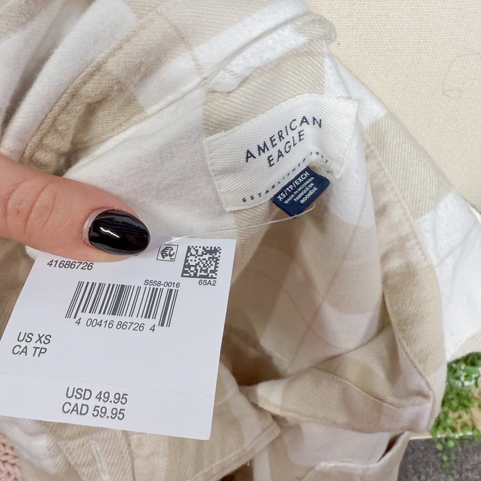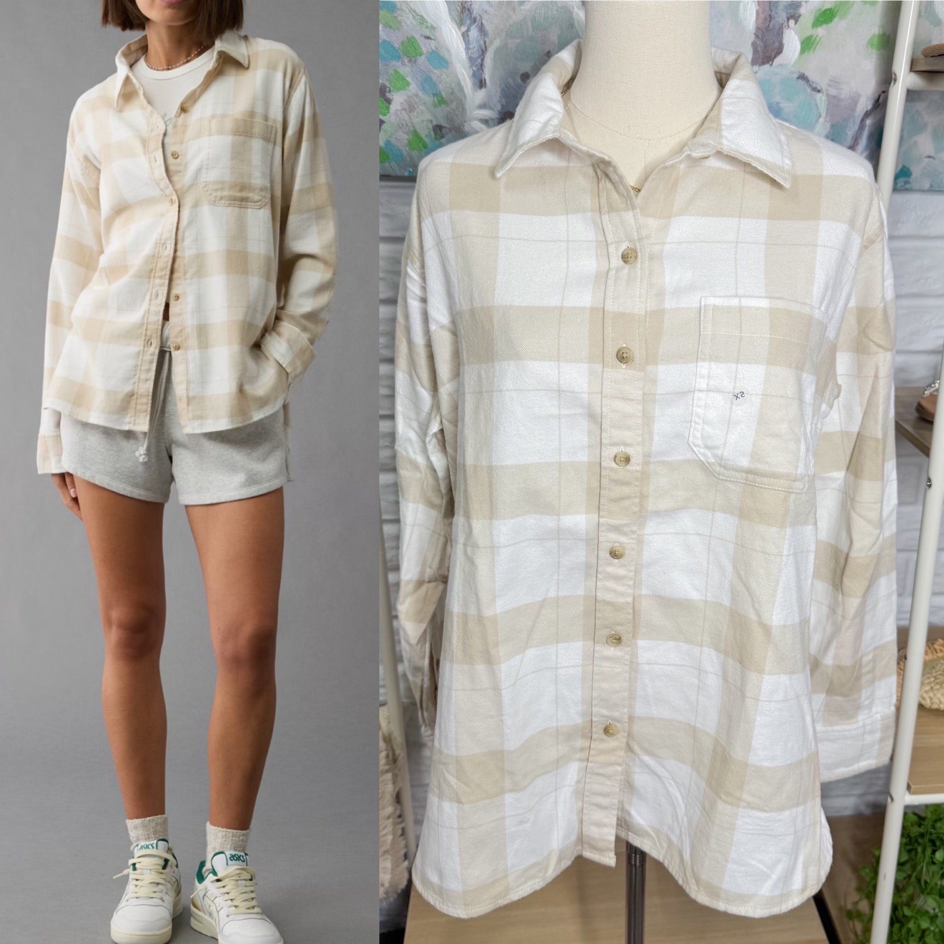 American Eagle New Oversized Cream Plaid Shirt (XS)