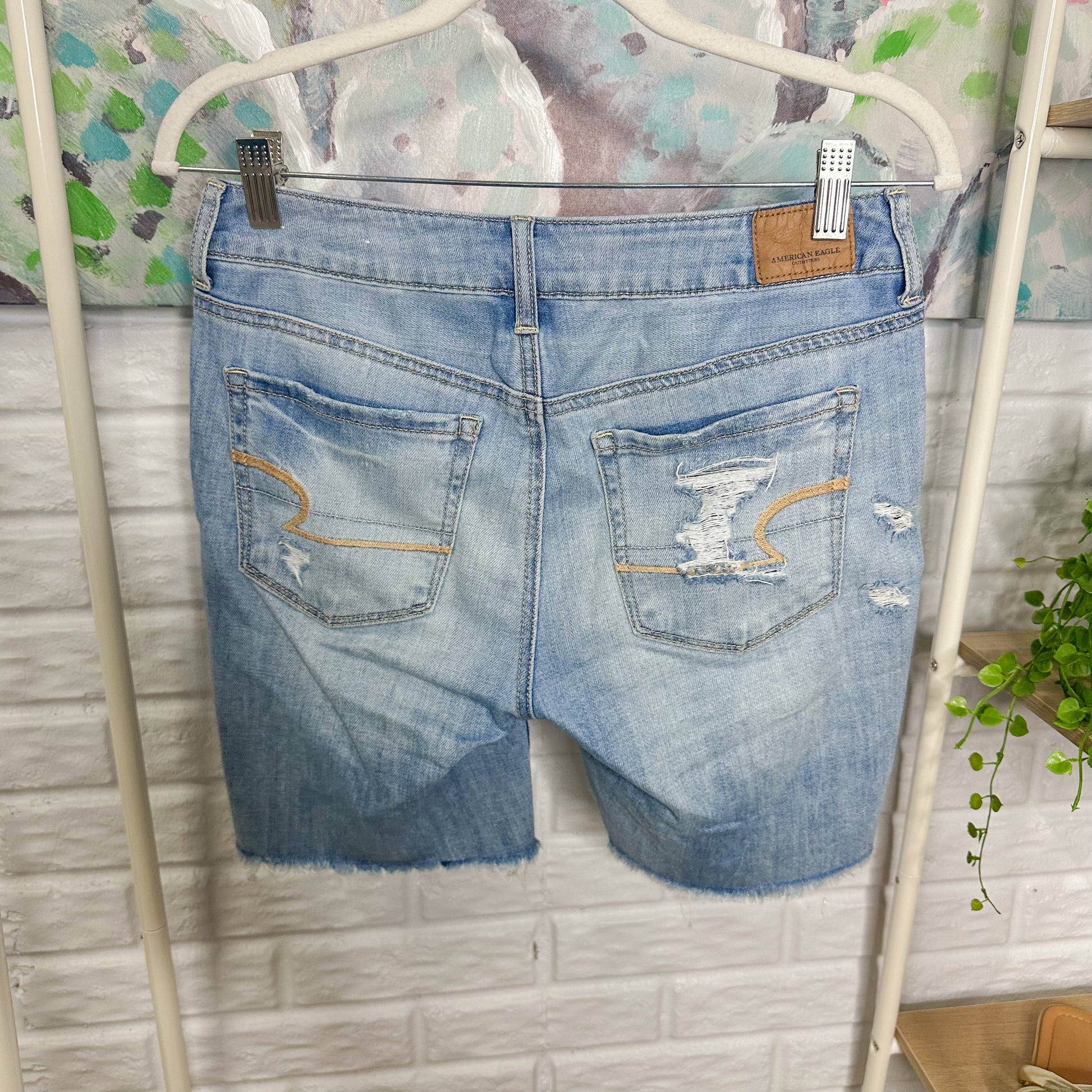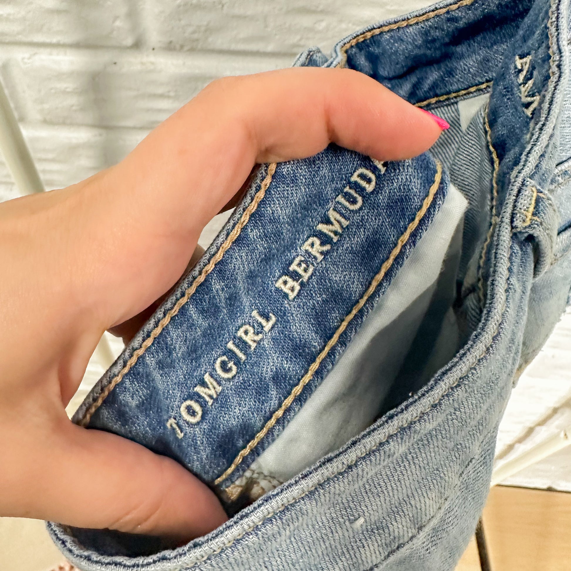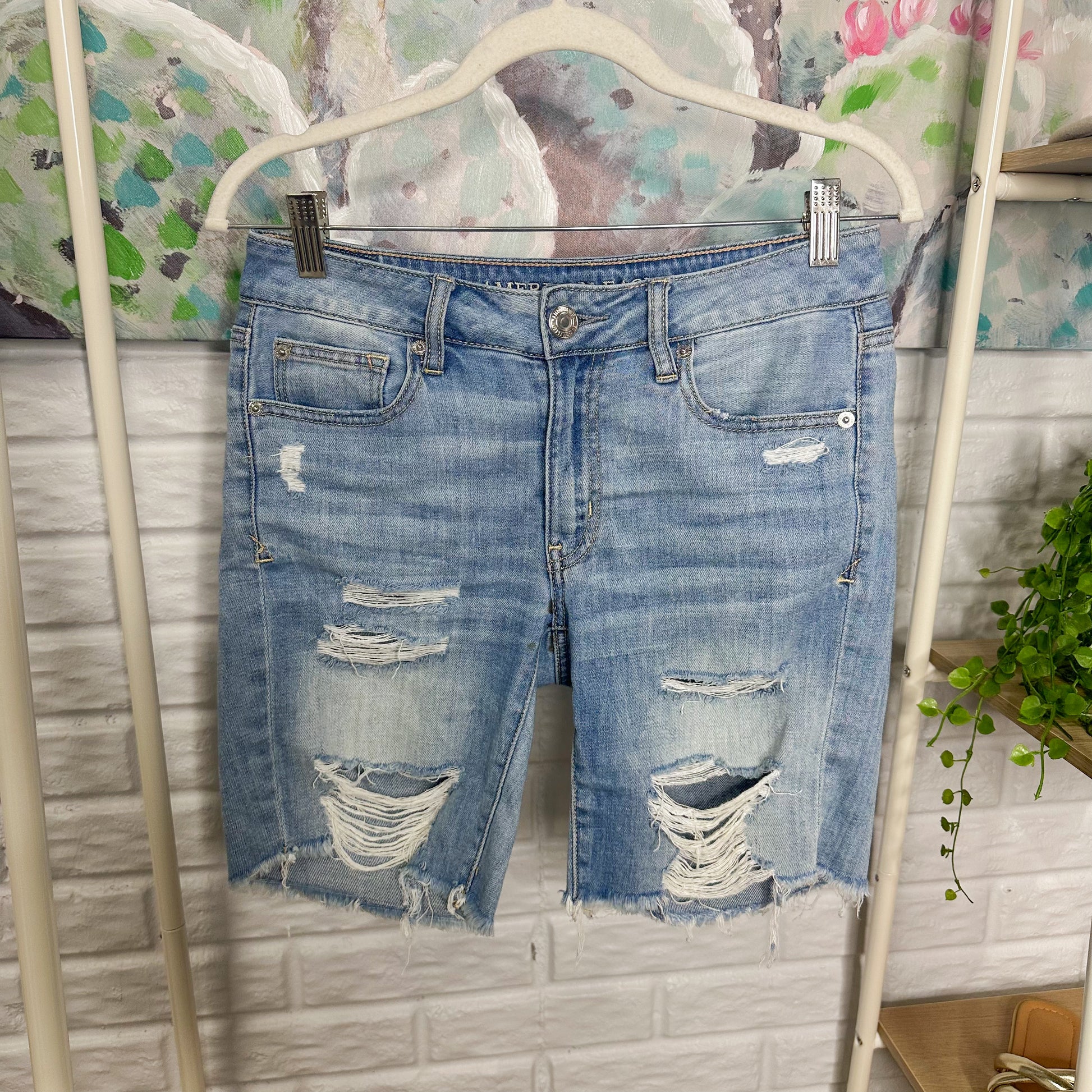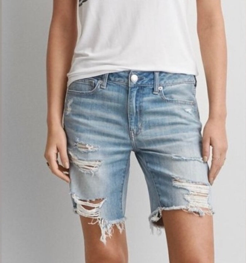 a light Wash Bermuda shorts with a high rise, baggy fit, and distressing.