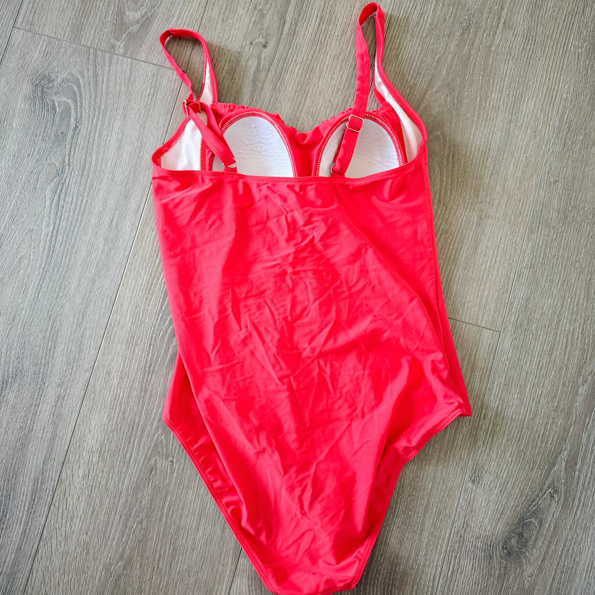 This swimsuit has tummy control paneling, with adjustable straps, built in padding, and full coverage bottoms. This is for the RED swimsuit only. Modeled photo shows how it look on.