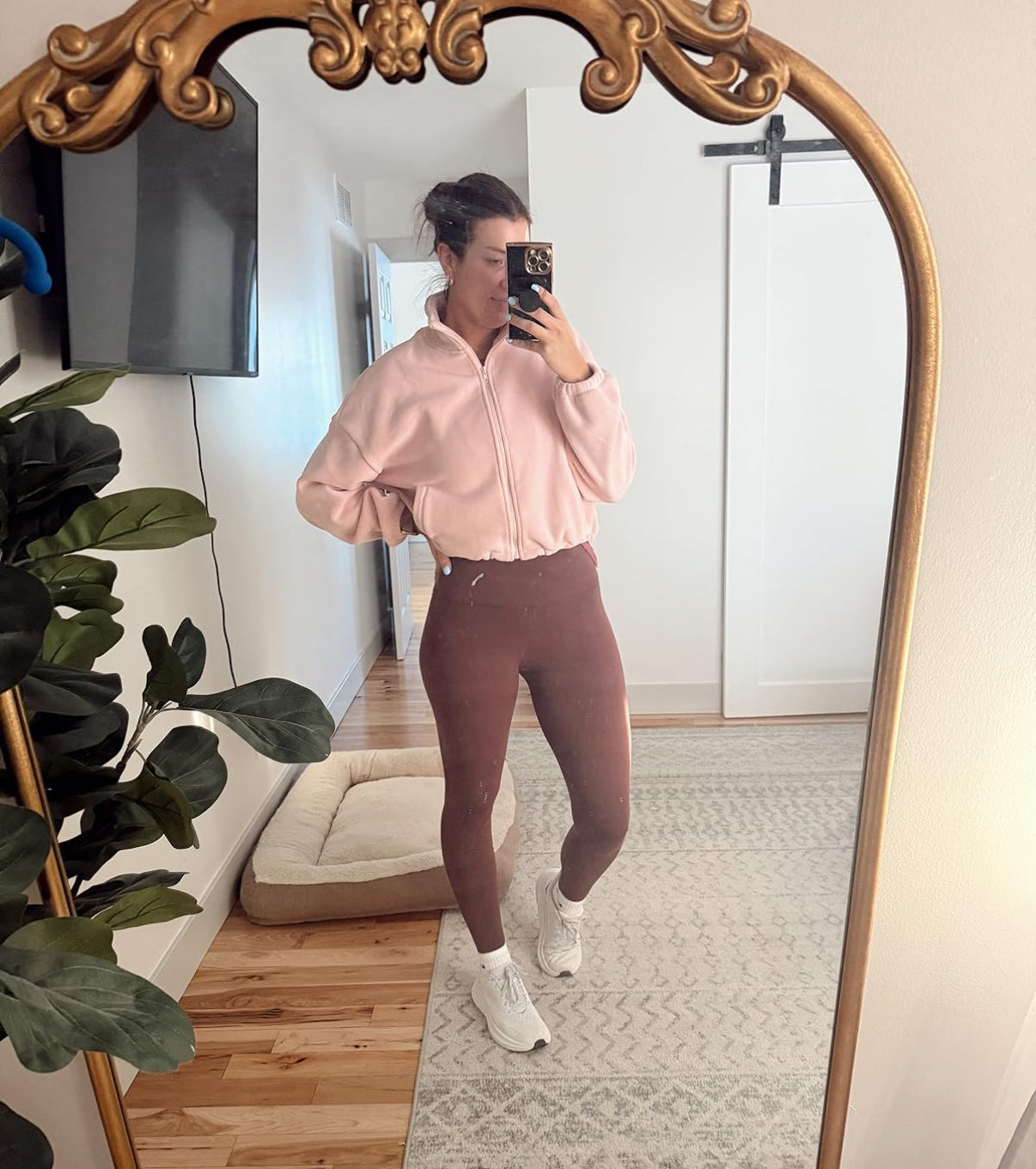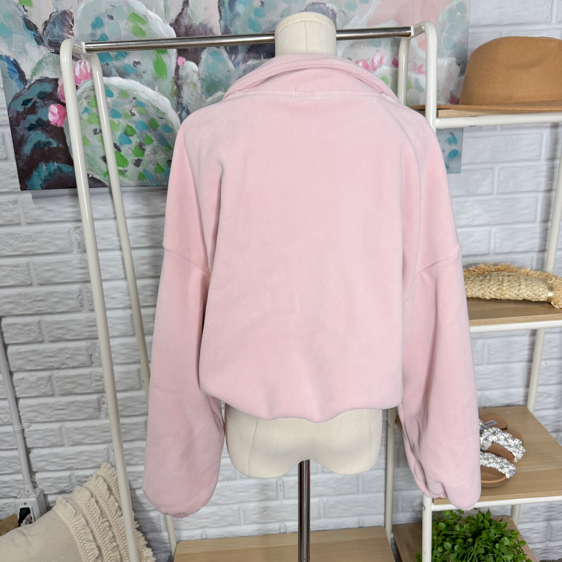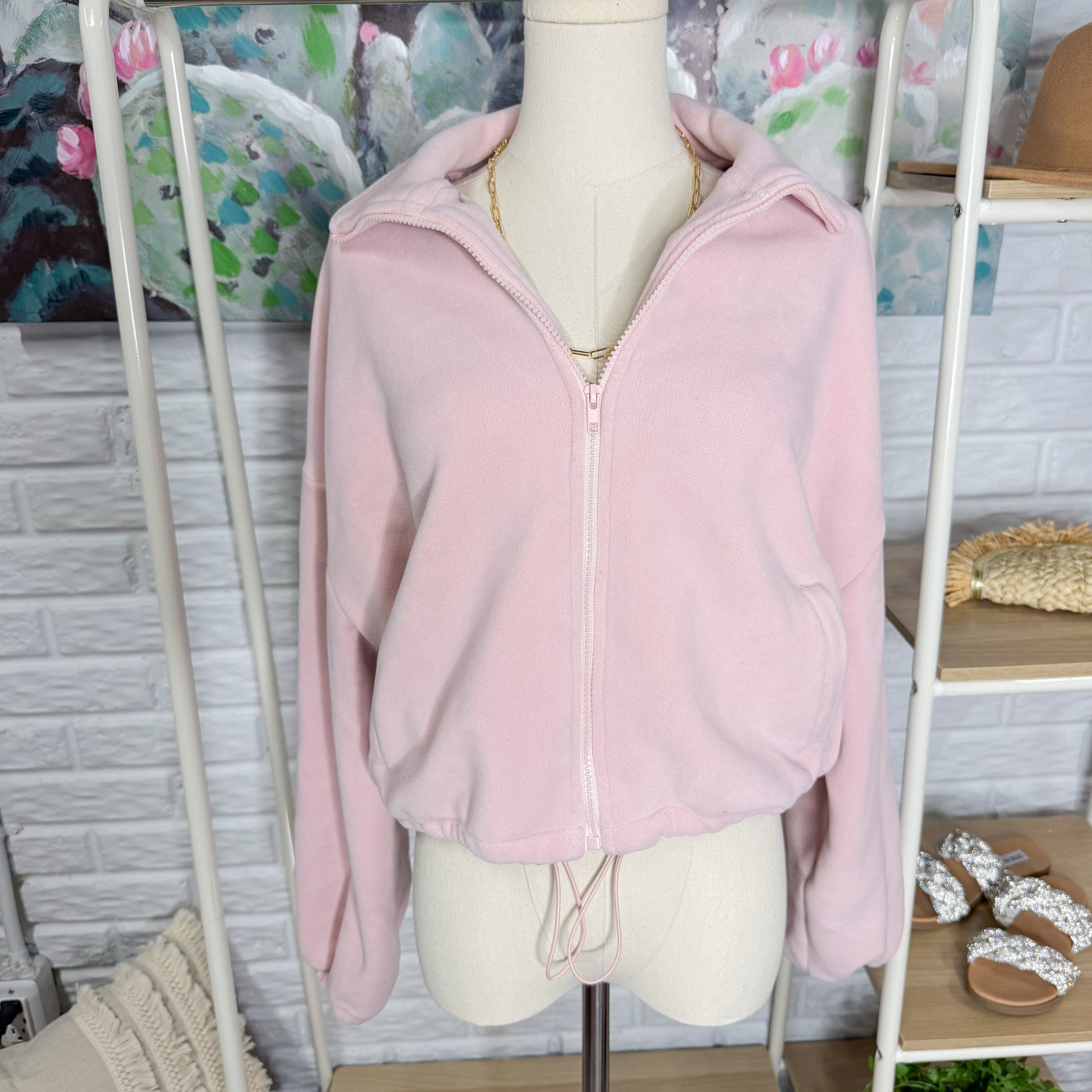 A pink extra soft fleece cropped zipper jacket with pockets.
