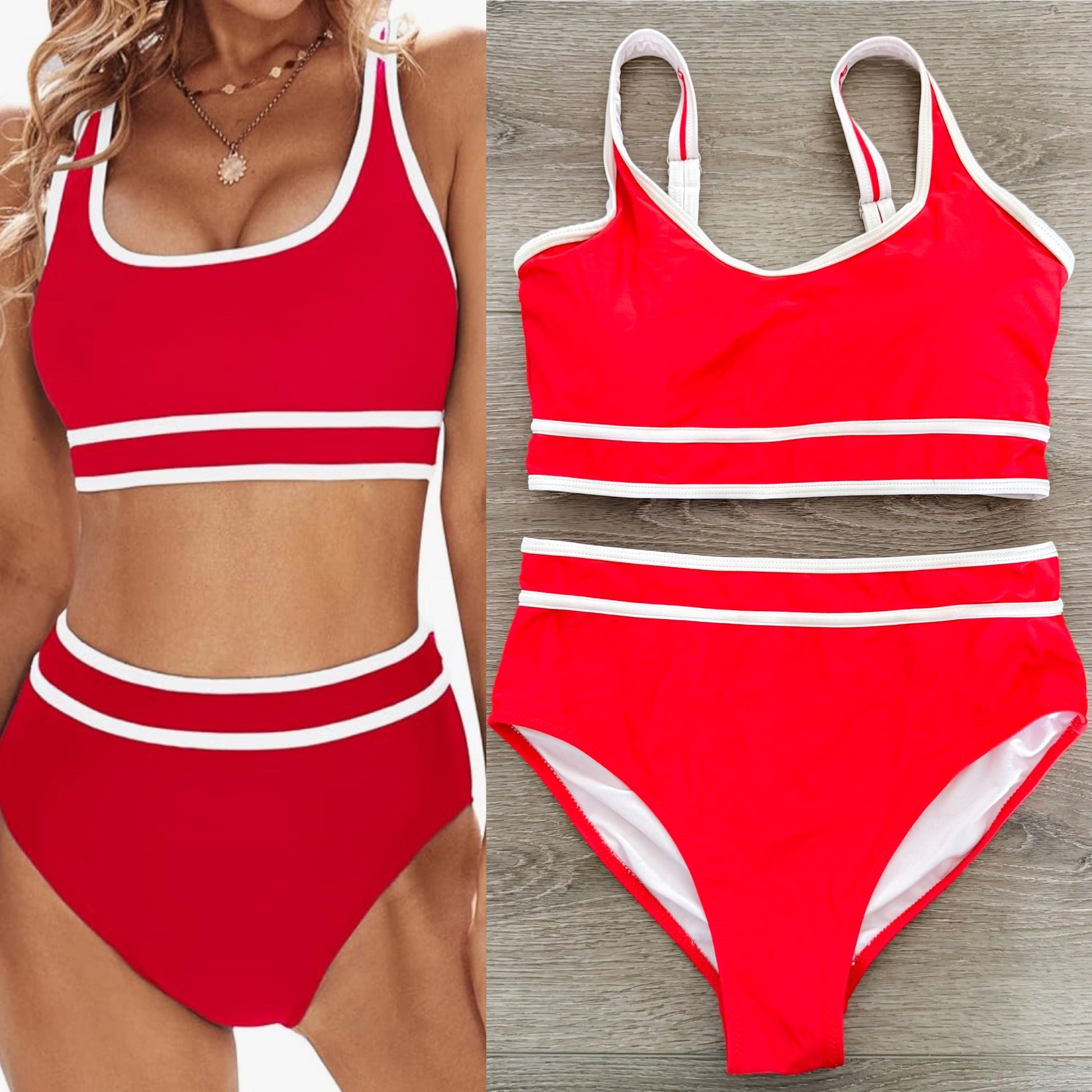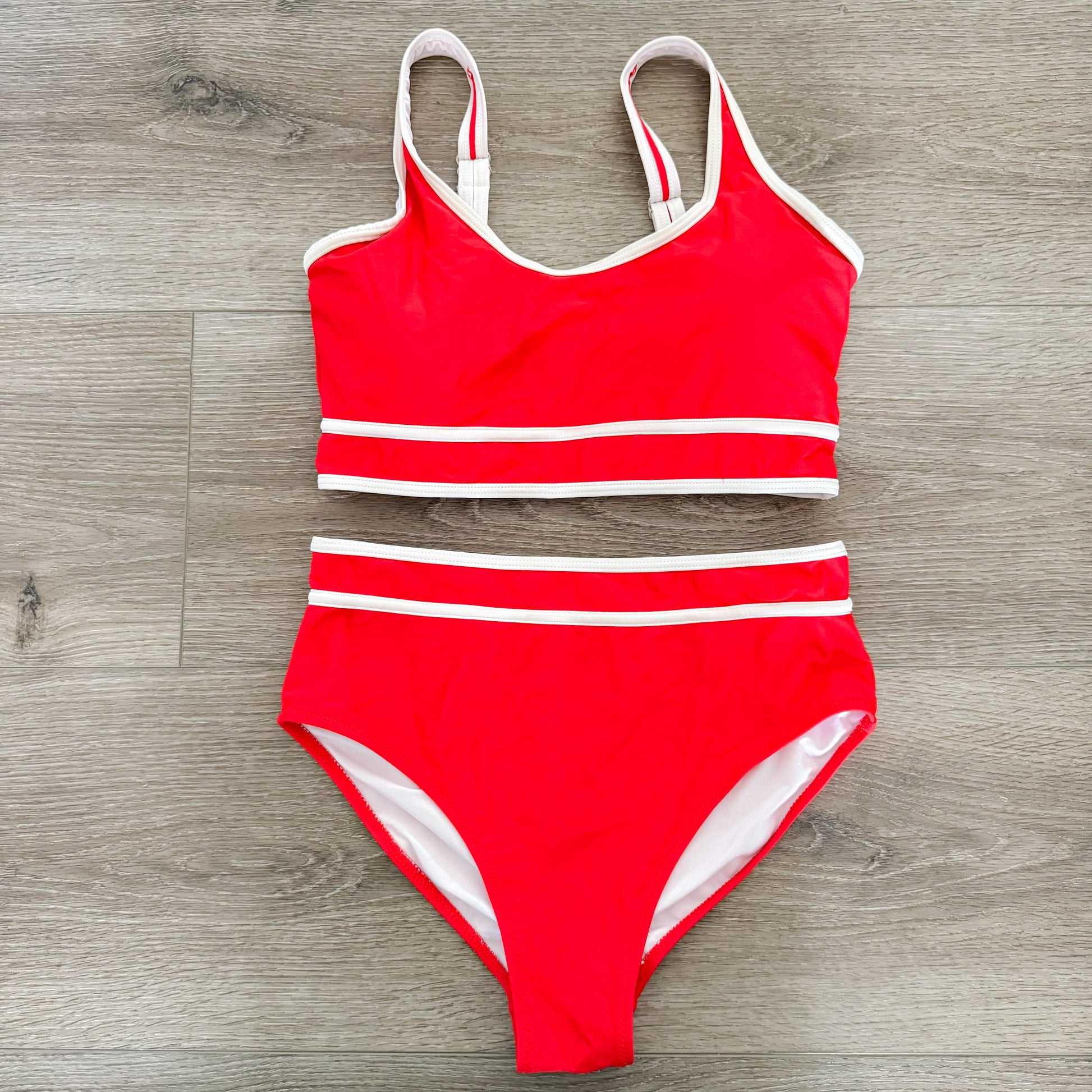 A red bikini in a white trim, with a high waisted bottom and sporty top.