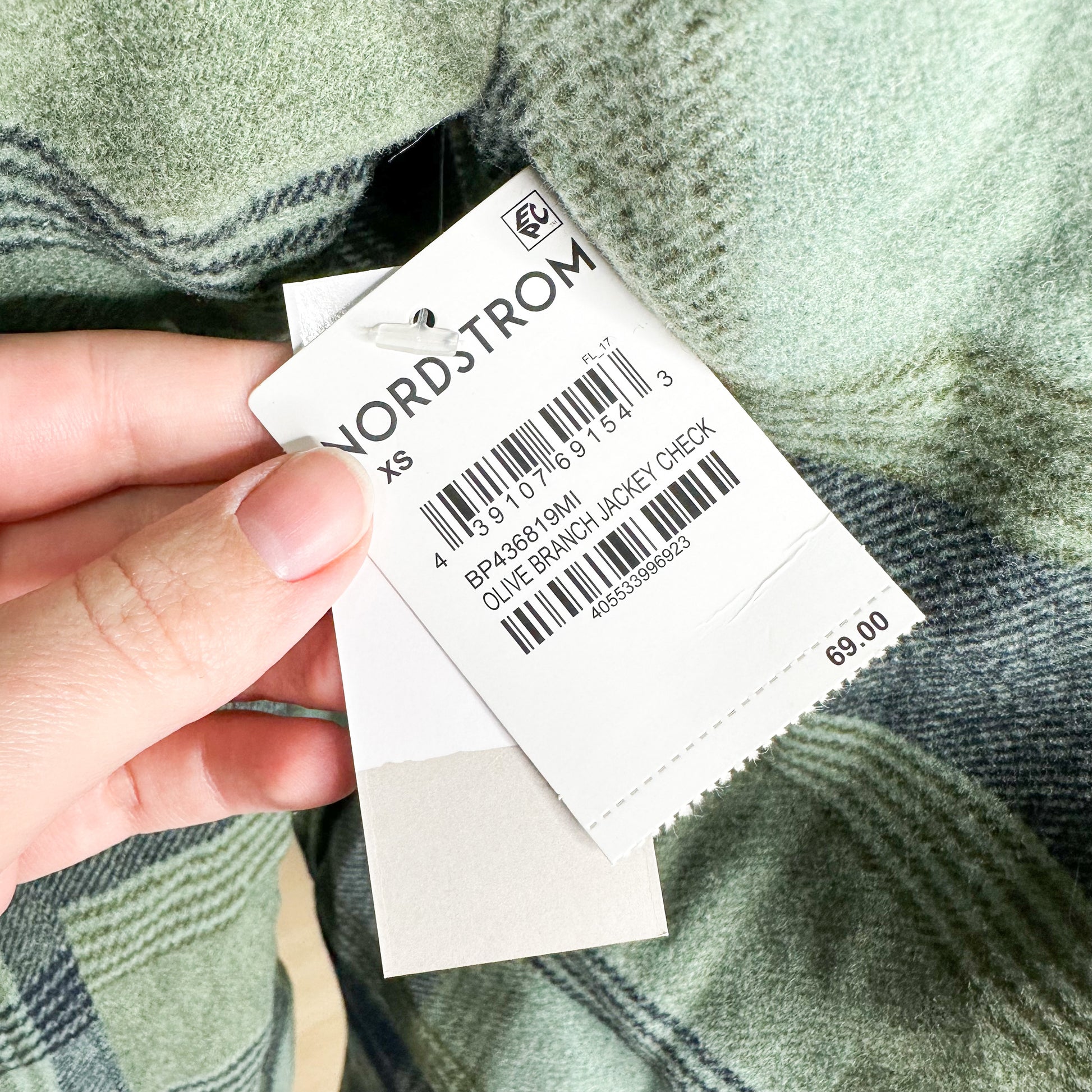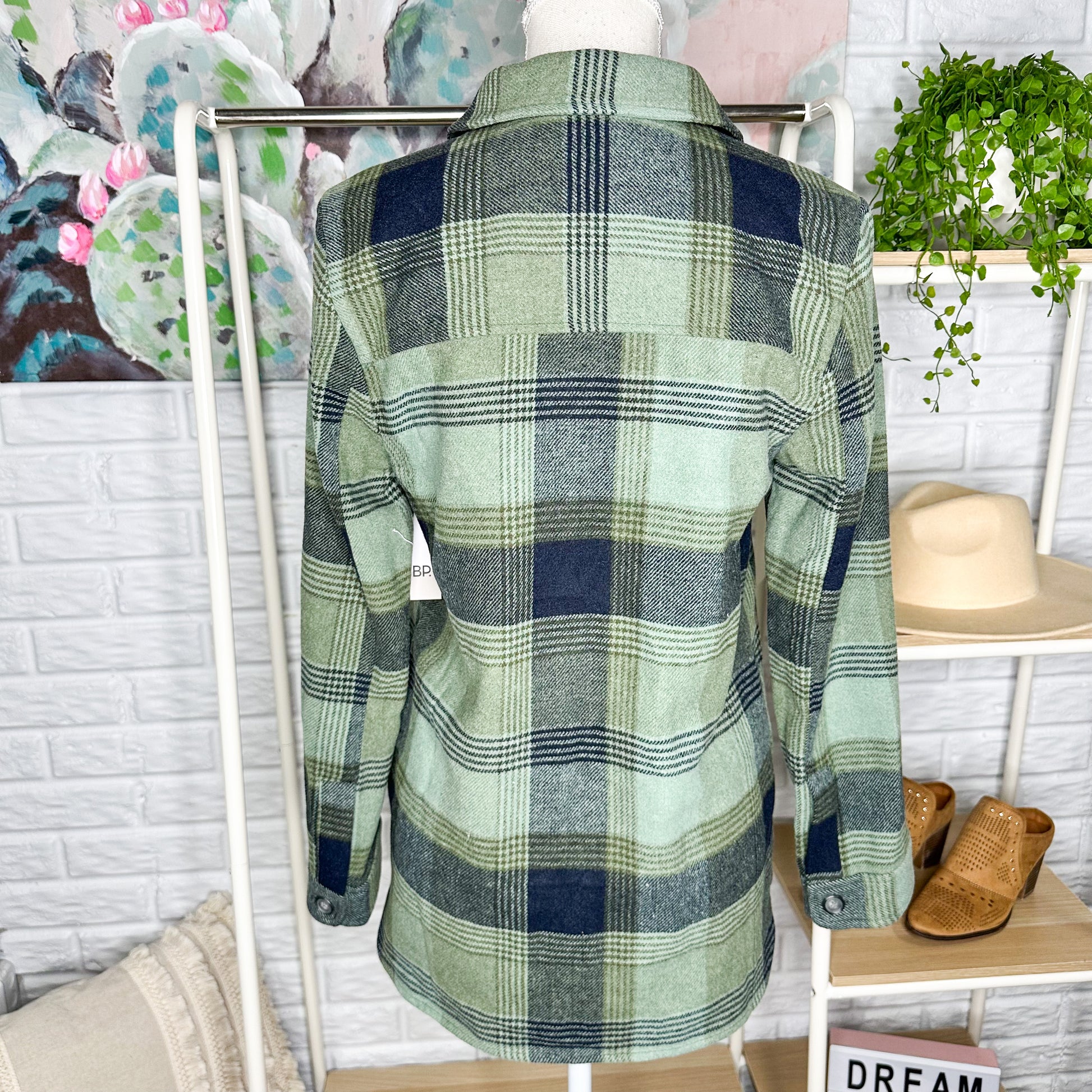 A Olive green plaid button down long sleeve top in “Olive green jackey check.”