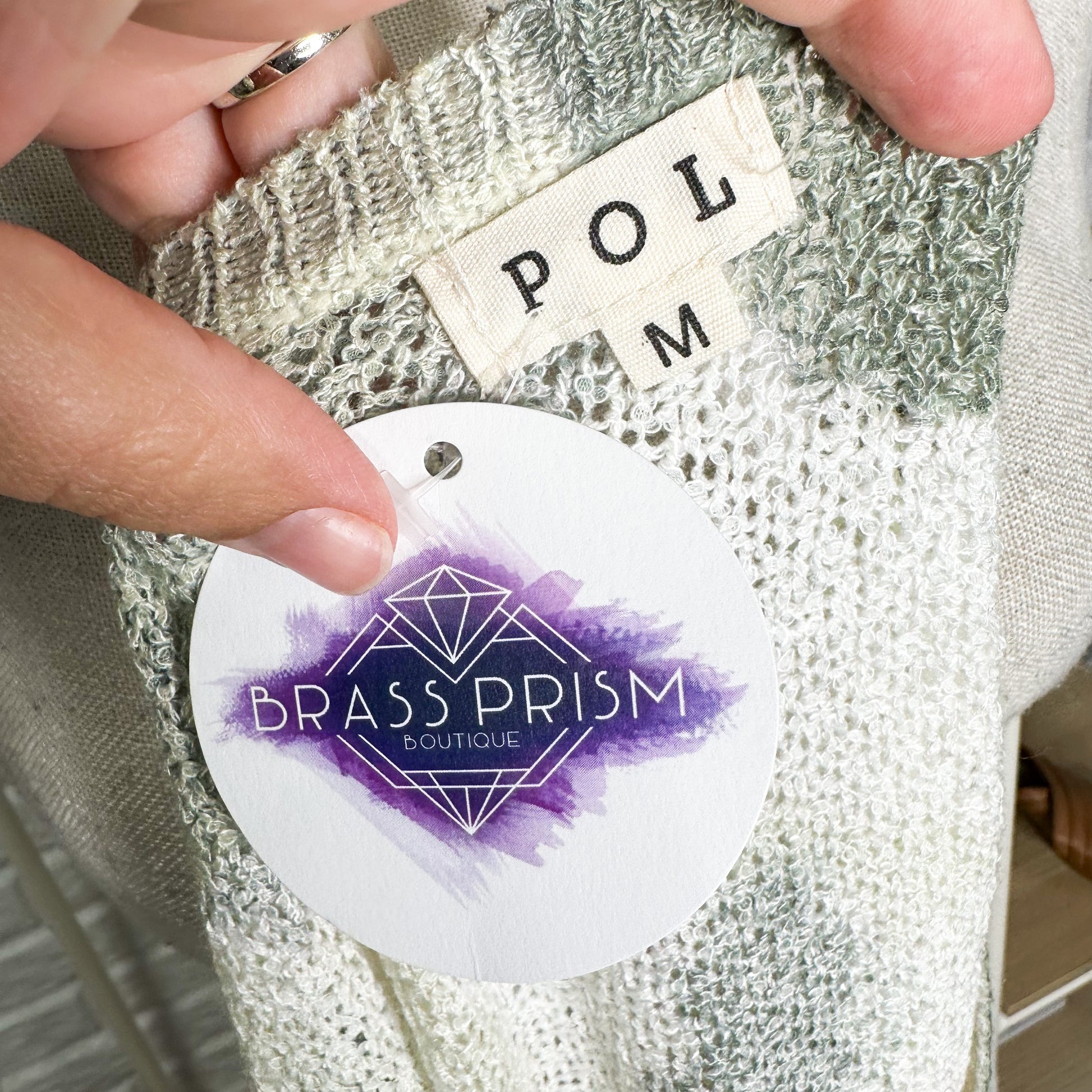 A Camo print top in green and ivory with a lightweight sheer knit material.