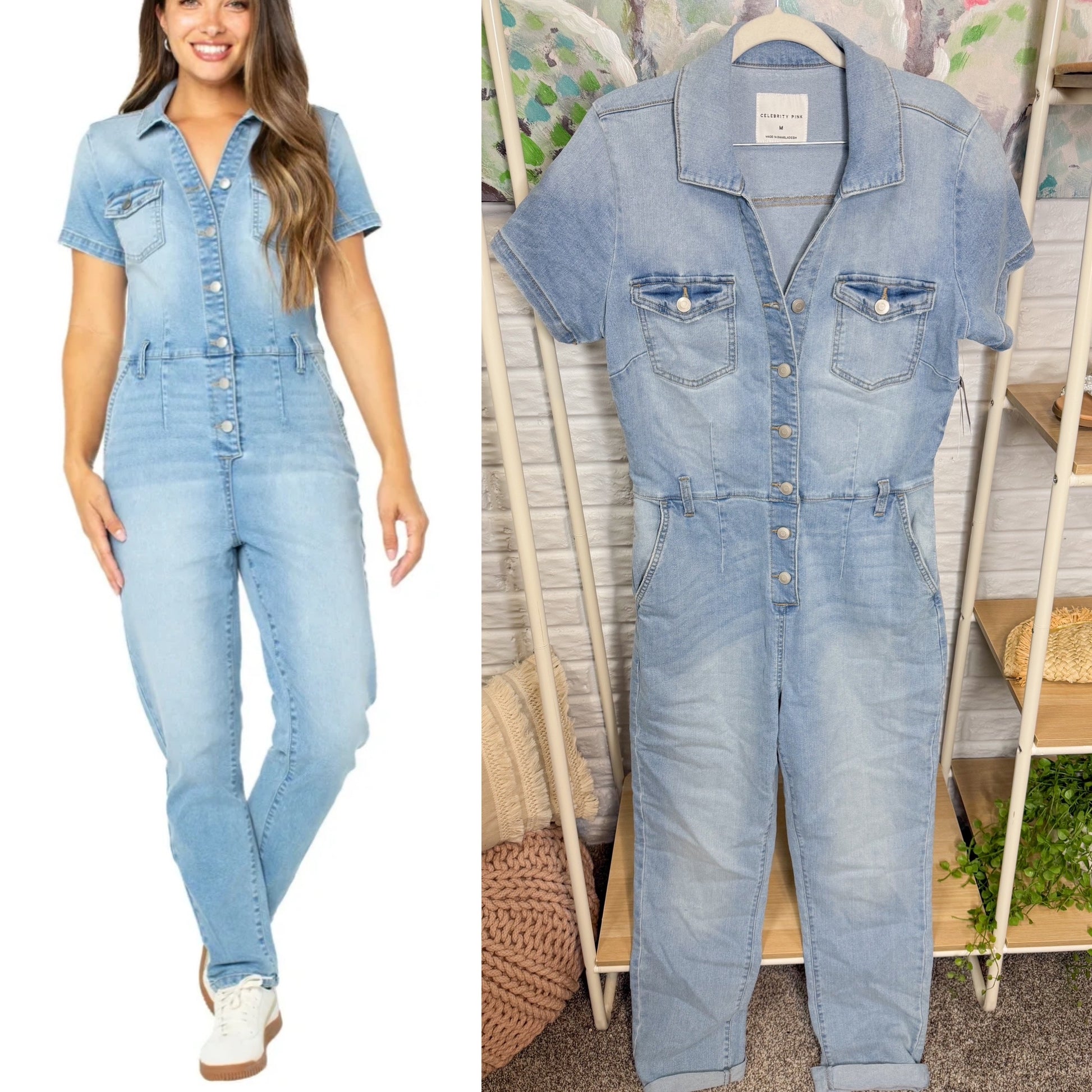 A light wash denim short sleeve jumpsuit with a slim fit leg and button front.
