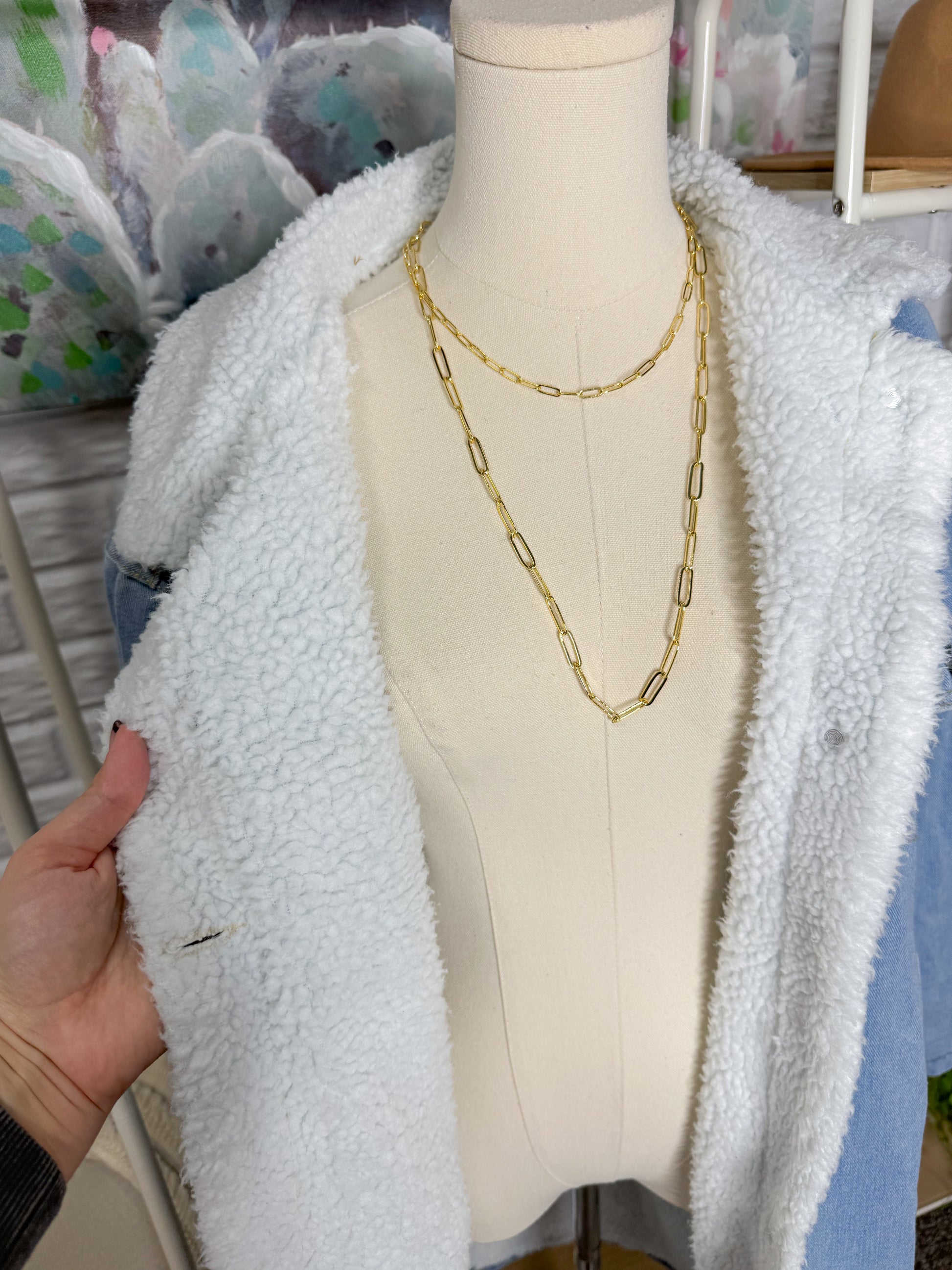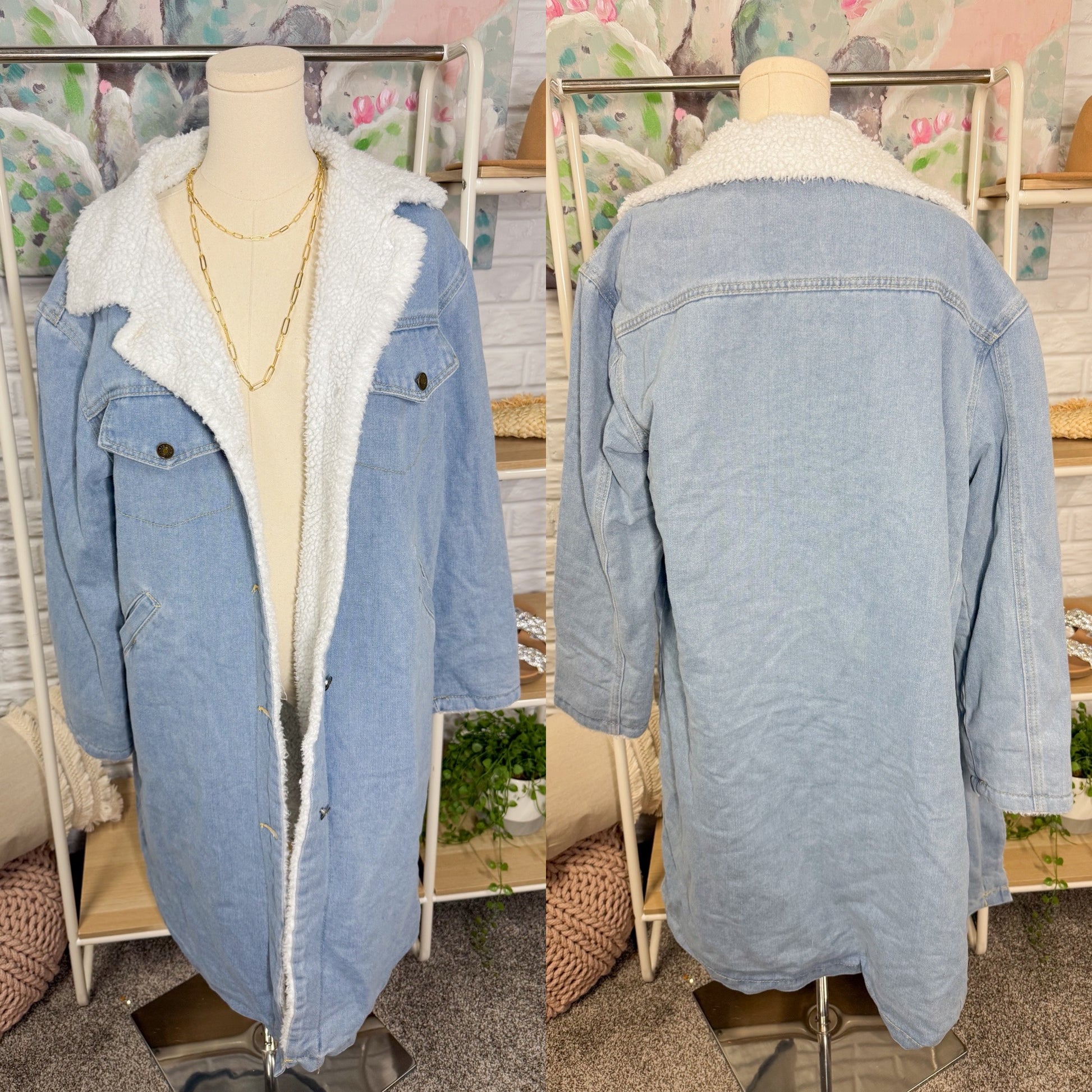 An oversized denim coat with an ivory Sherpa fleece collar and lining.
