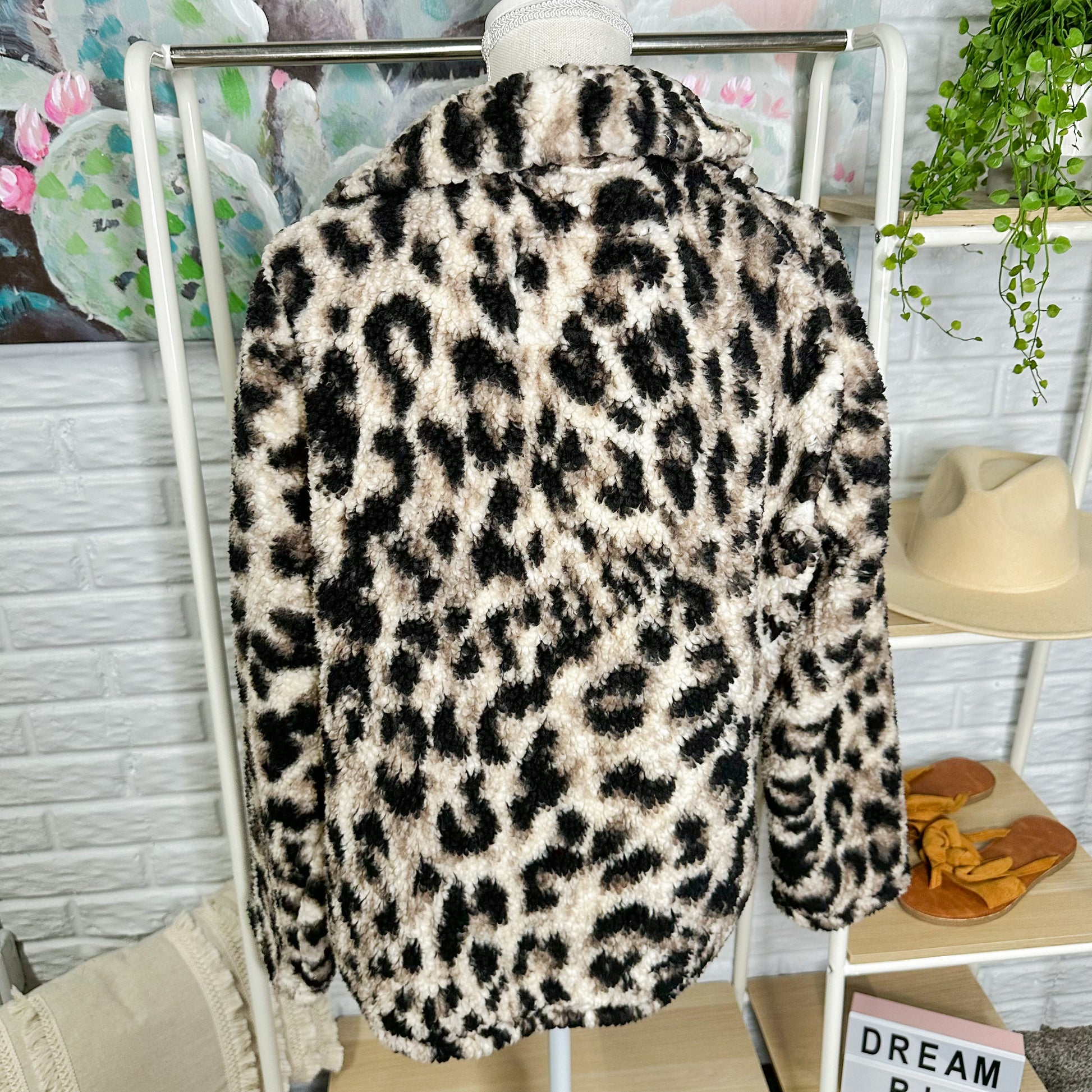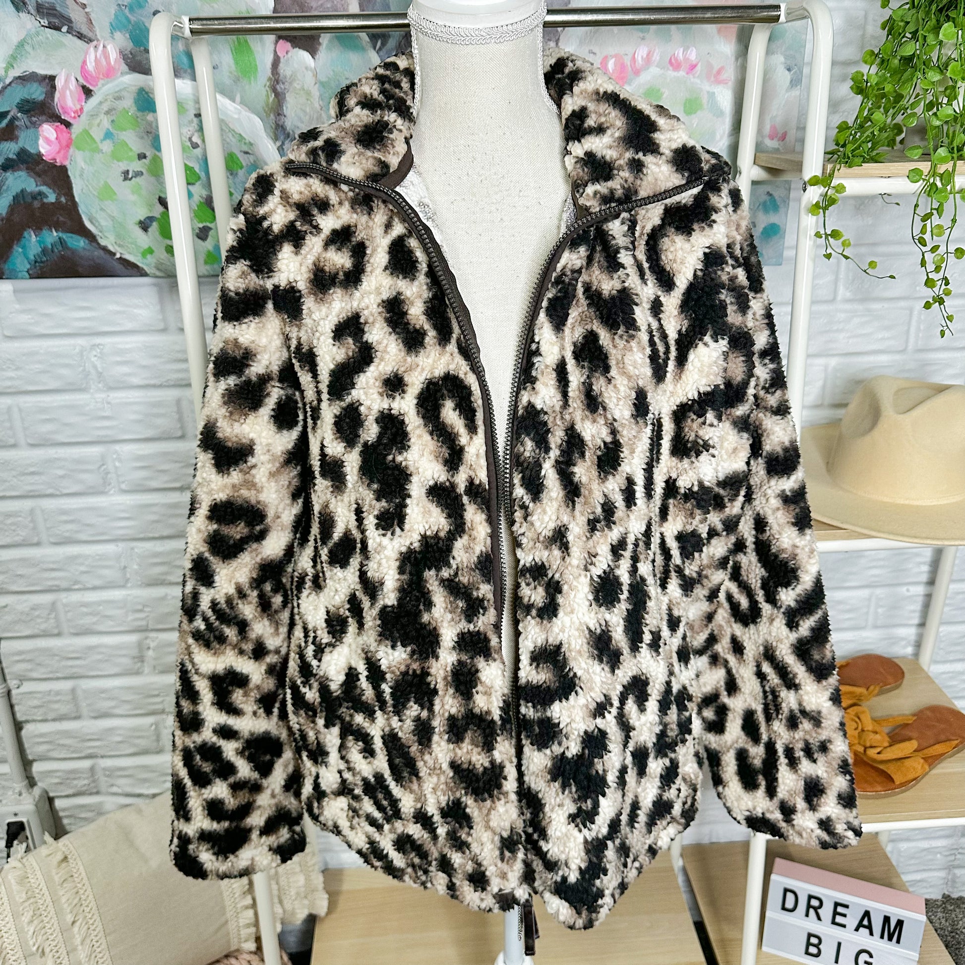 A cozy leopard animal print Sherpa jacket with a zipper front closure.