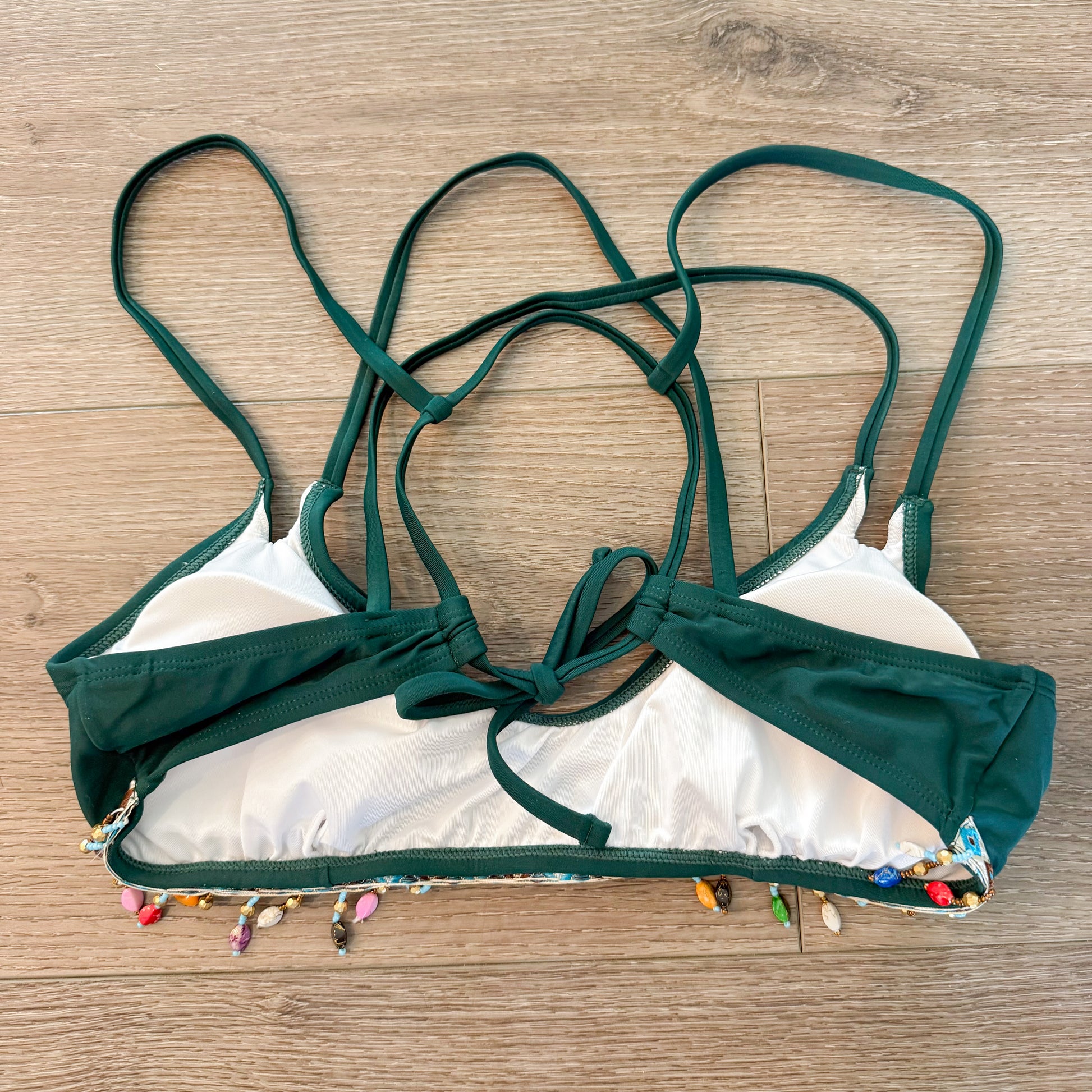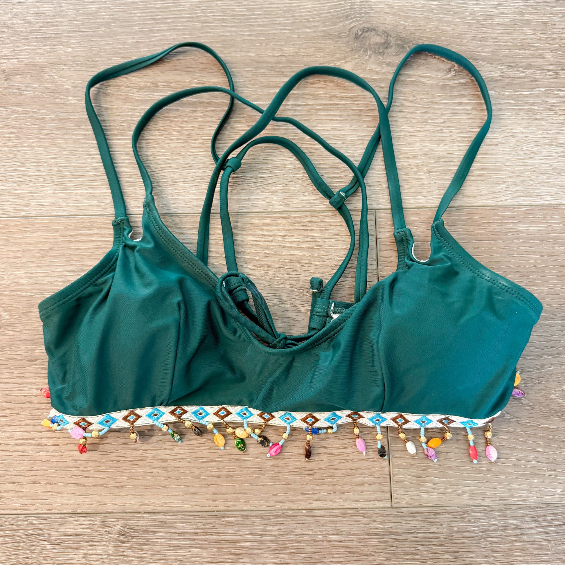 A green bikini set with a cheeky mid rise bottom and matching v neck top with beaded fringe hem and double shoulder straps. Criss cross adjustable tie back.