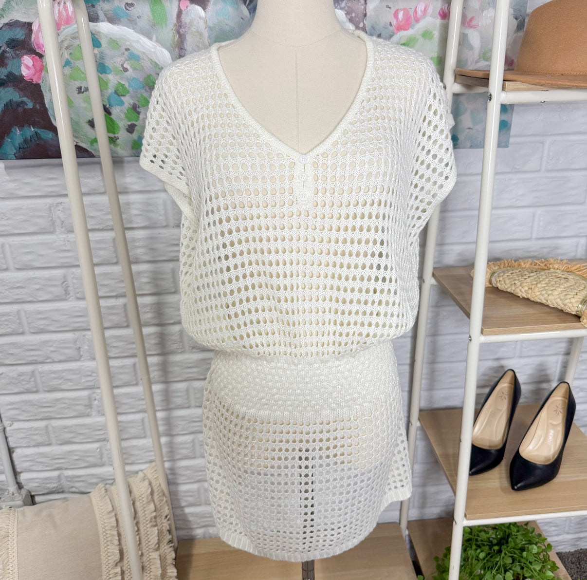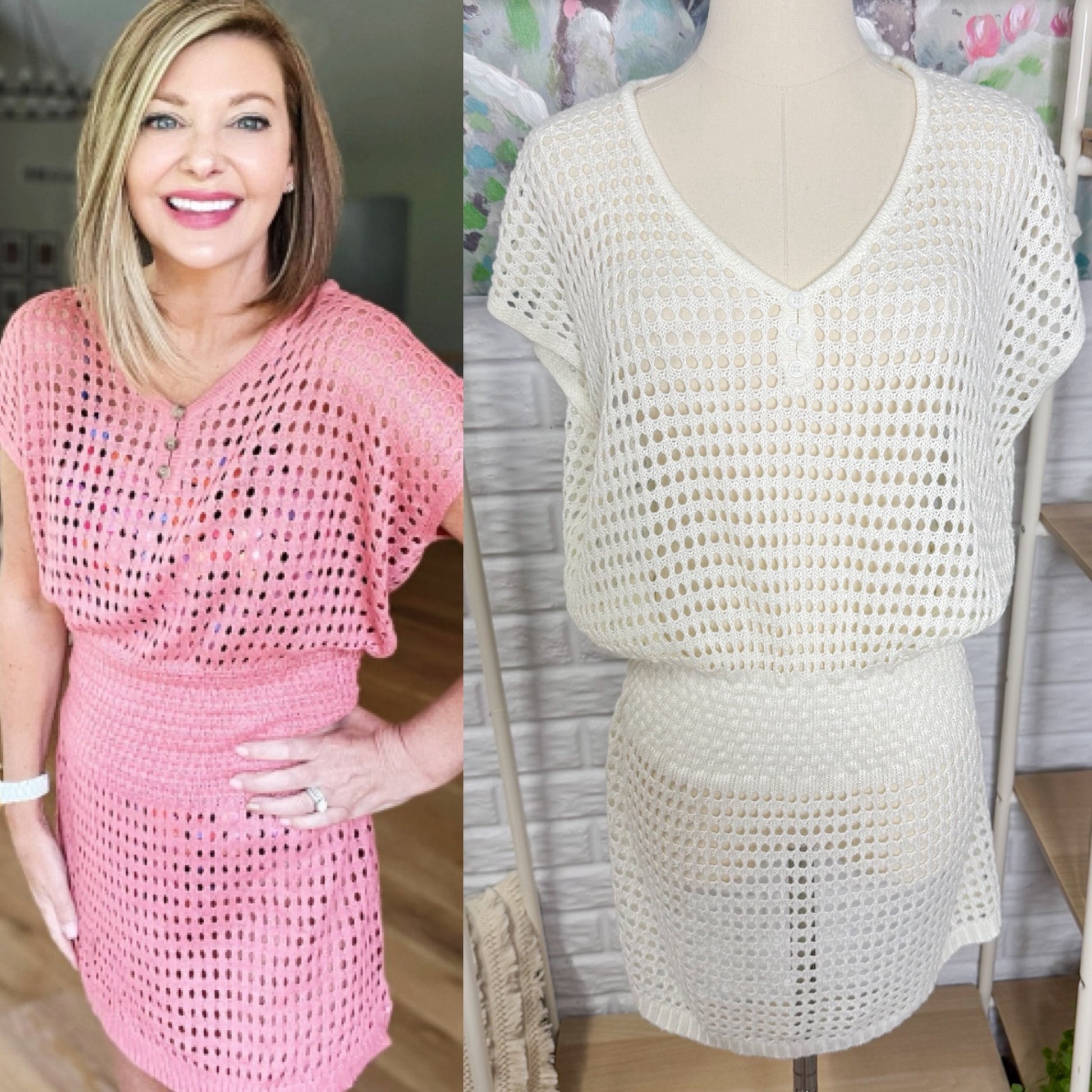 A ivory/white mesh breathable short sleeve coverup dress with button details and a smocked elastic waist.