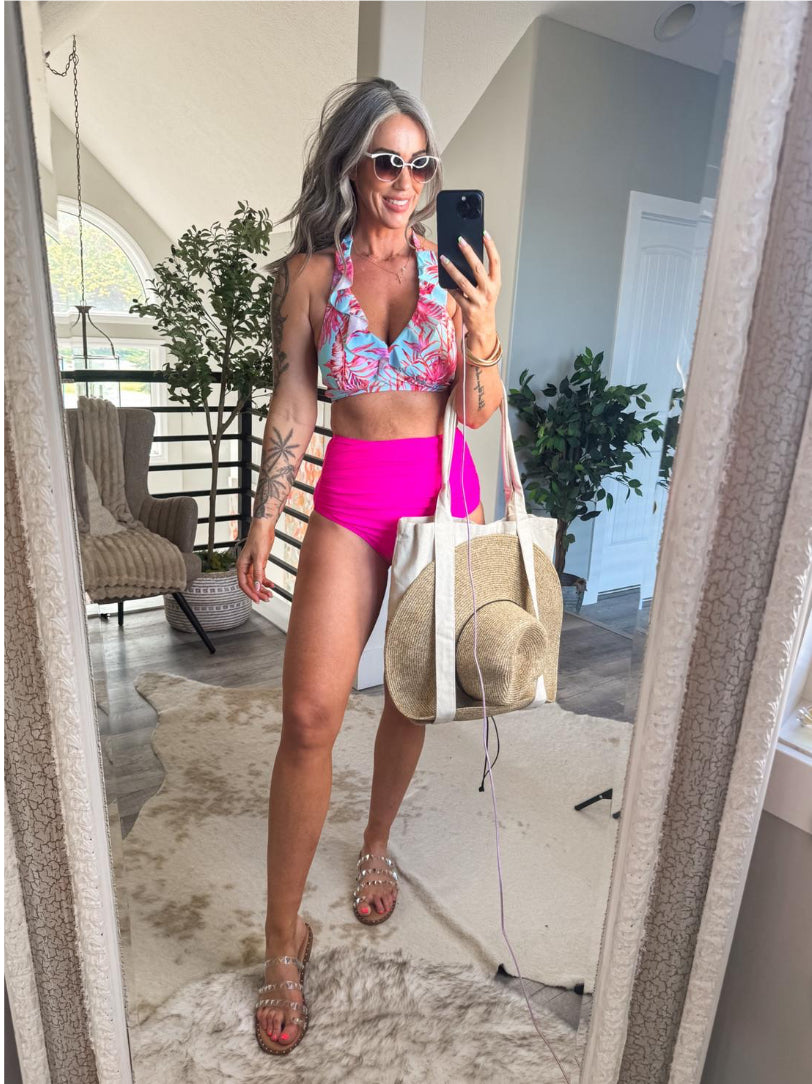 A bright pink bikini set with a ruffle v neck time with a halter tie and matching high rise bottoms.