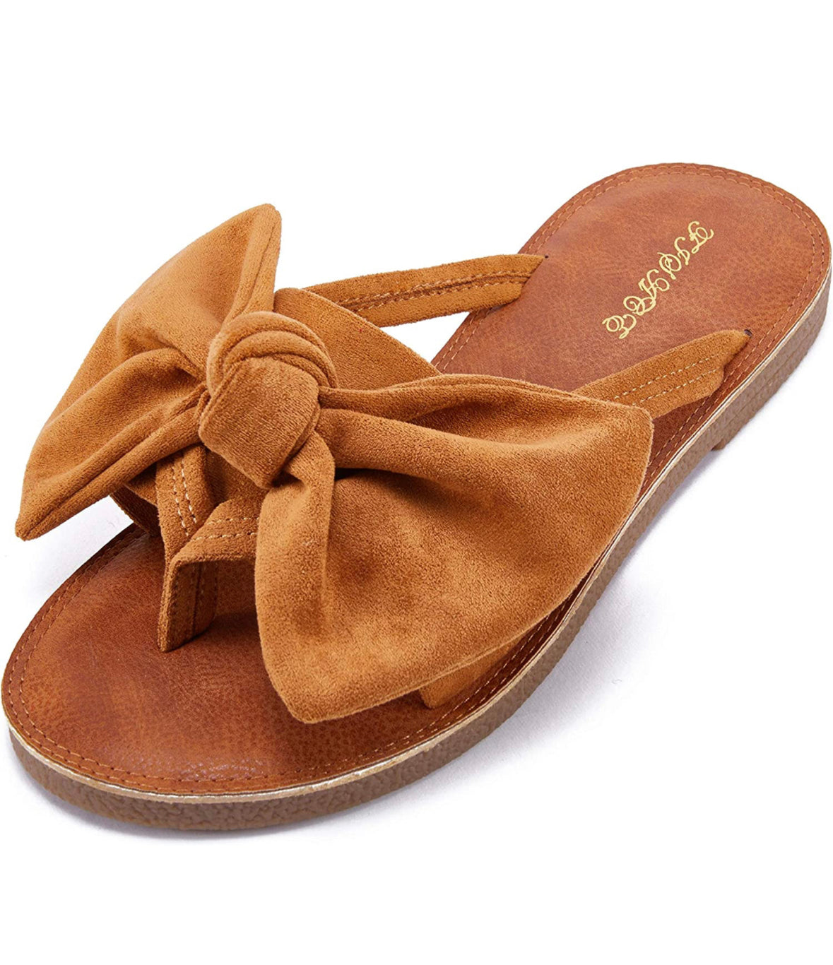 A tan brown flat sandal with a toe thong and bow faux suede accent.