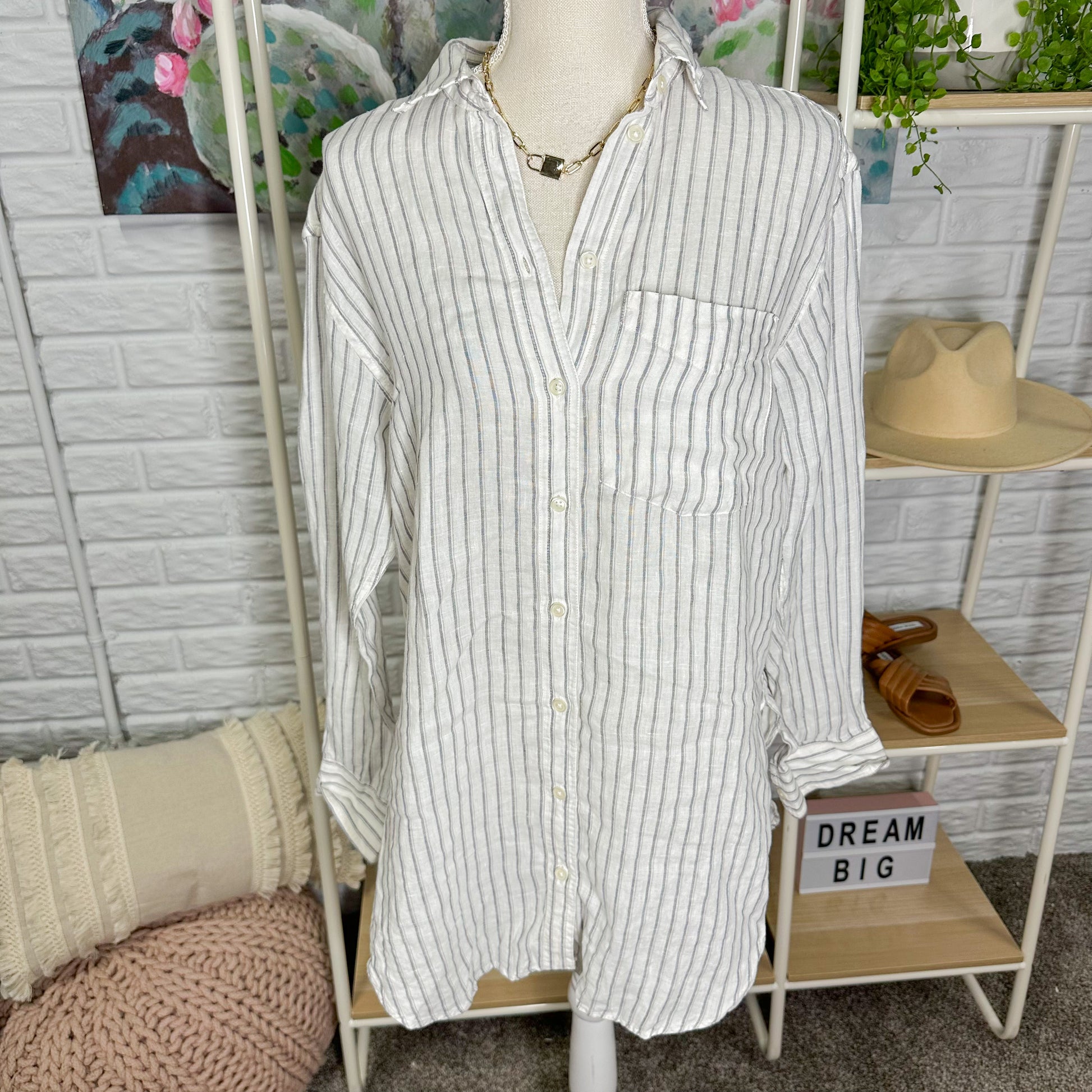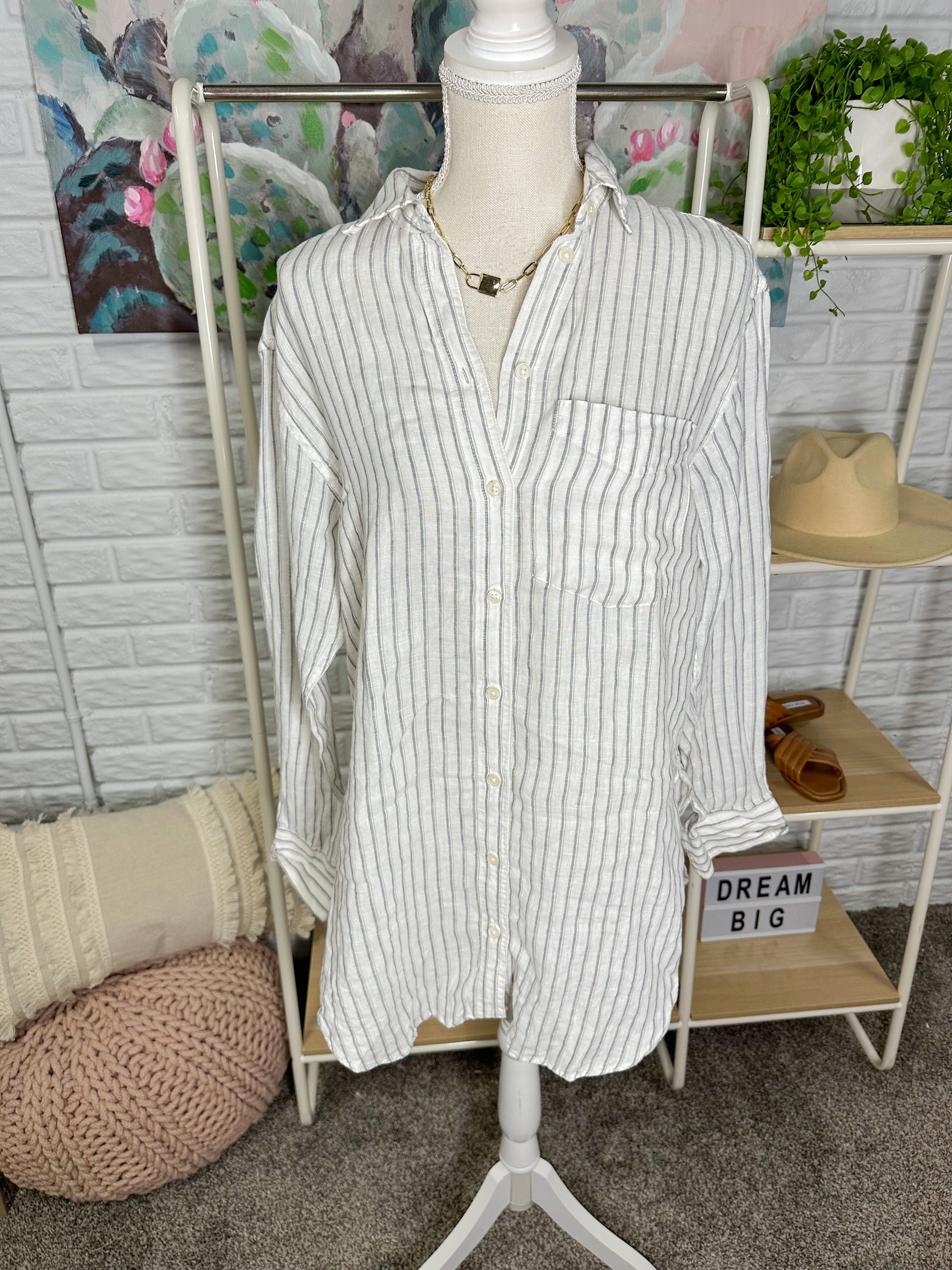 An oversized button down long sleeve linen top with a chest pocket and grey and white stripes.