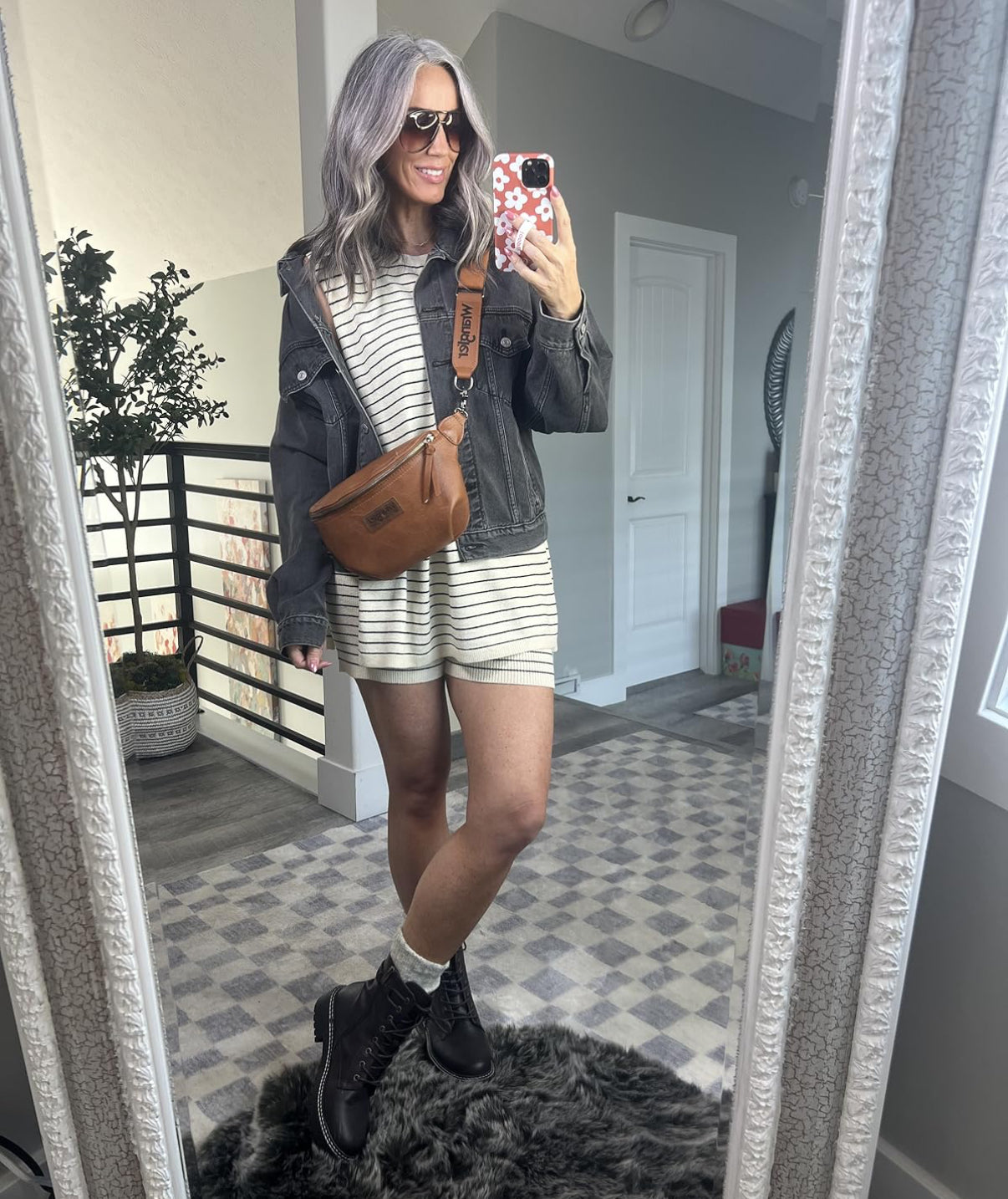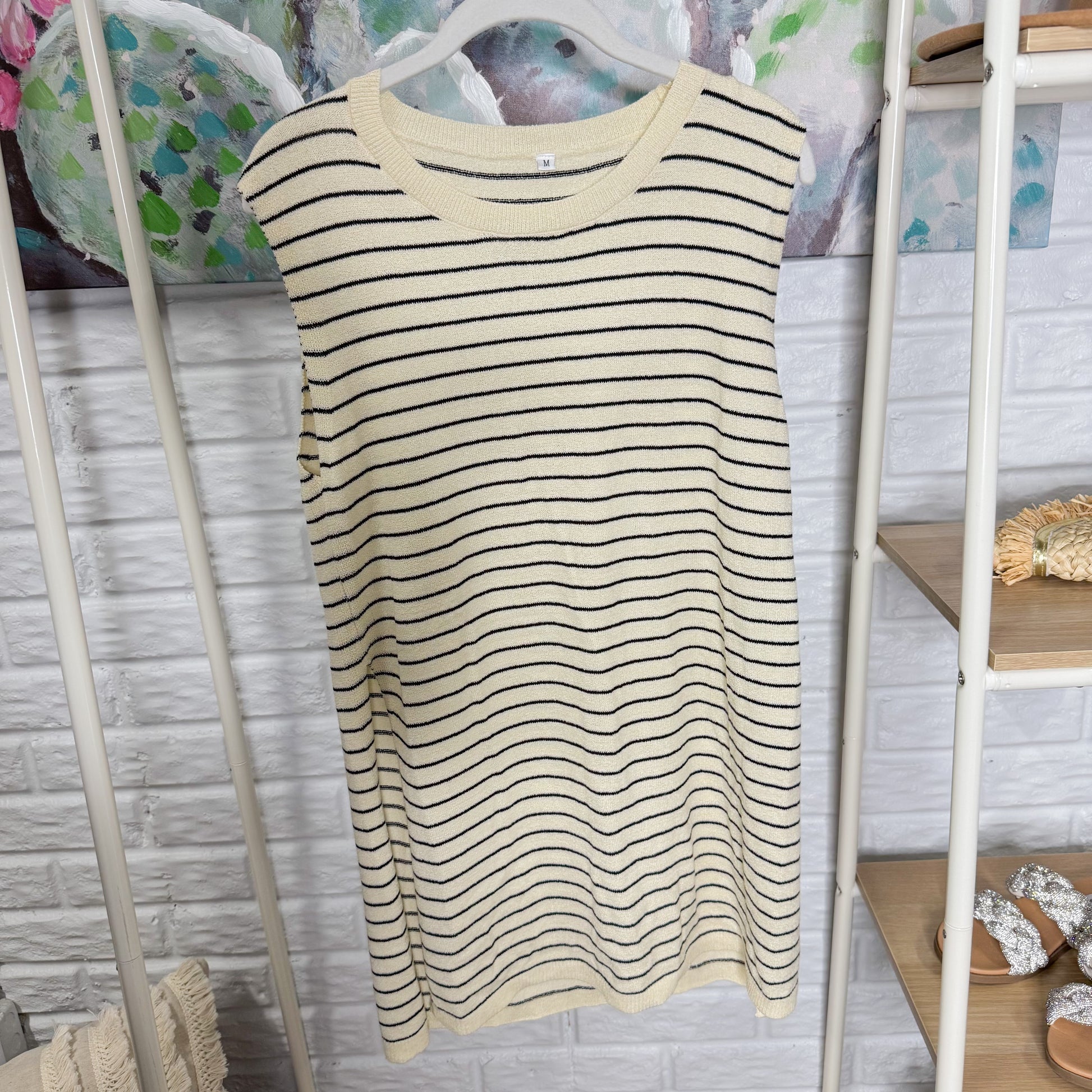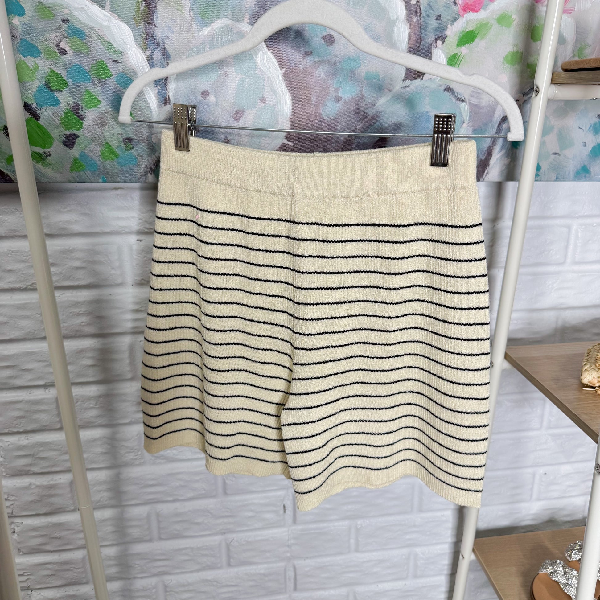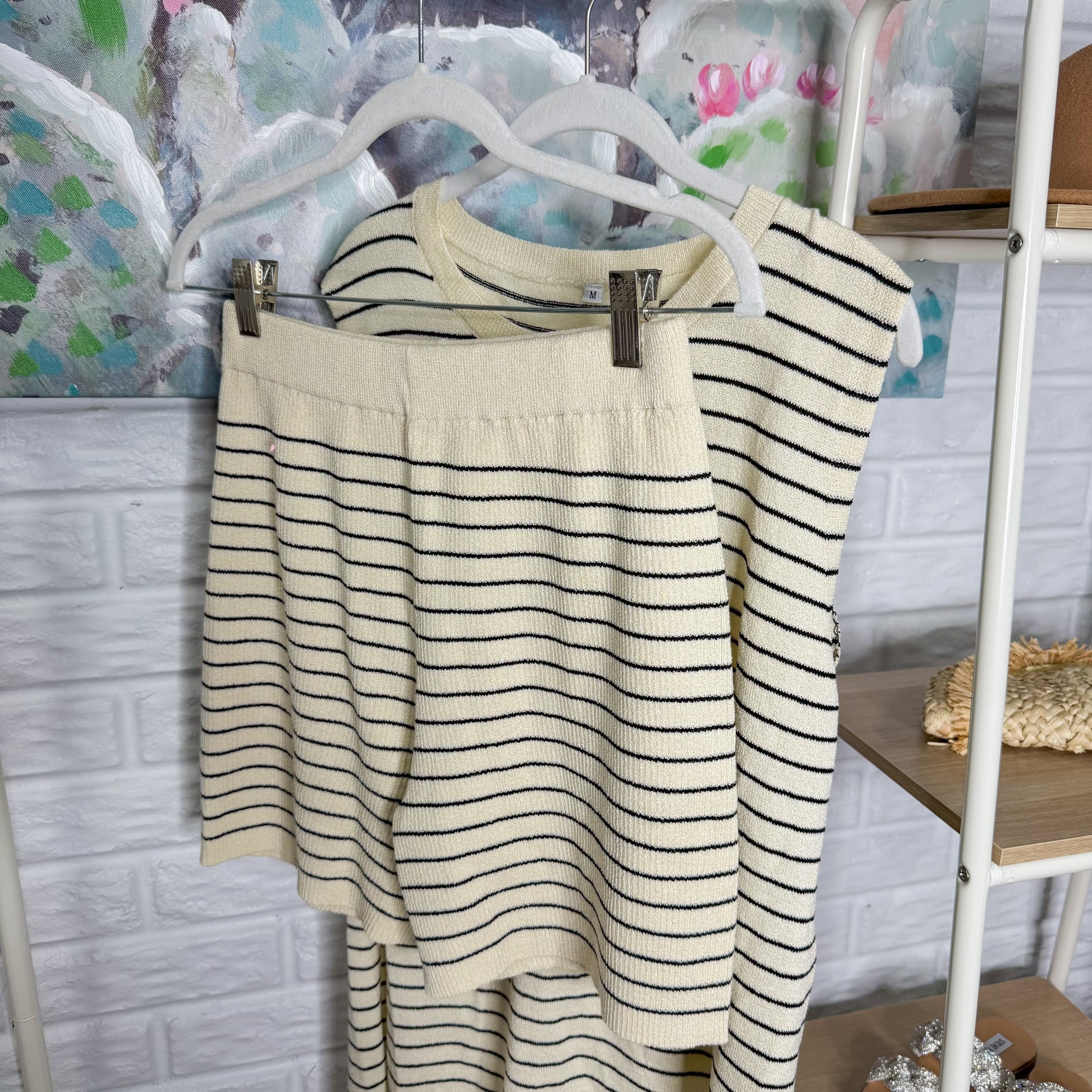 A cream striped top and short set with a sleeveless top with a side slit and matching shorts.