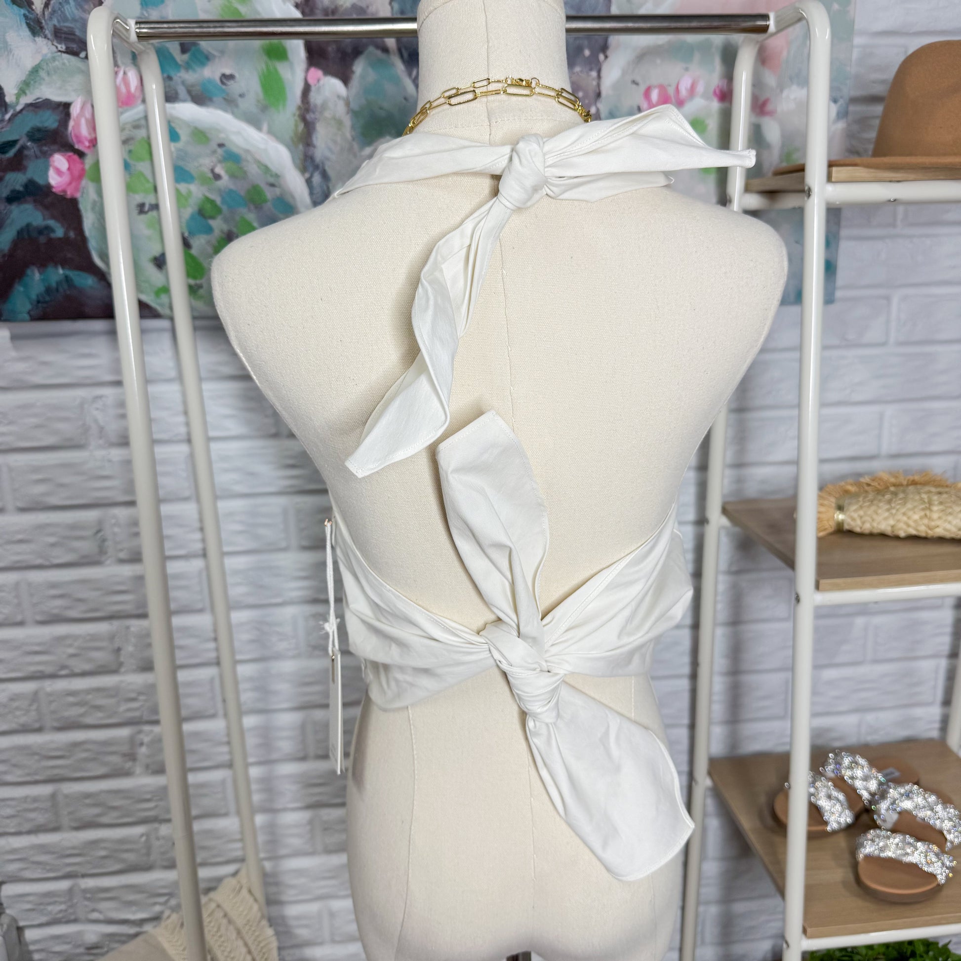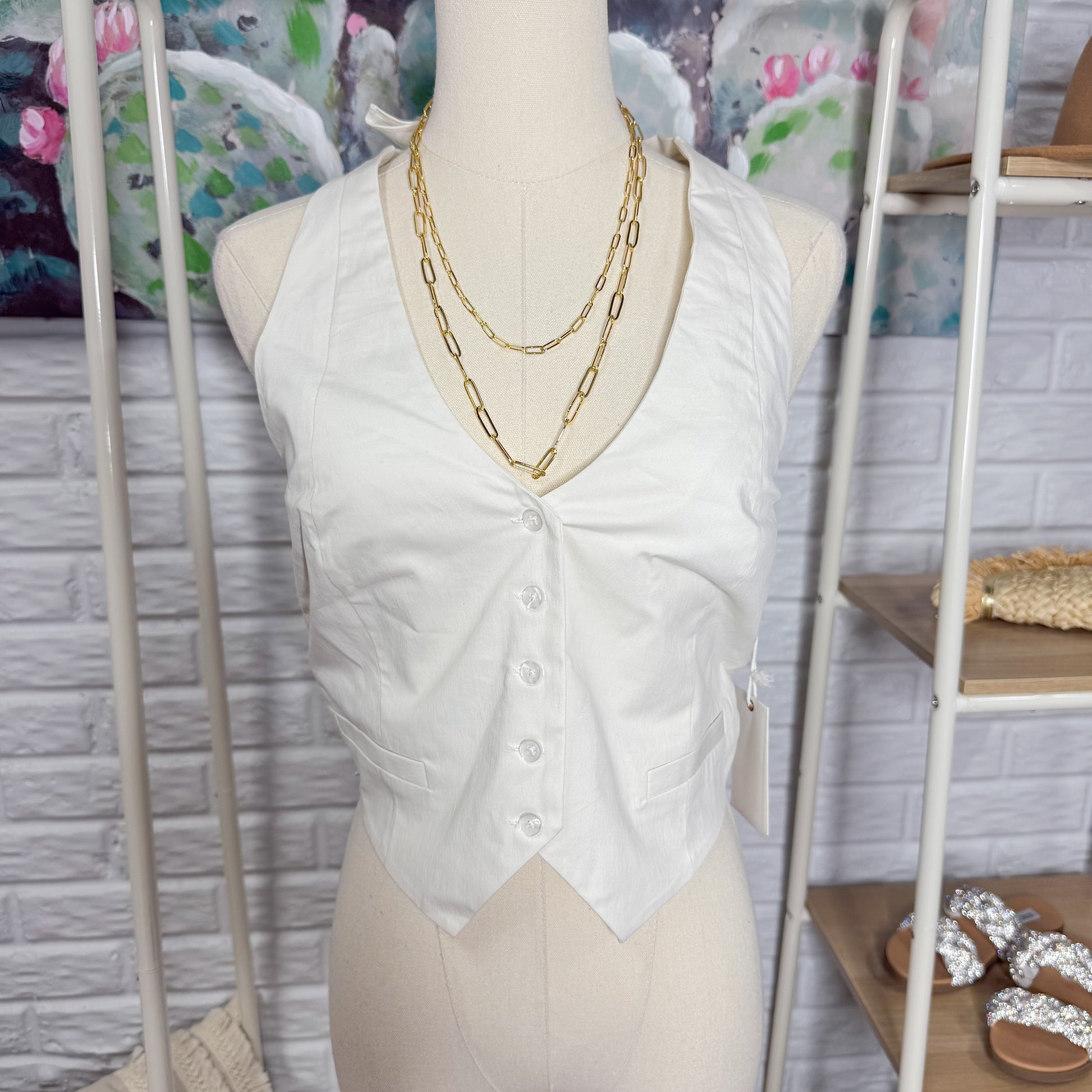 A fitted white vest with an adjustable tie halter strap and bust strap.