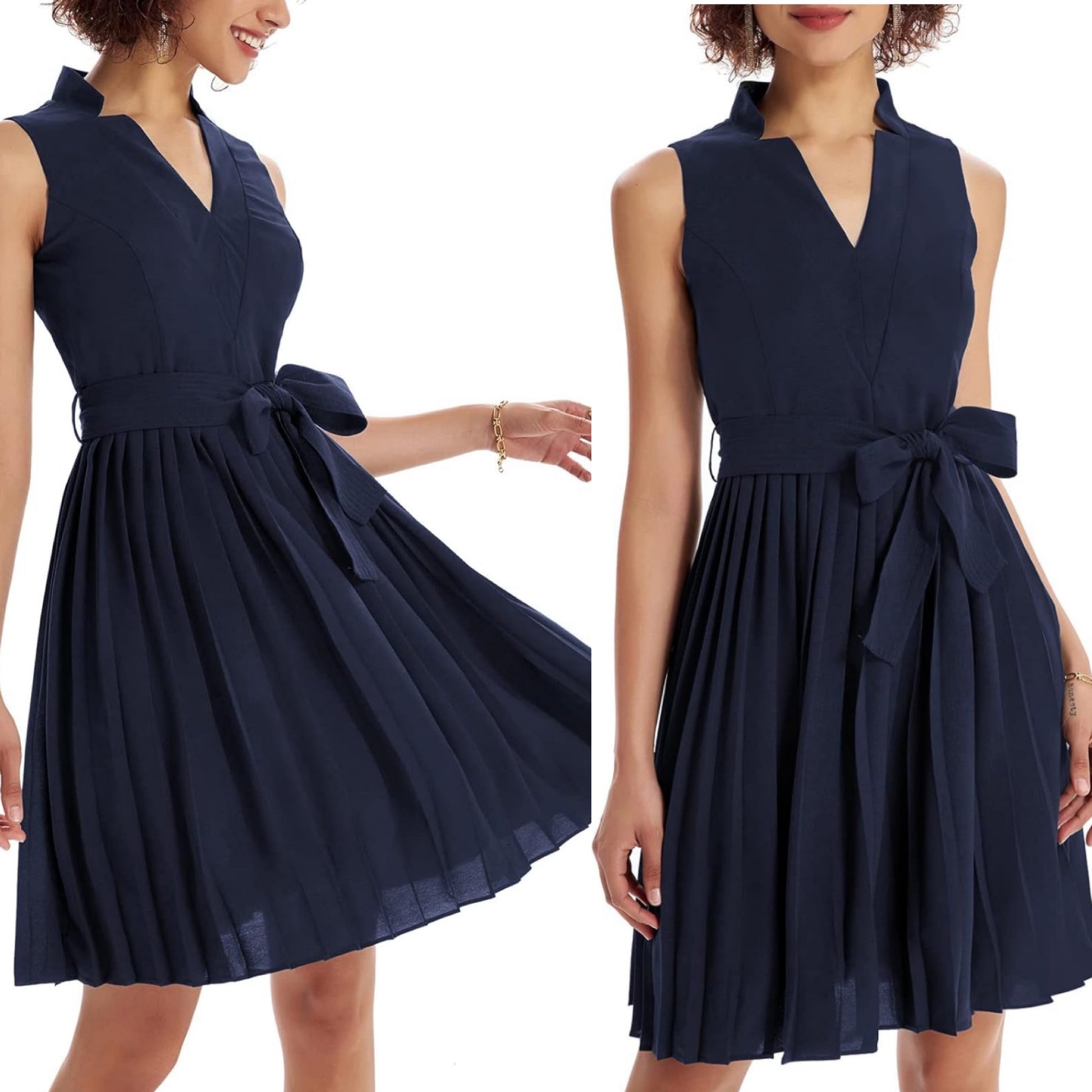 A navy blue pleated swing mini dress with a sash tie waist.