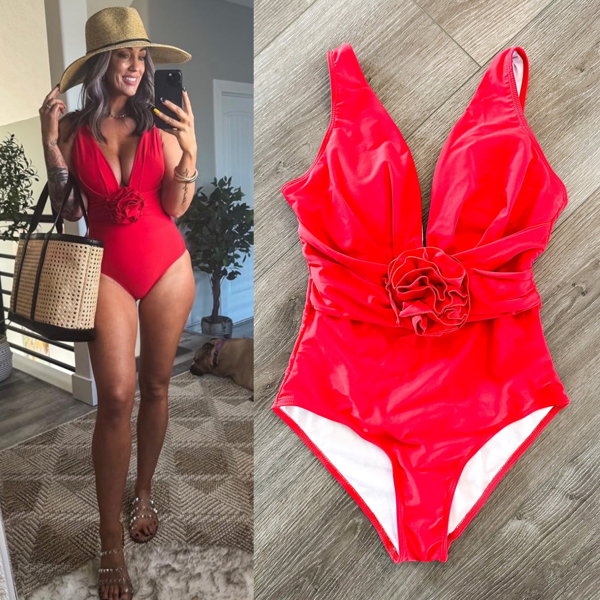 A red one piece swimsuit with a flower waist accent, deep v neckline, and full coverage bottom.