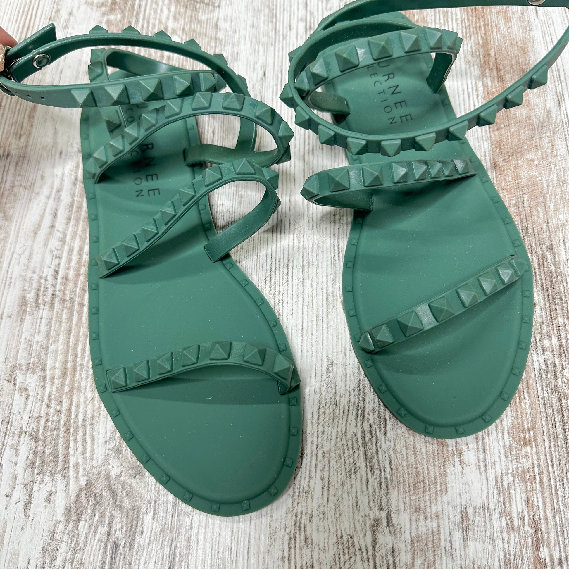 A green solid jelly sandal with studs, round open toe, and adjustable ankle strap.
