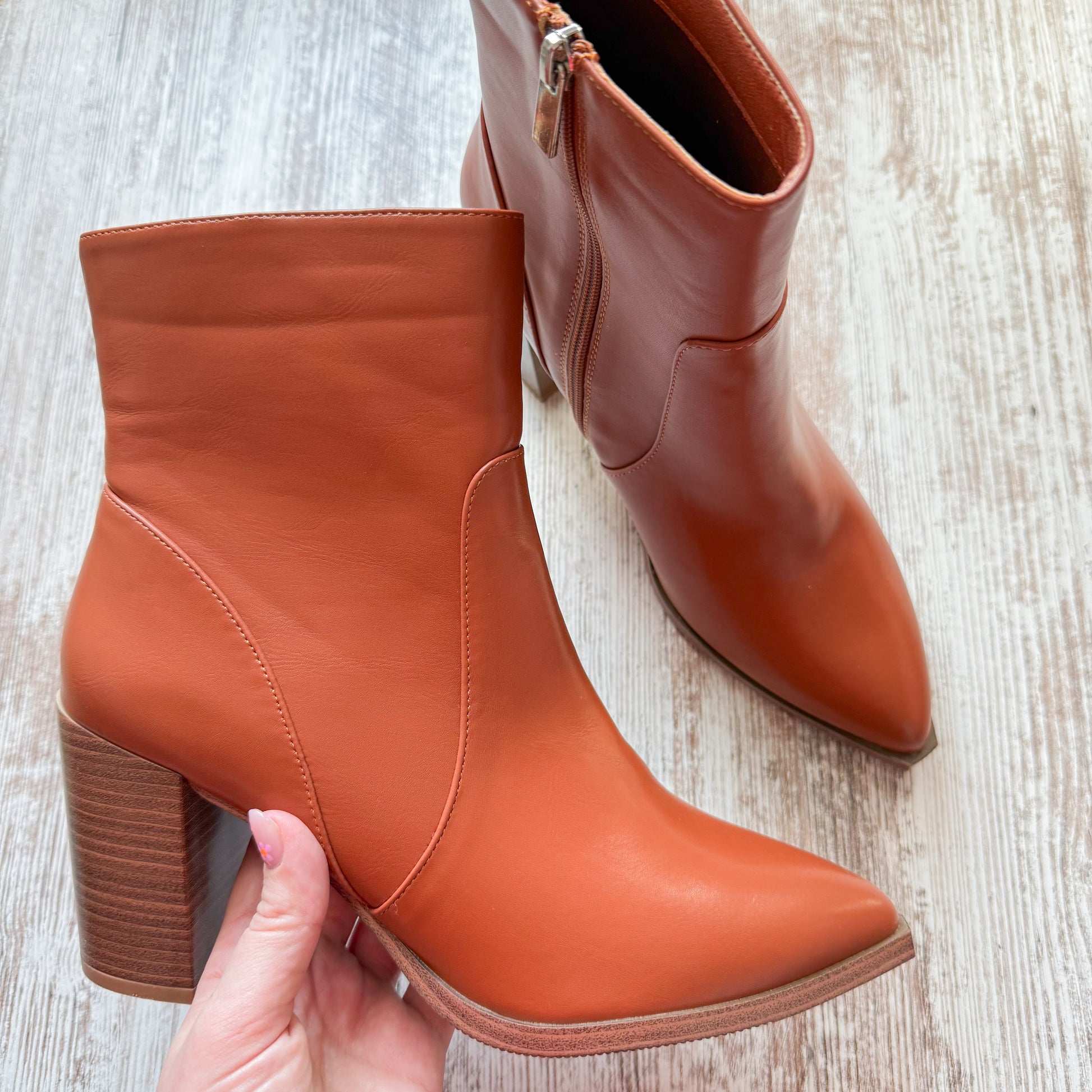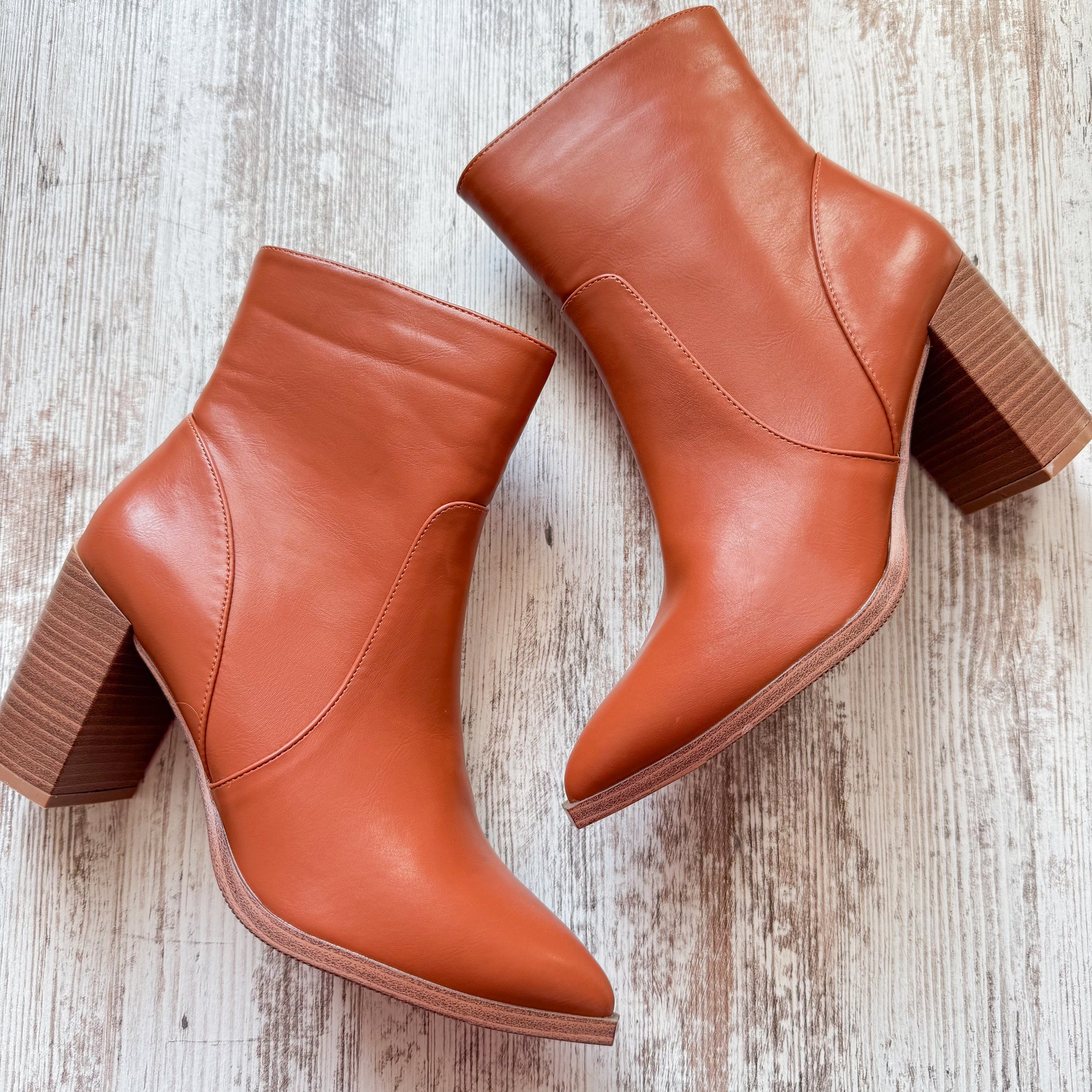A brown faux leather ankle boot with a closed pointed toe and side zipper.