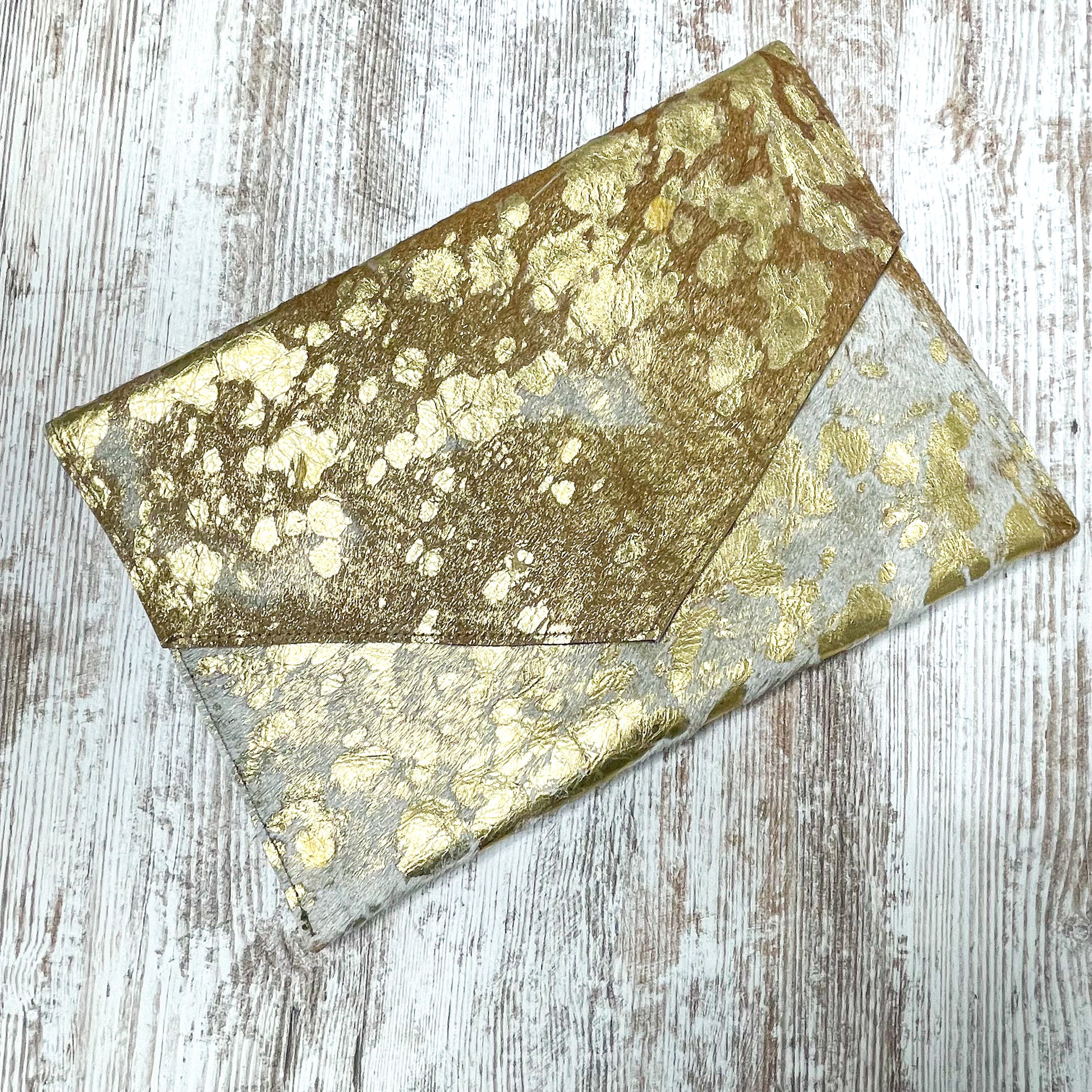 Handmade clutch in a gold acid Wash cowhide with a soft suede lining, inside zipper pocket, and magnetic closure.