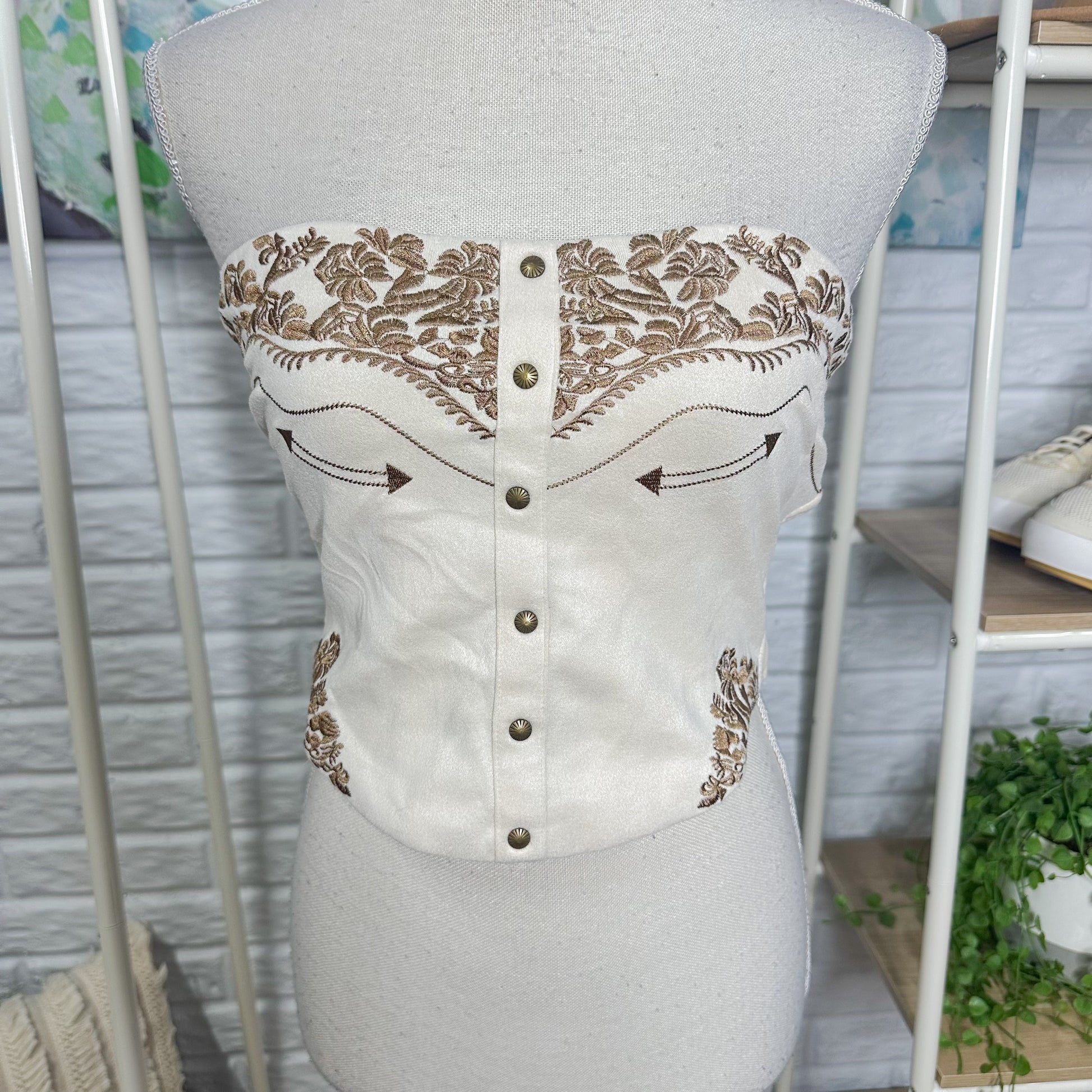 A suede like tube top with a western feel with a brown embroidered design and a side zipper.