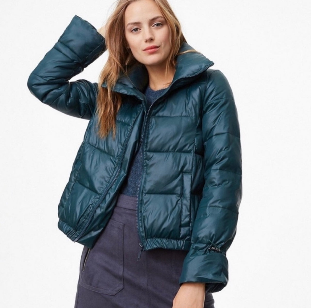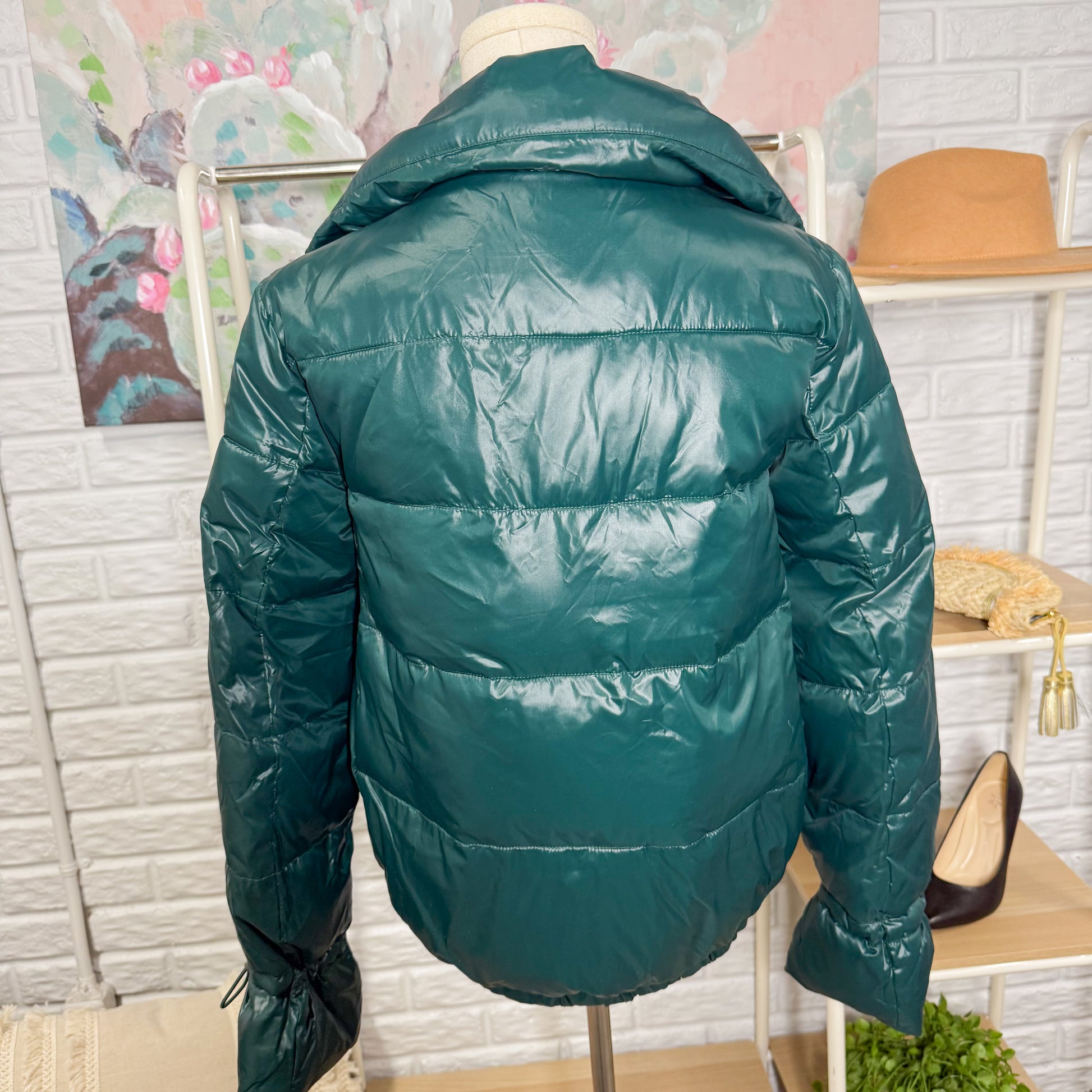 A emerald green shiny puffer jacket with a front zipper and pockets.