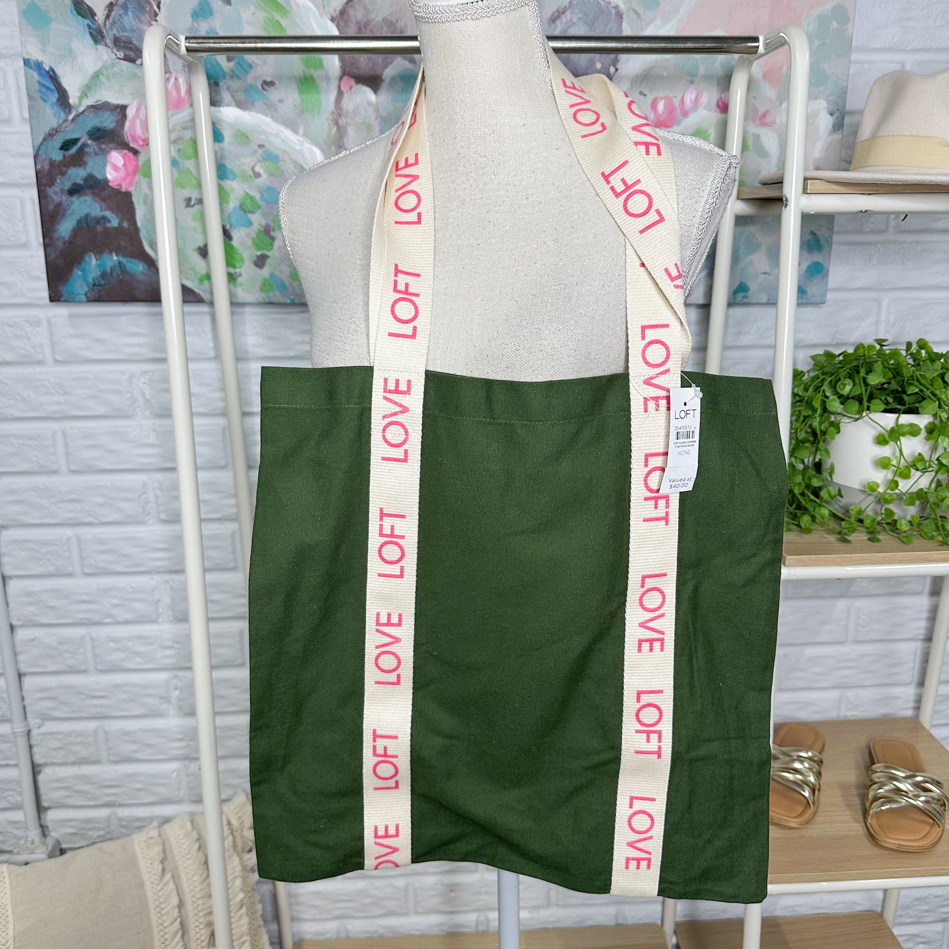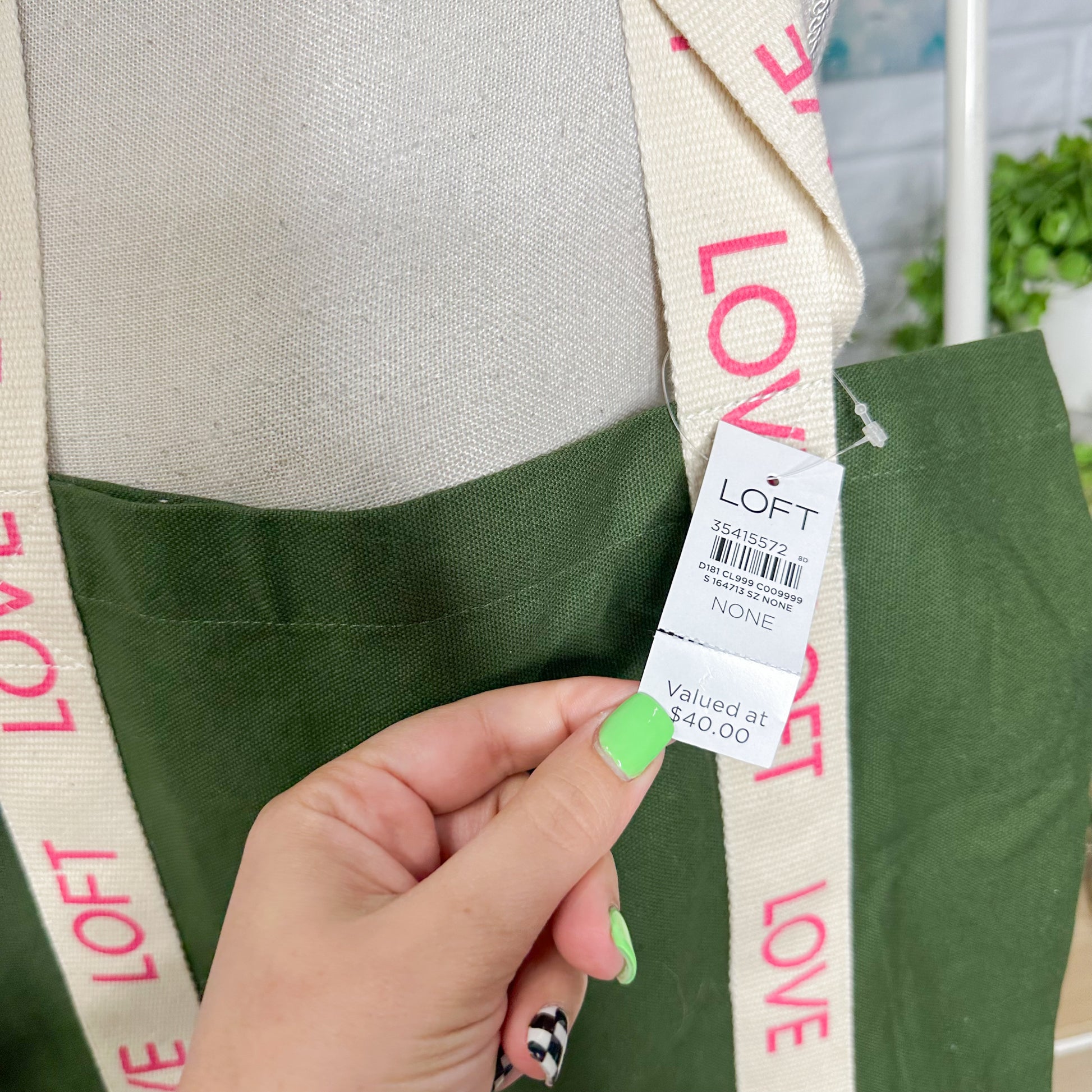 A Sage green canvas tote bag with ivory/cream handles that say “Love LOFT.”