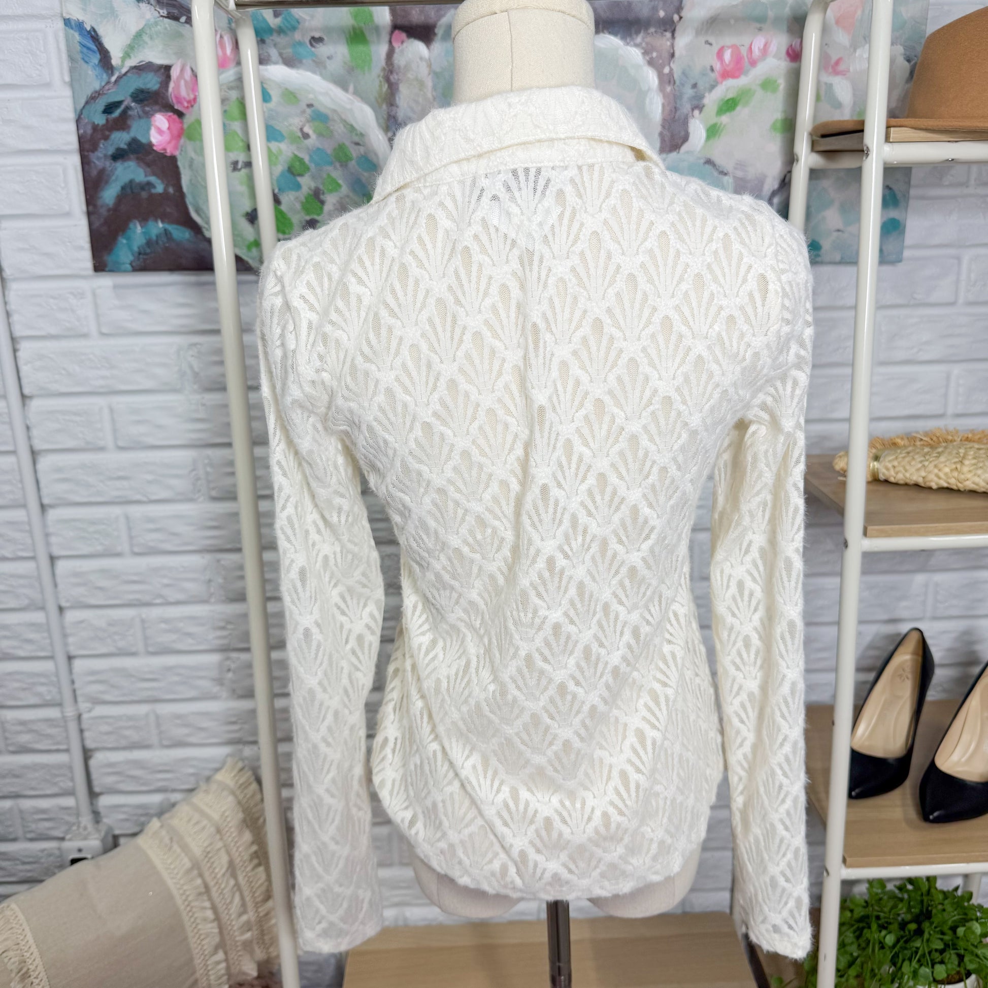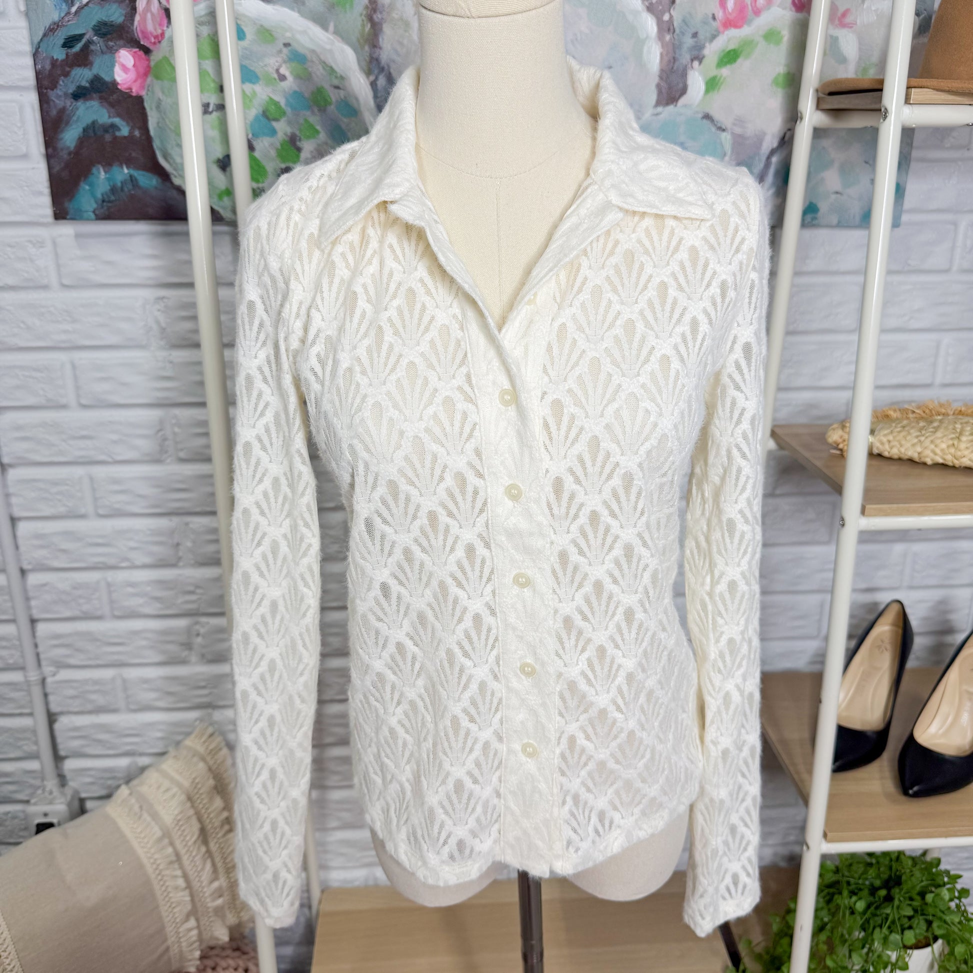 All the details of your favorite button down - in lace? It's a romantic dream come true. Point collar. Long sleeves. Button front.
