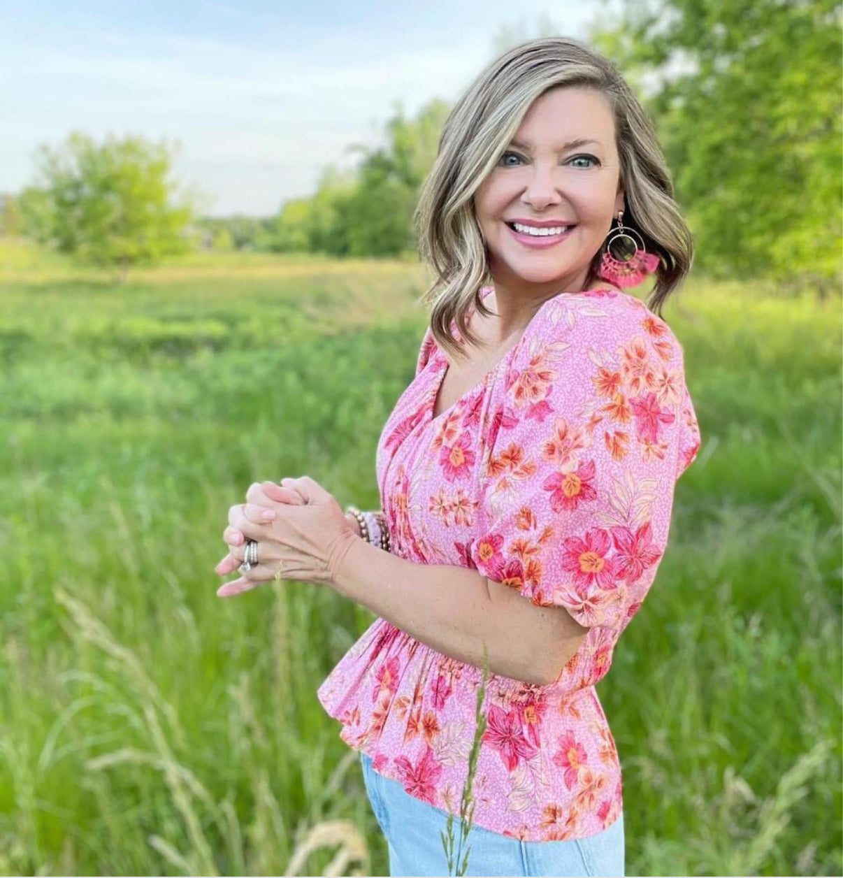 A pink floral blouse with a short puff sleeve, gathered waist, and v neckline. A beautiful spring top.