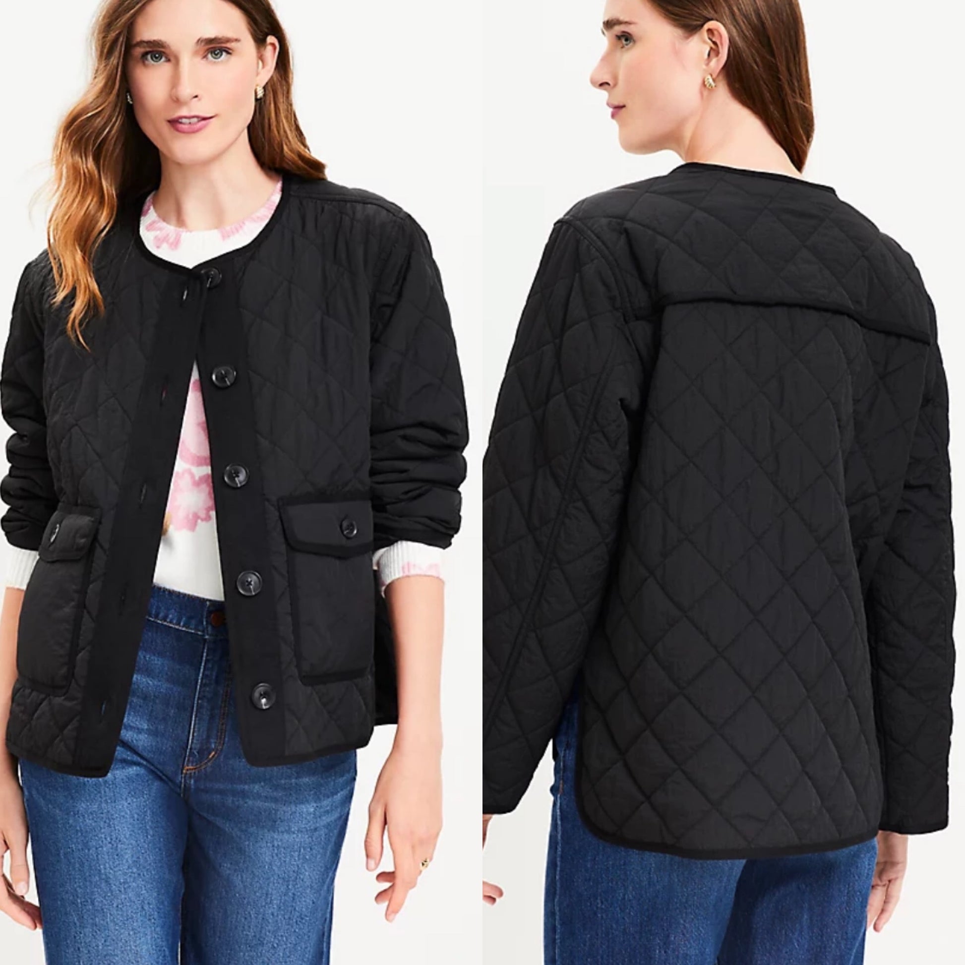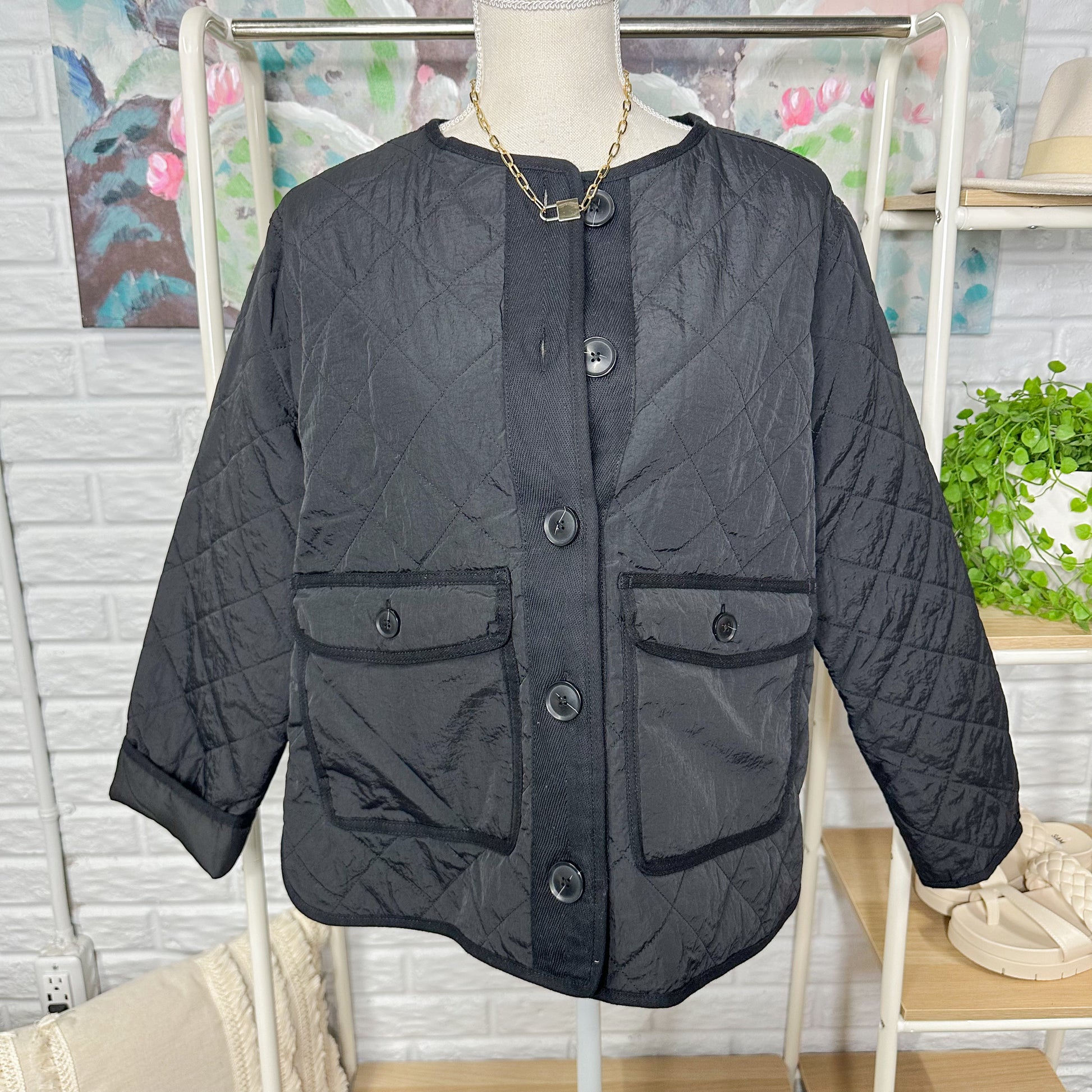 A grey and black quilted coat with large button front closure, front pockets, and a small side split