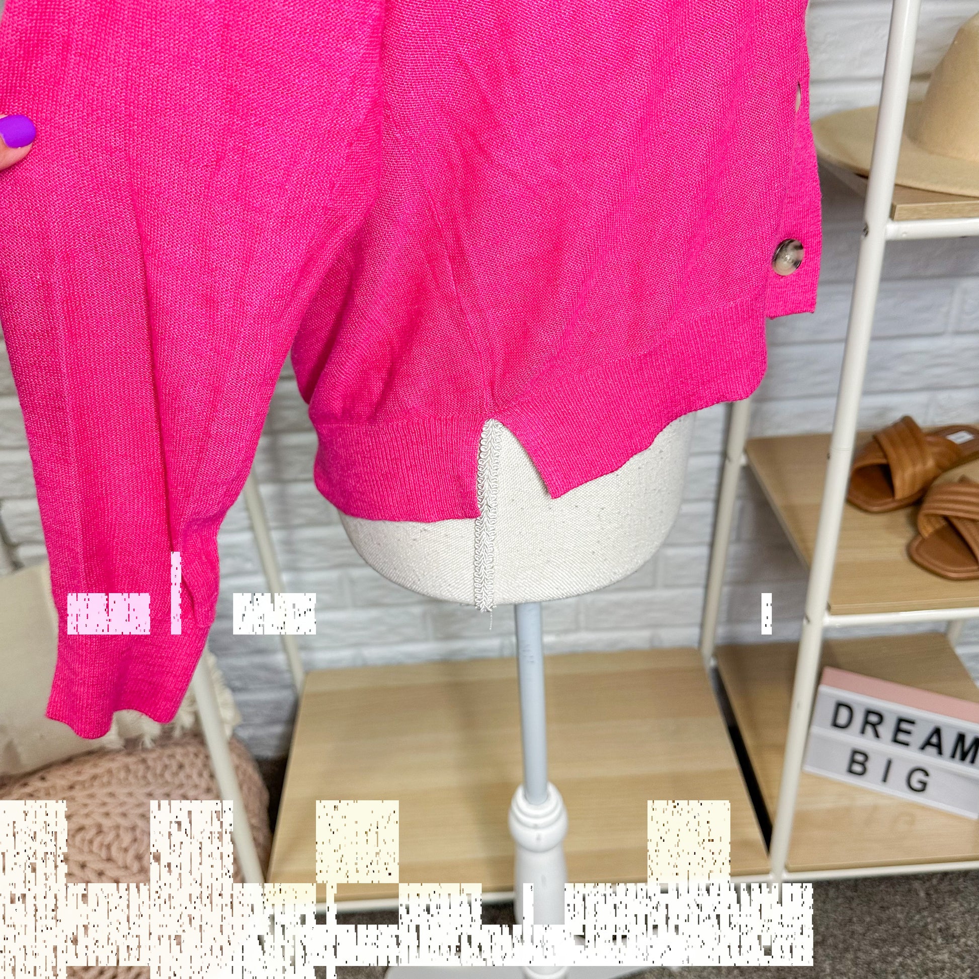 A soft pink cardigan with a button front and v neckline.