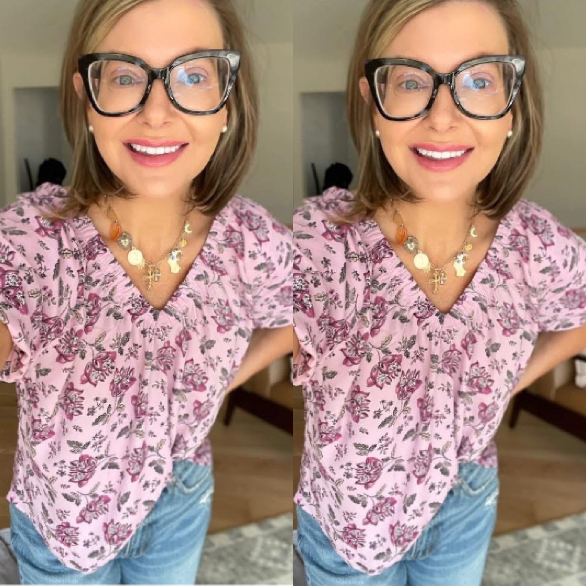 A short sleeve purple blouse with a v neckline and floral pattern.