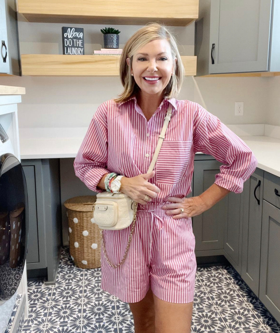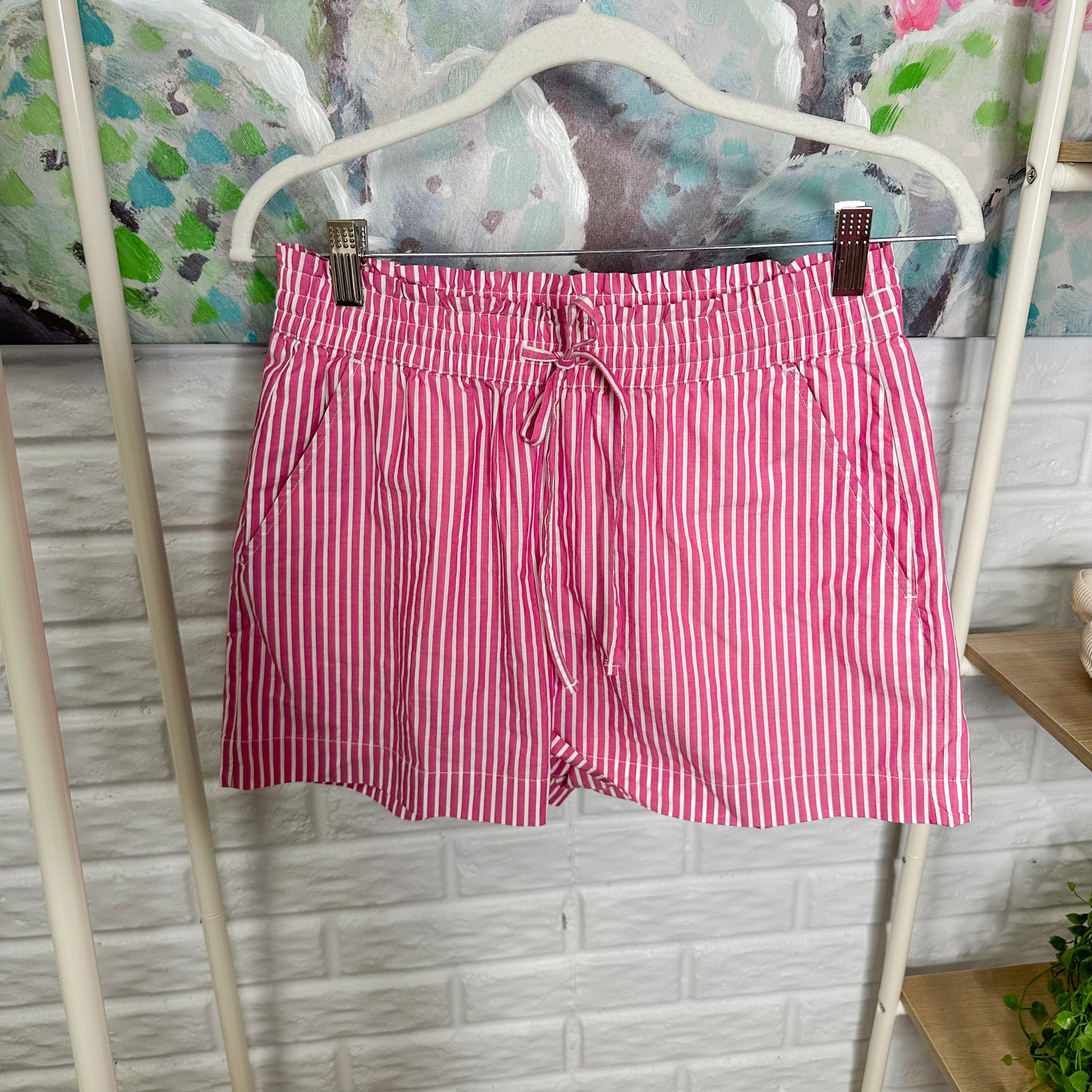 A white & pink stripe matching set. It includes a pull on short with a drawstring, and a matching 3/4 sleeve button down top.