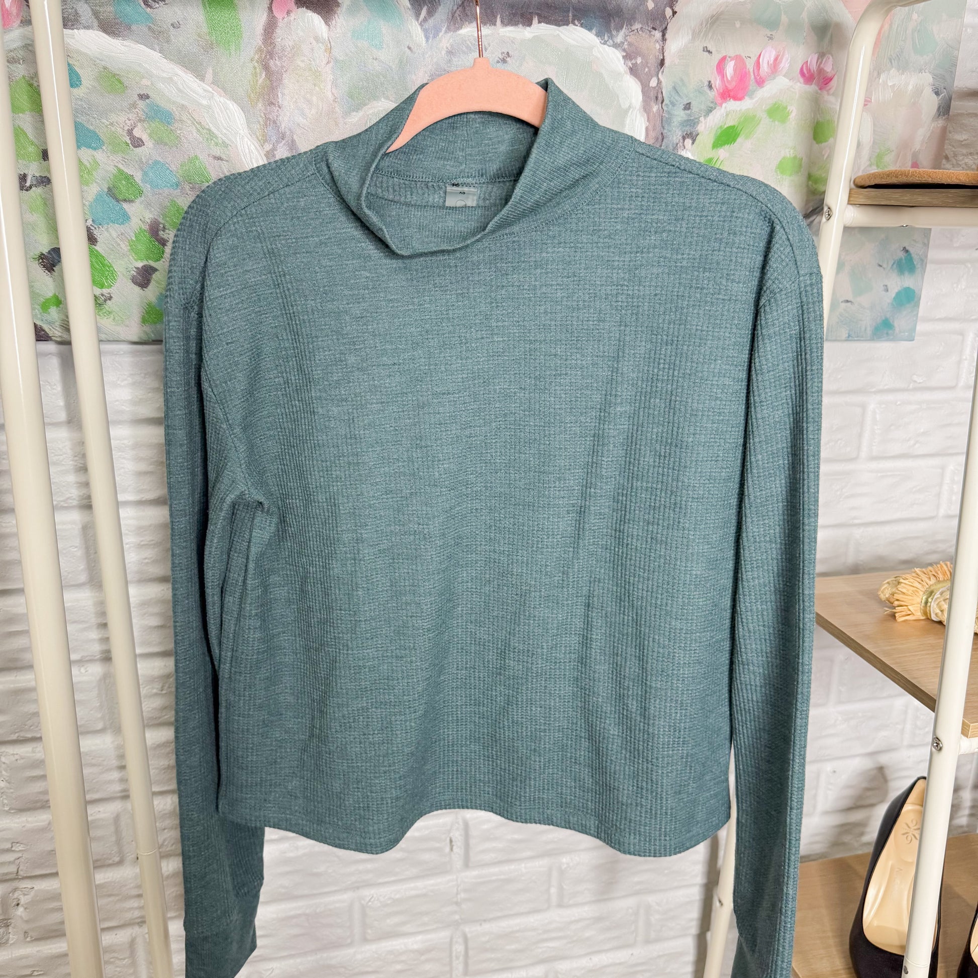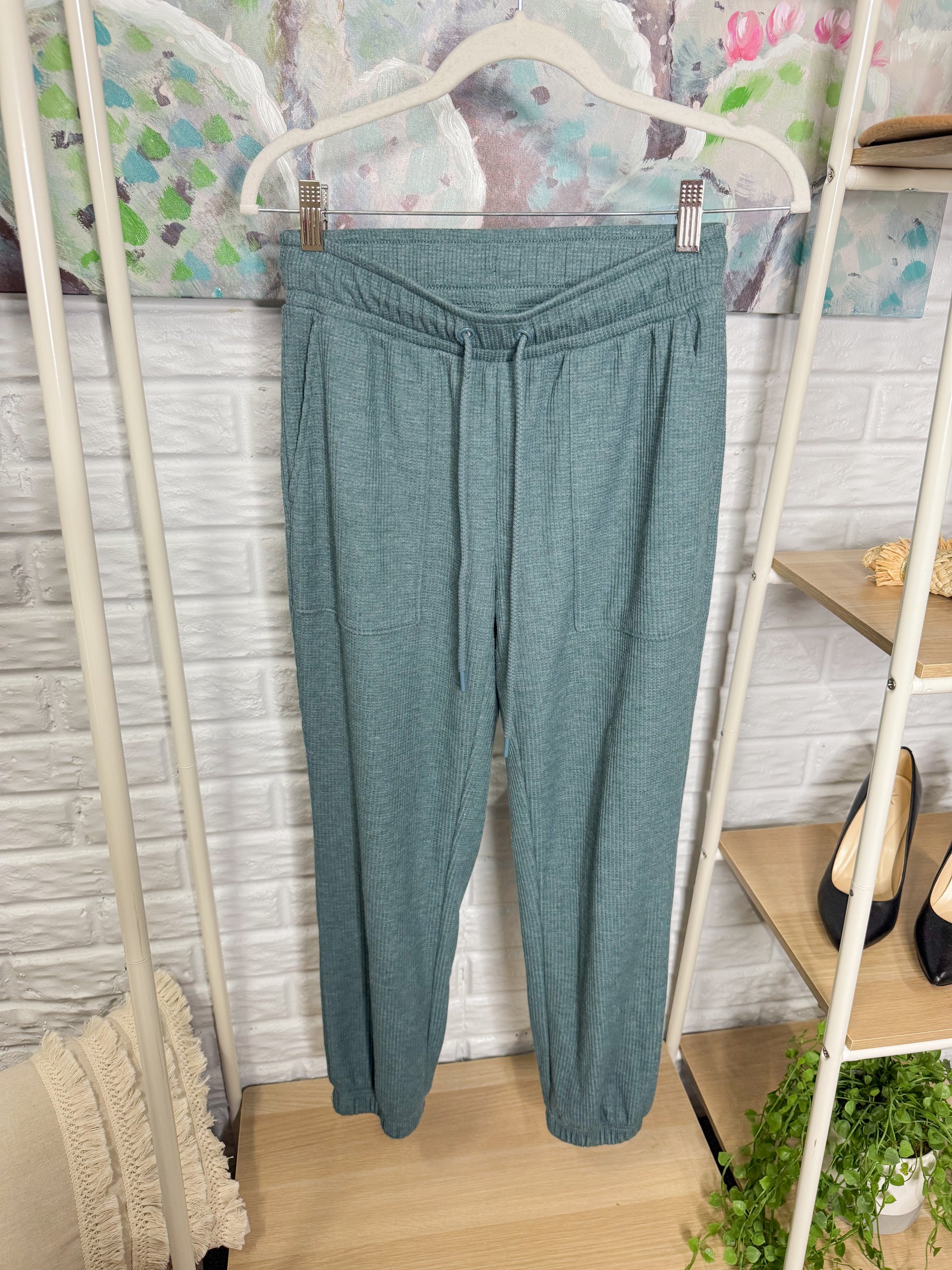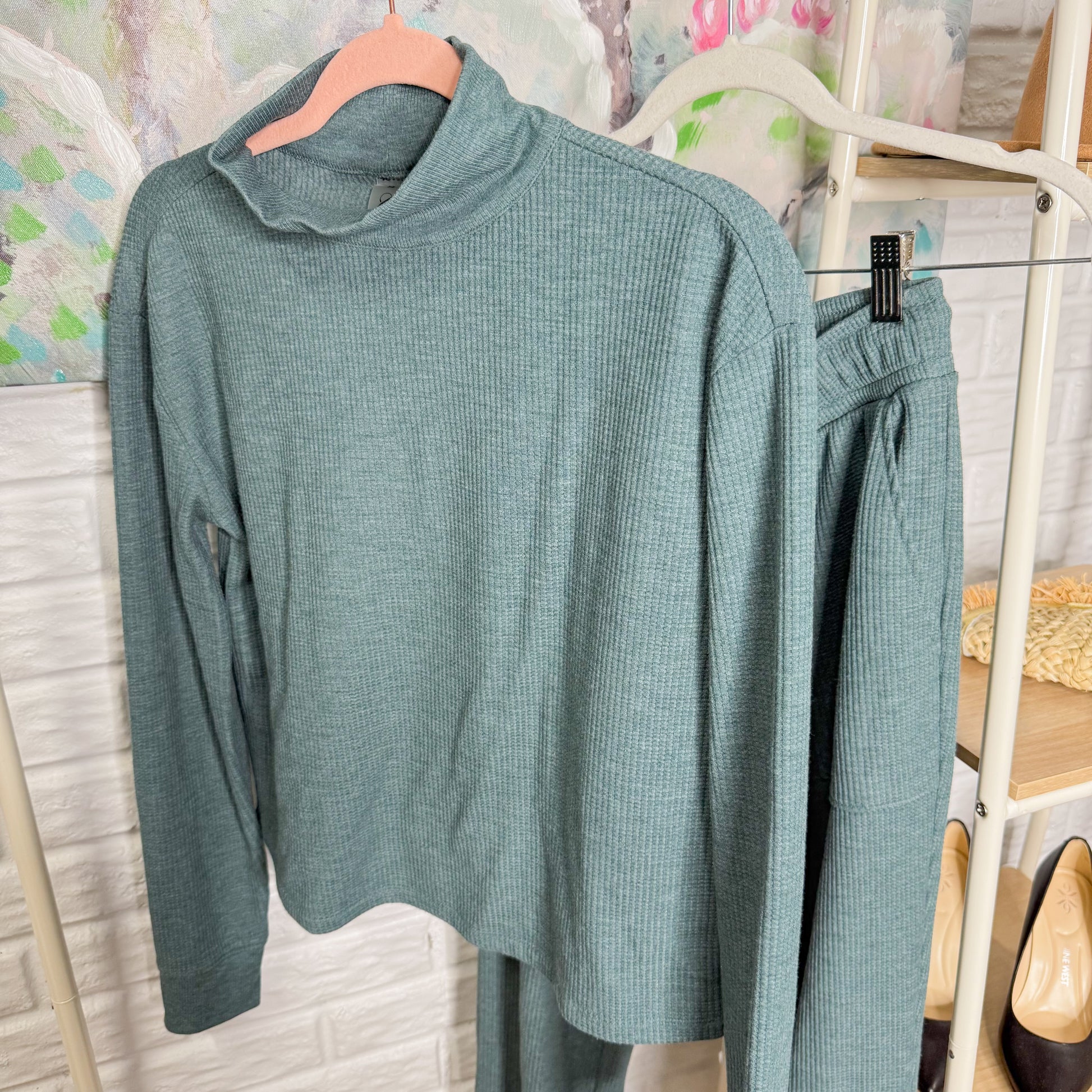 A marine green matching lounge set with a mock neck stretchy long sleeve top and matching joggers.