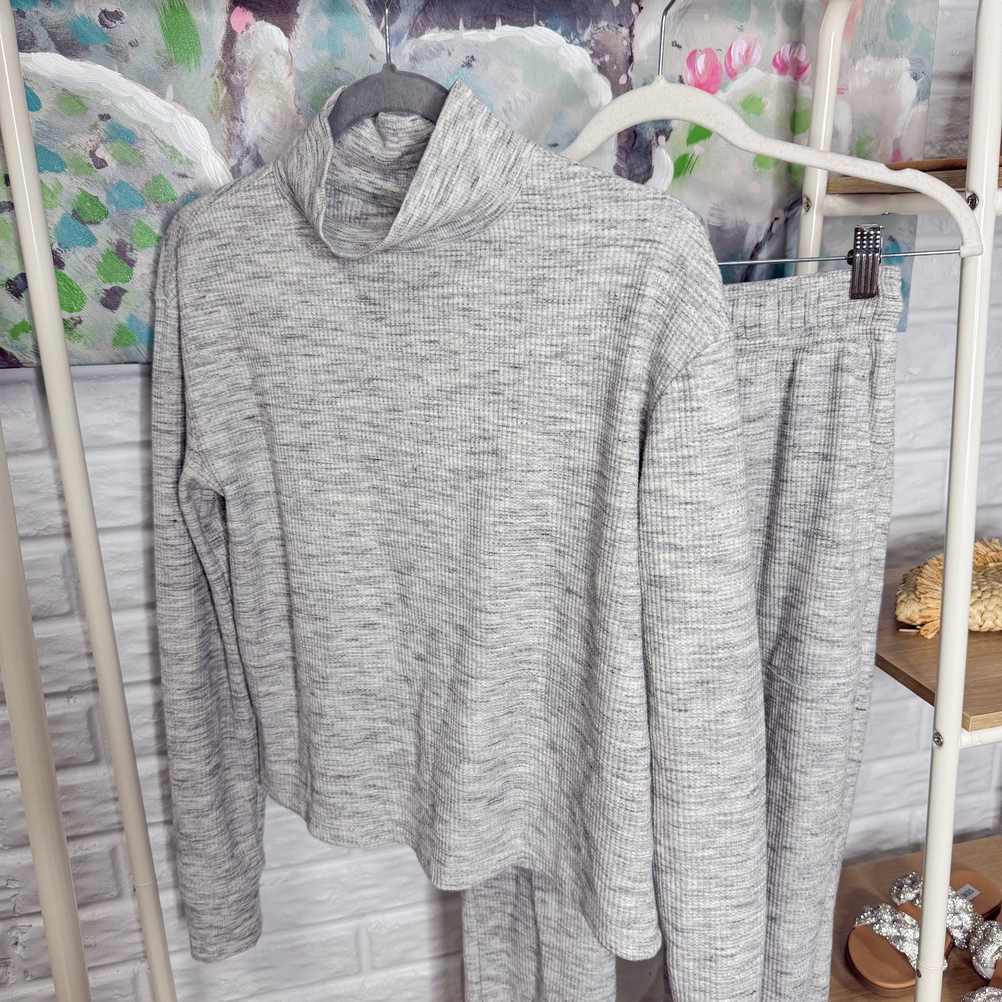 A gray matching lounge set with a mock neck stretchy long sleeve top and matching joggers.