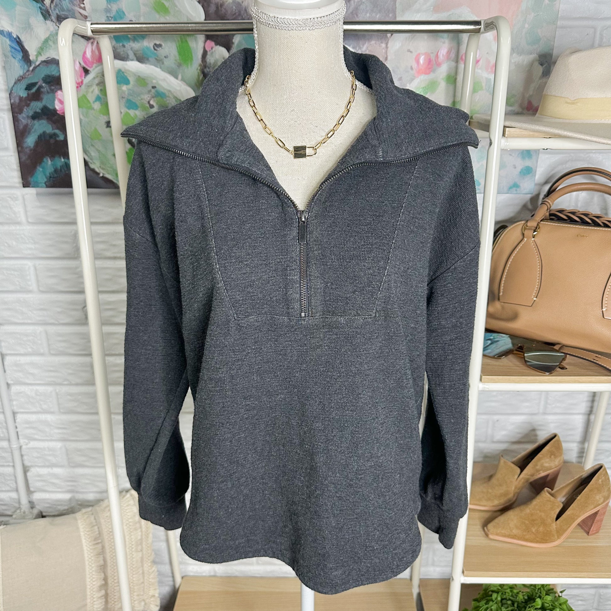 A charcoal grey half zip sweater with a collar.
