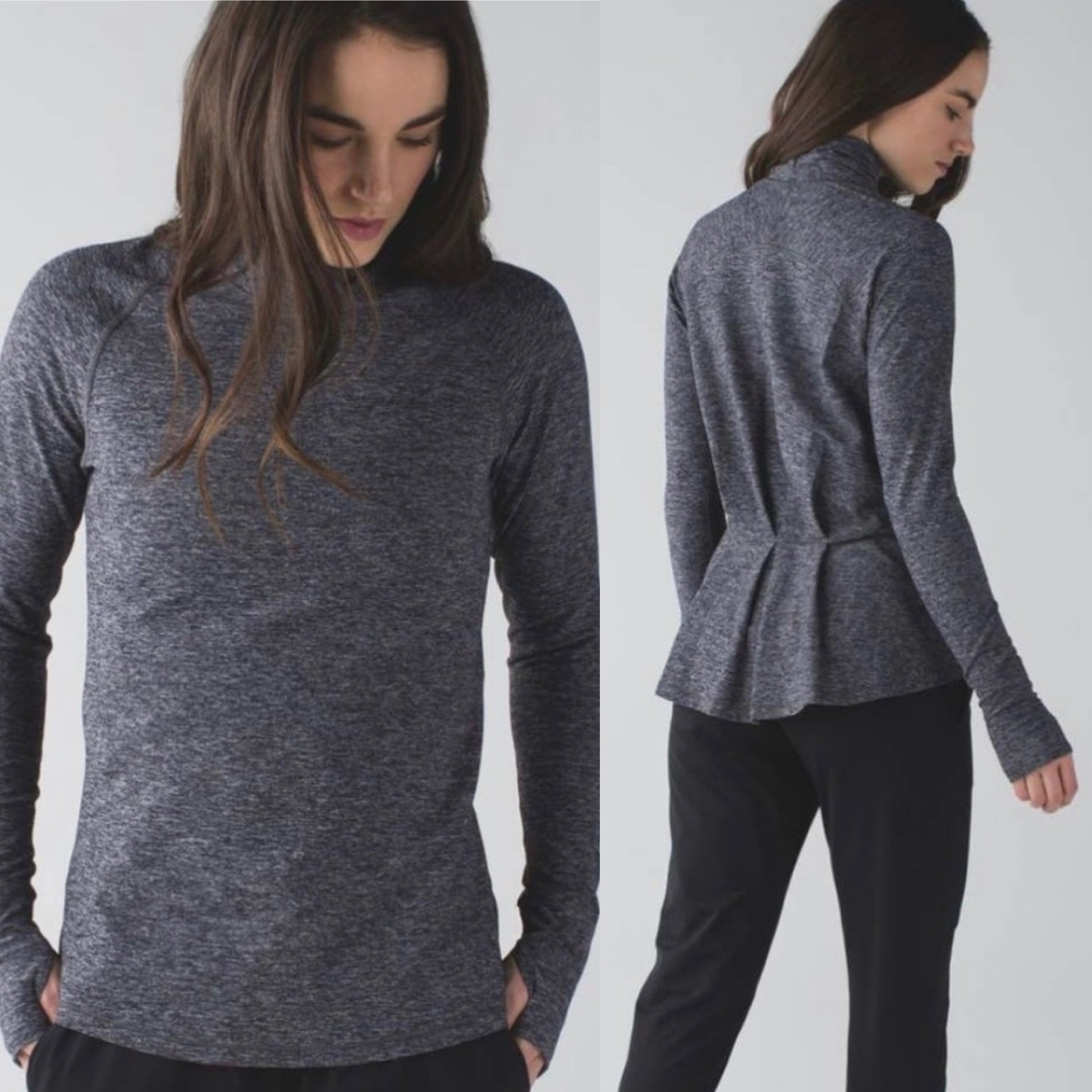 Heathered black athletic long sleeve top with a high wrap neck, thumb holes, and pleated back.