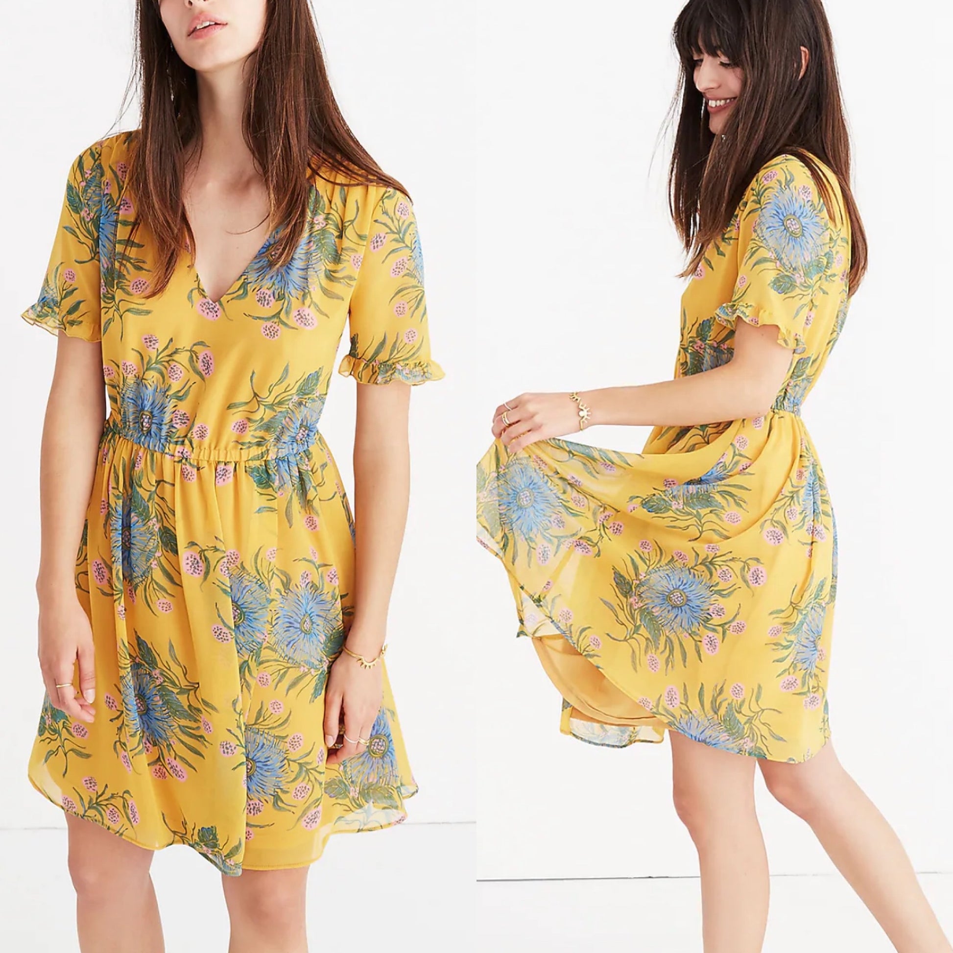 A pretty yellow summer mini dress with a short ruffle sleeve, blue floral print, and v neckline.