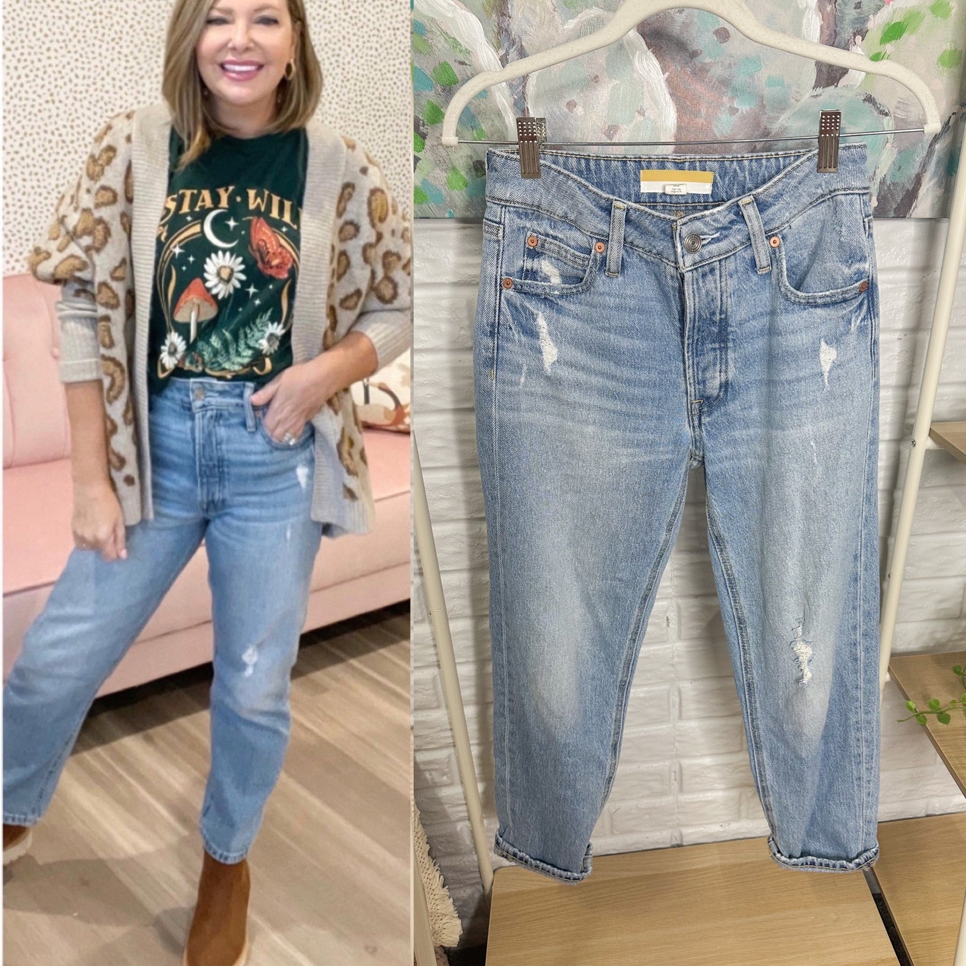 The goldie blues jeans in a light wash with a high rise and a tapered ankle.
