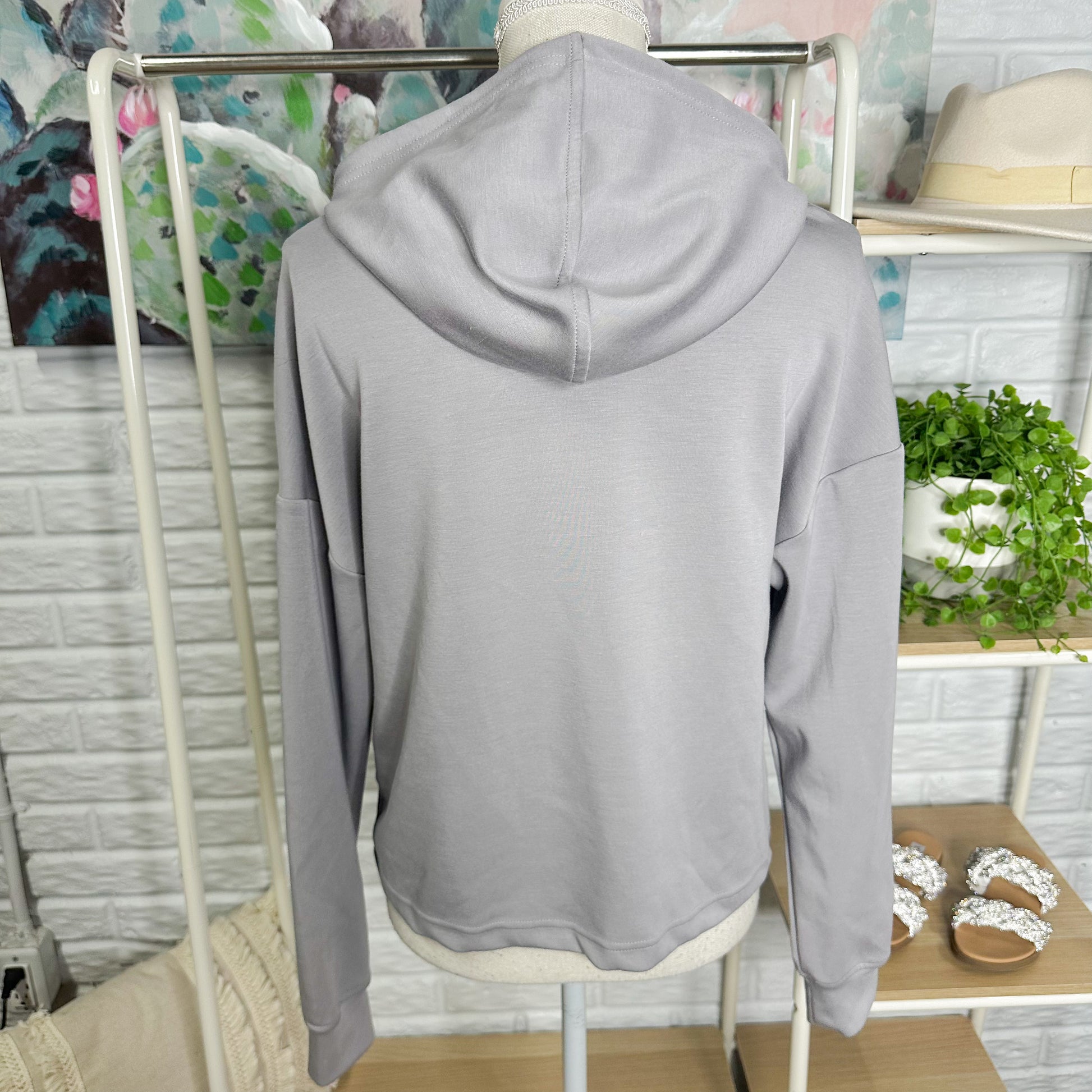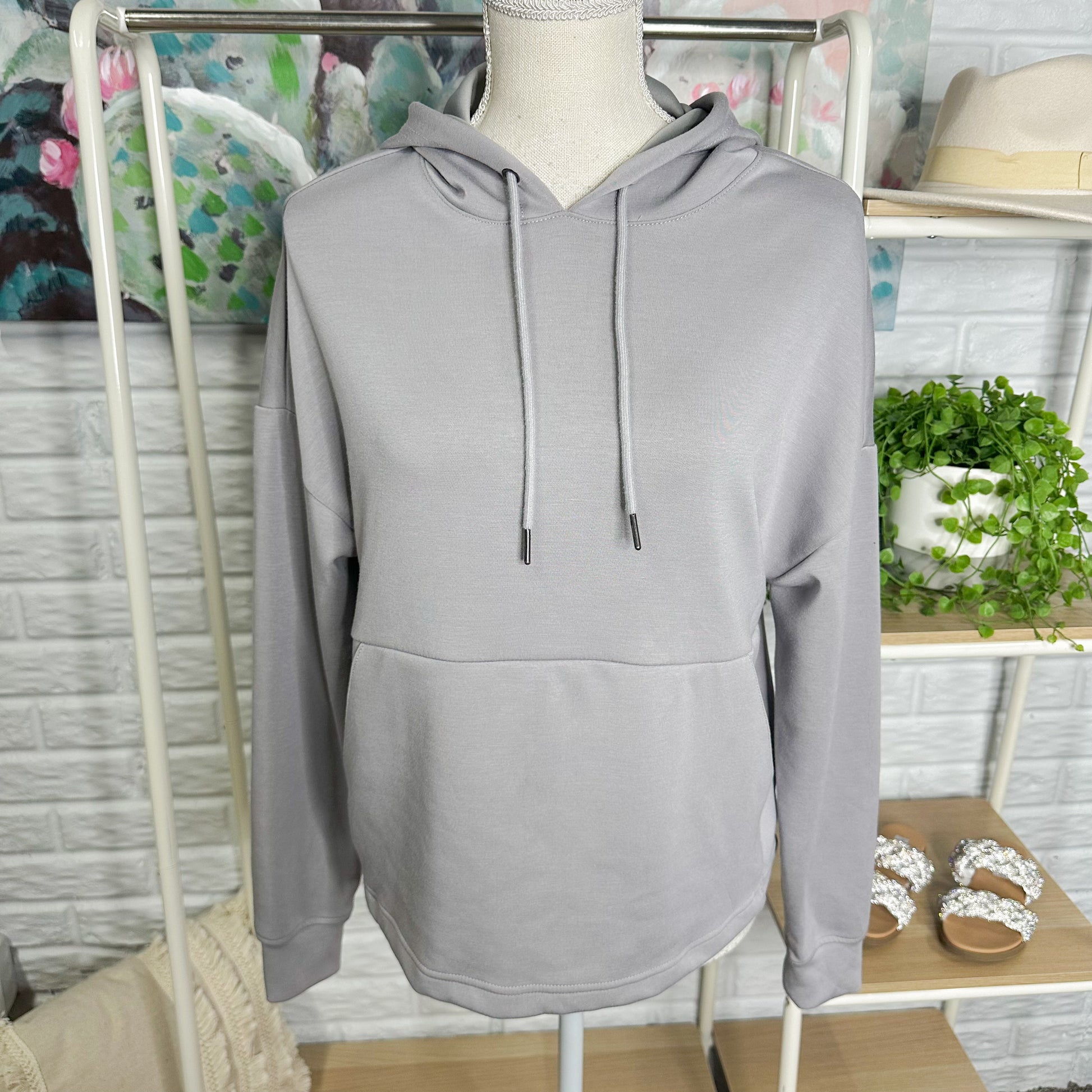A gray scuba hoodie sweatshirt with a drawstring hood and kangaroo pouch pocket.
