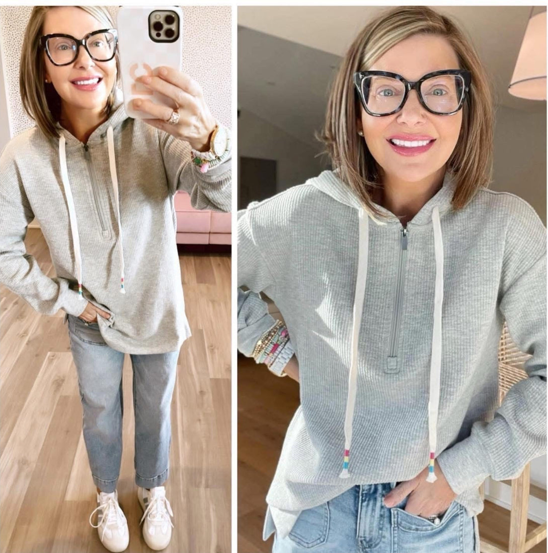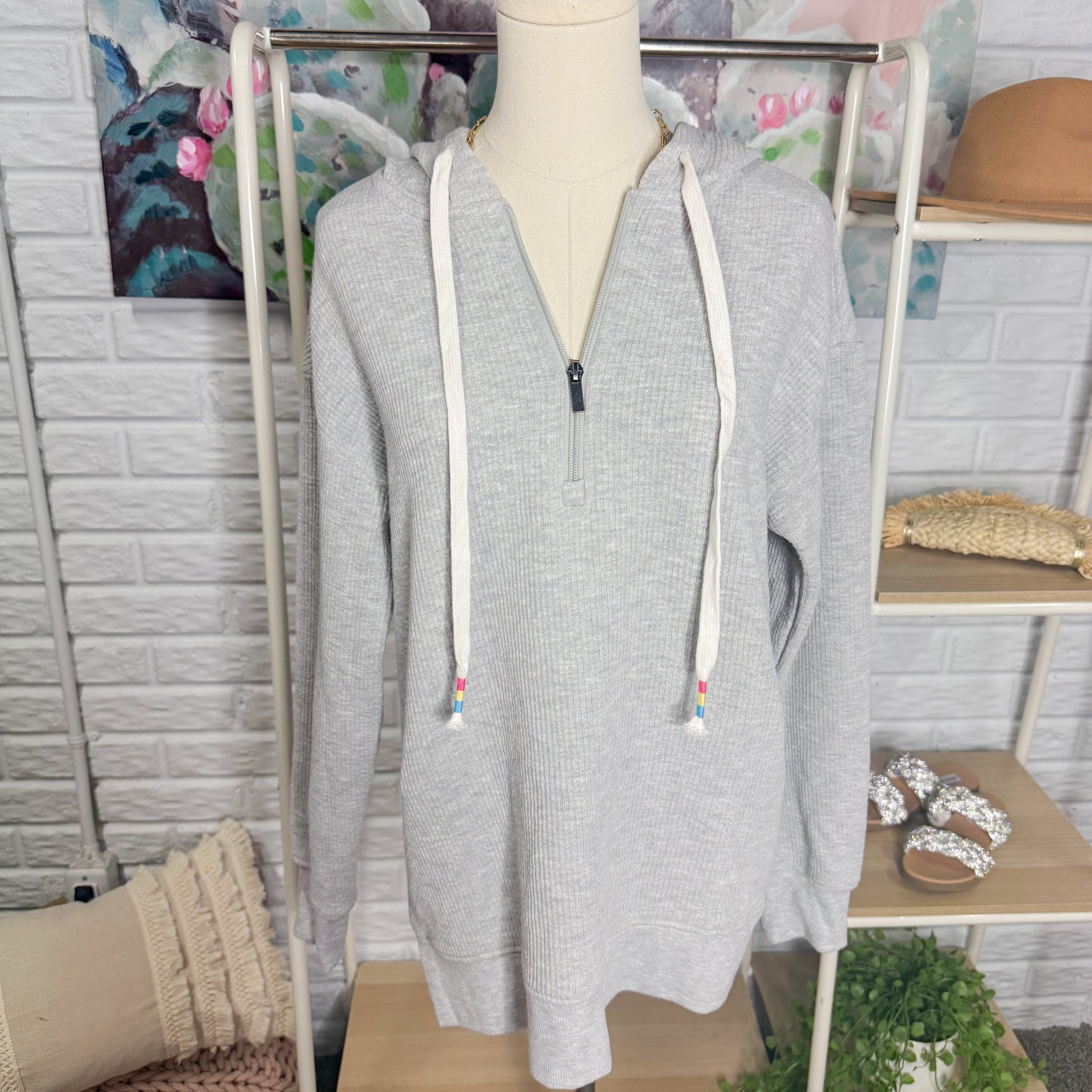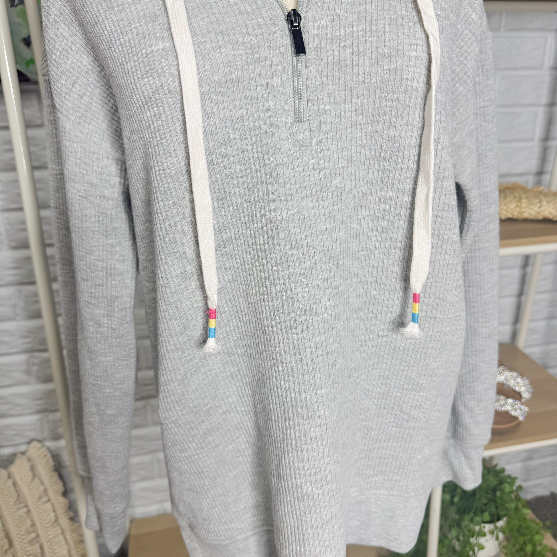 a grey ribbed knit hoodie with a drawstring and quarter zip neckline.