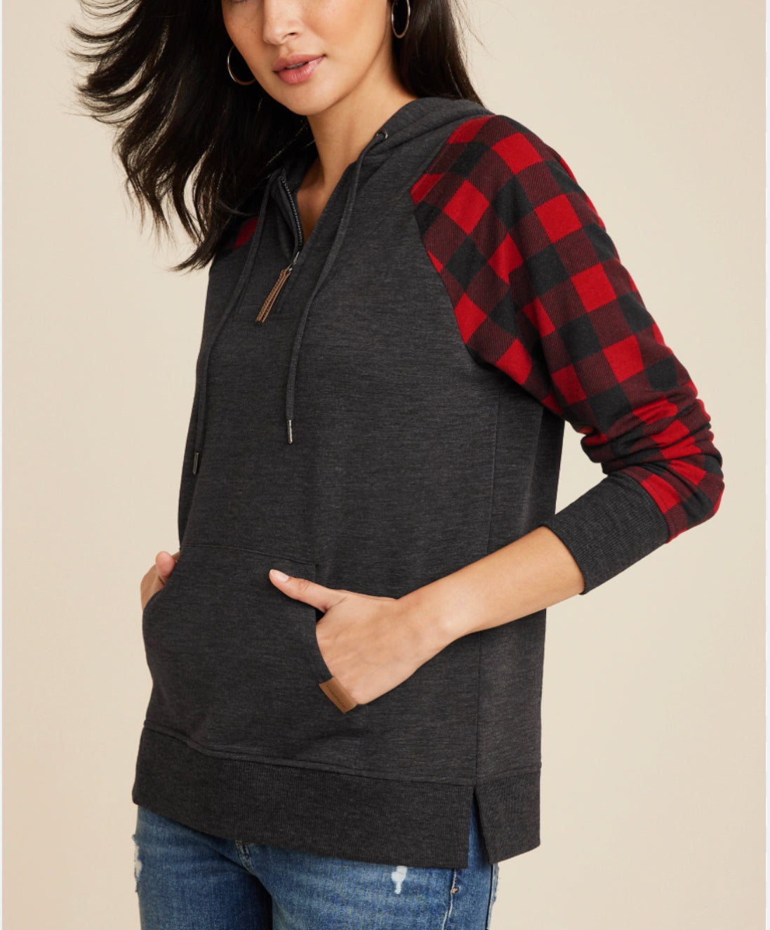 A charcoal grey quarter zip sweater with Buffalo plaid sleeves, kangaroo pouch, and hood.