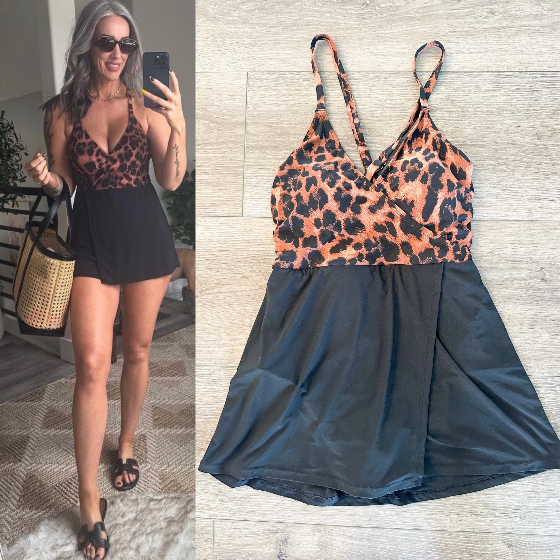 A swim dress with a faux wrap style bottom and a v neck top with built in cups.