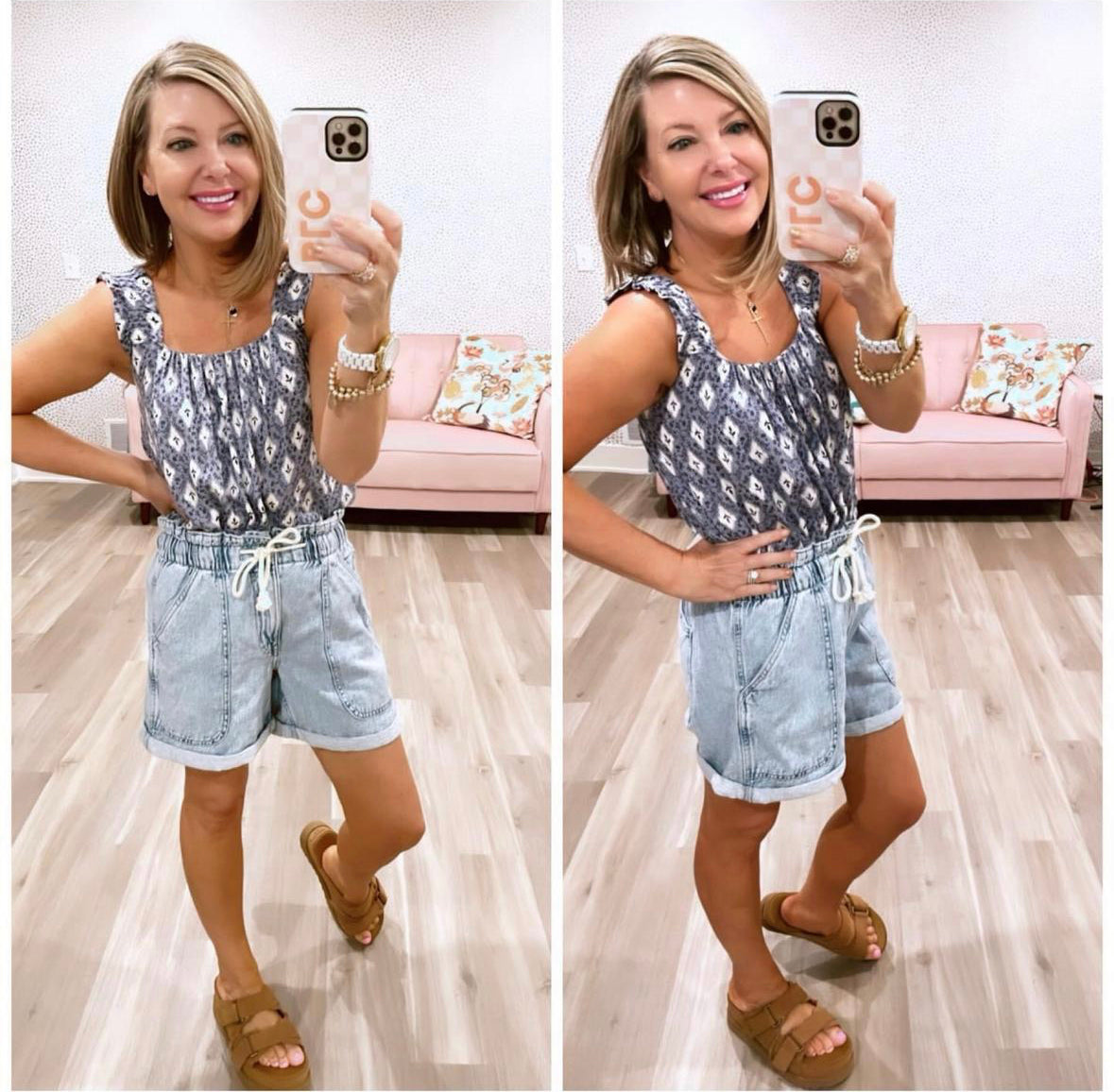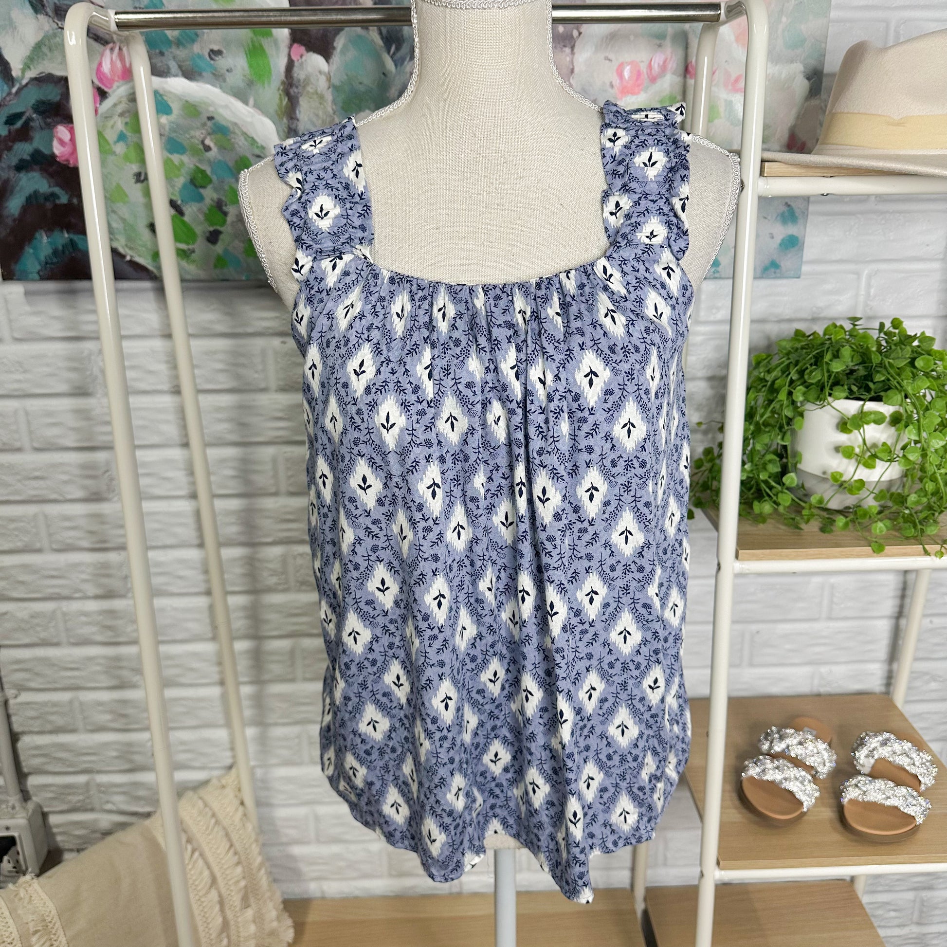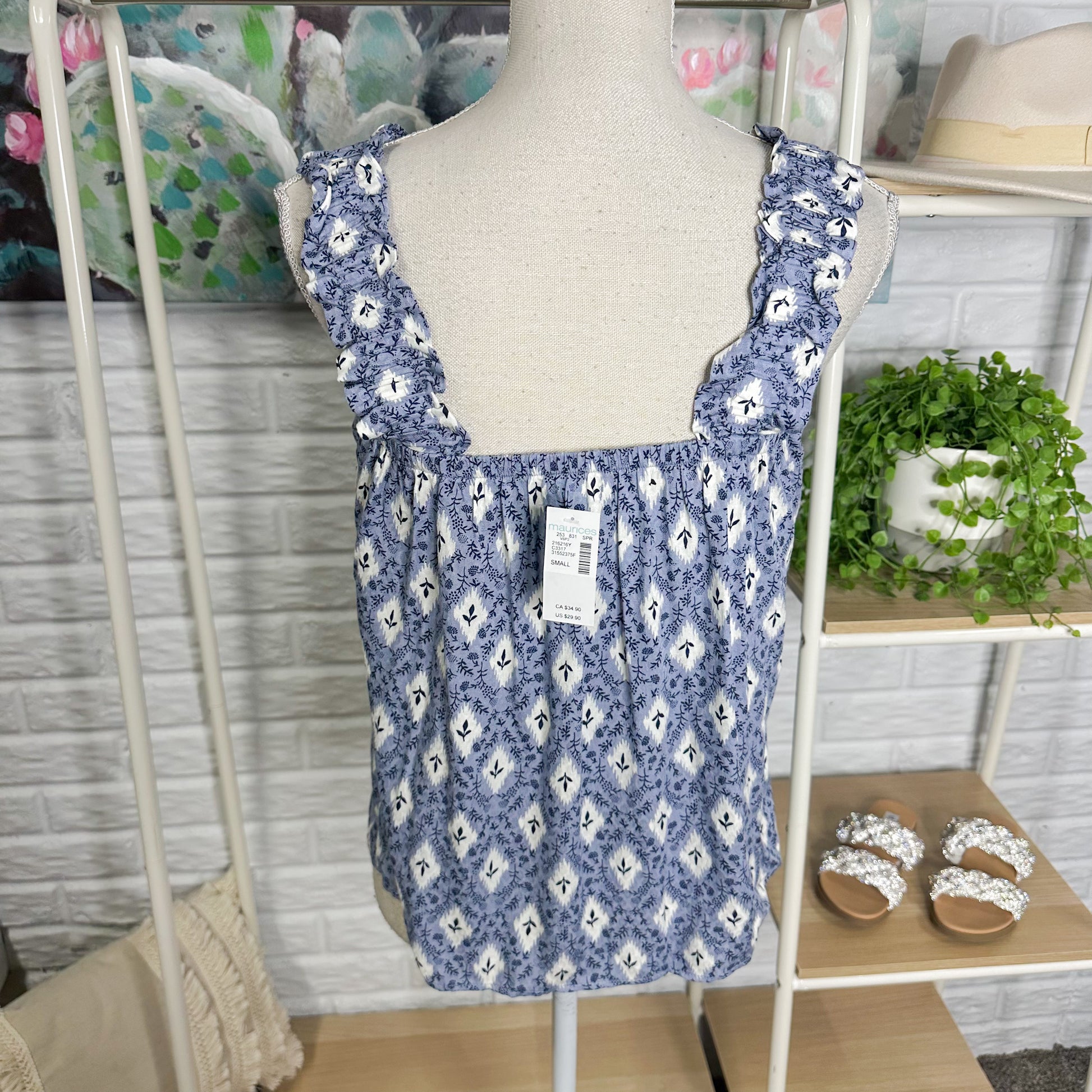 A blue floral print loose fitting swing tank with a ruffled strap.