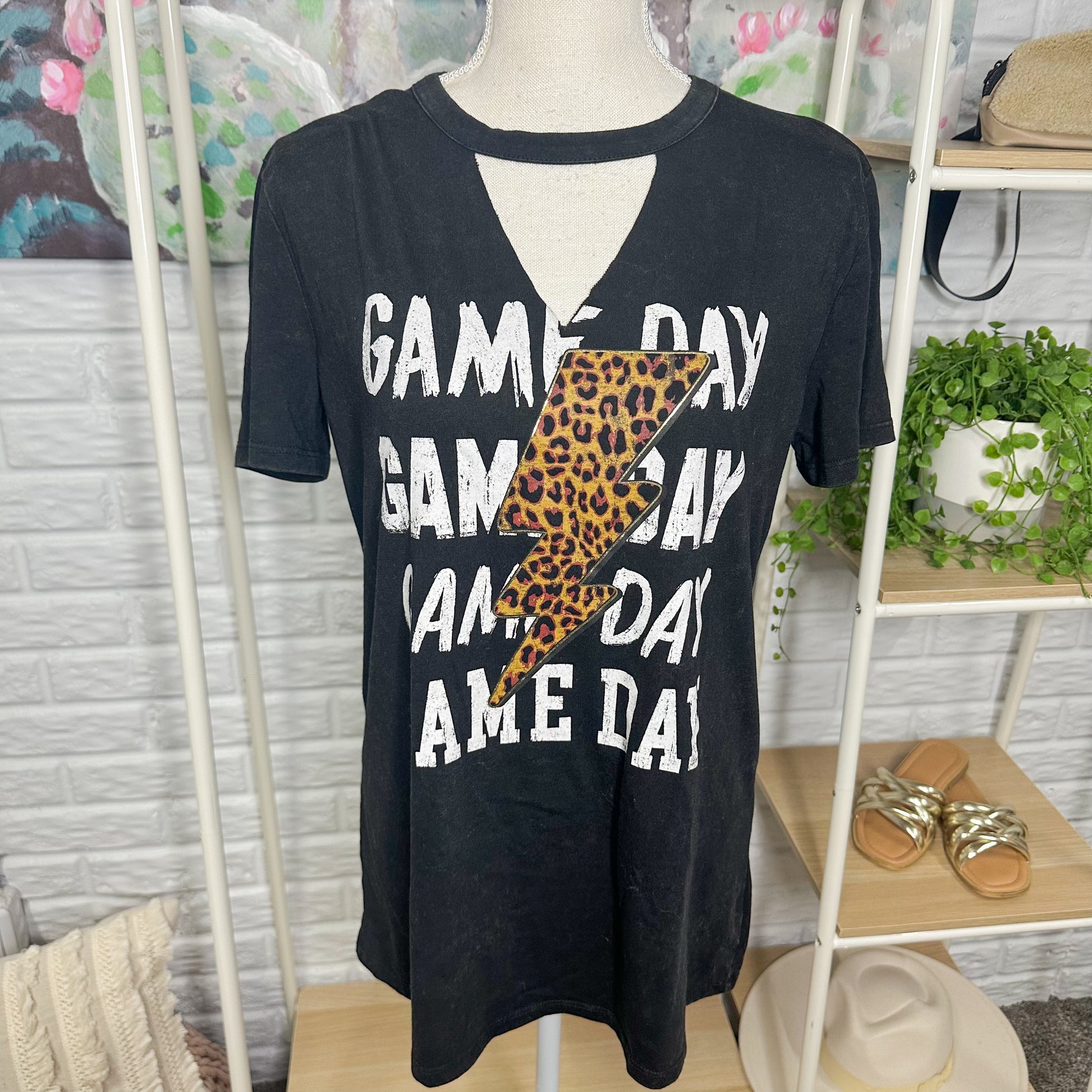 A black short sleeve tee with a cut out v neckline and a leopard print lightening bolt graphic and the quote “game day”.