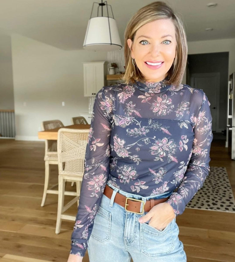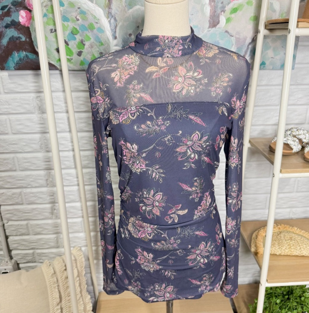 A mesh long sleeve top with a high neckline. It features sheer sleeves and a paisley floral print.