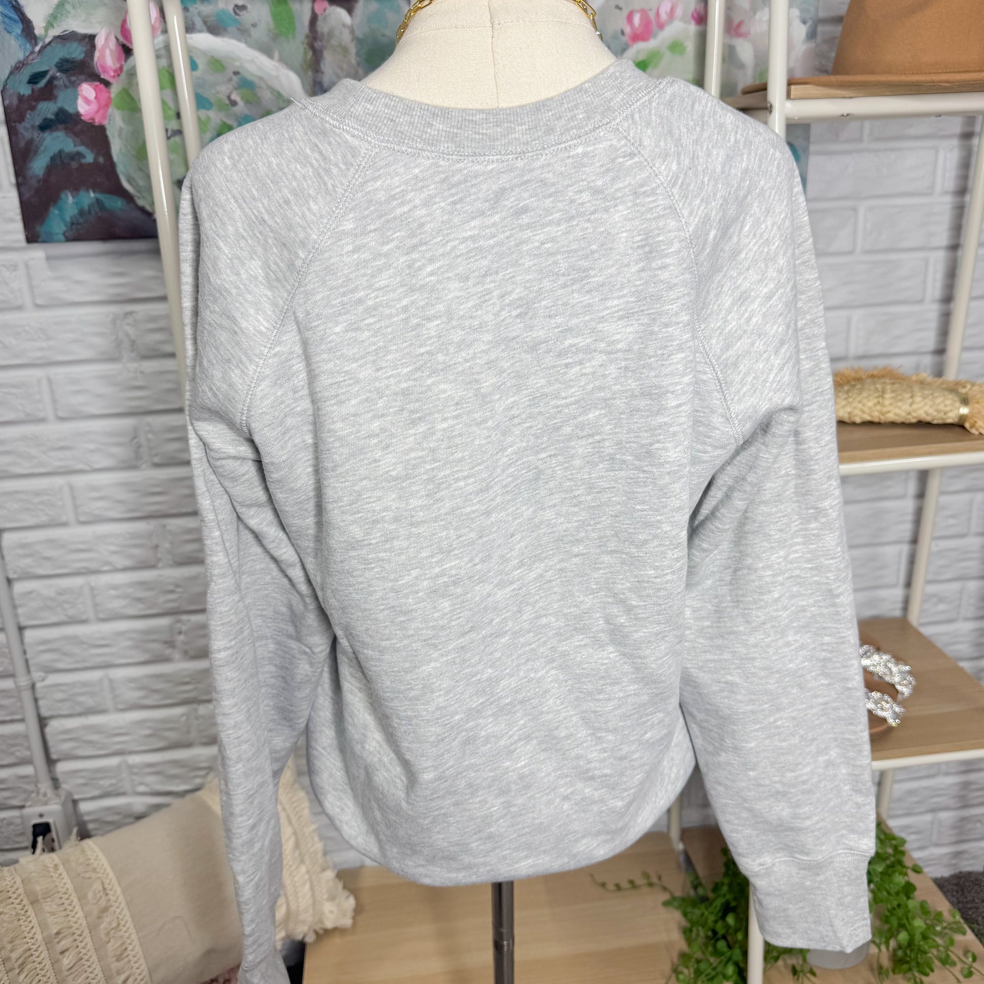 A gray crewneck sweatshirt with a Christmas tree and car graphic and the quote “National Lampoon Christmas.”