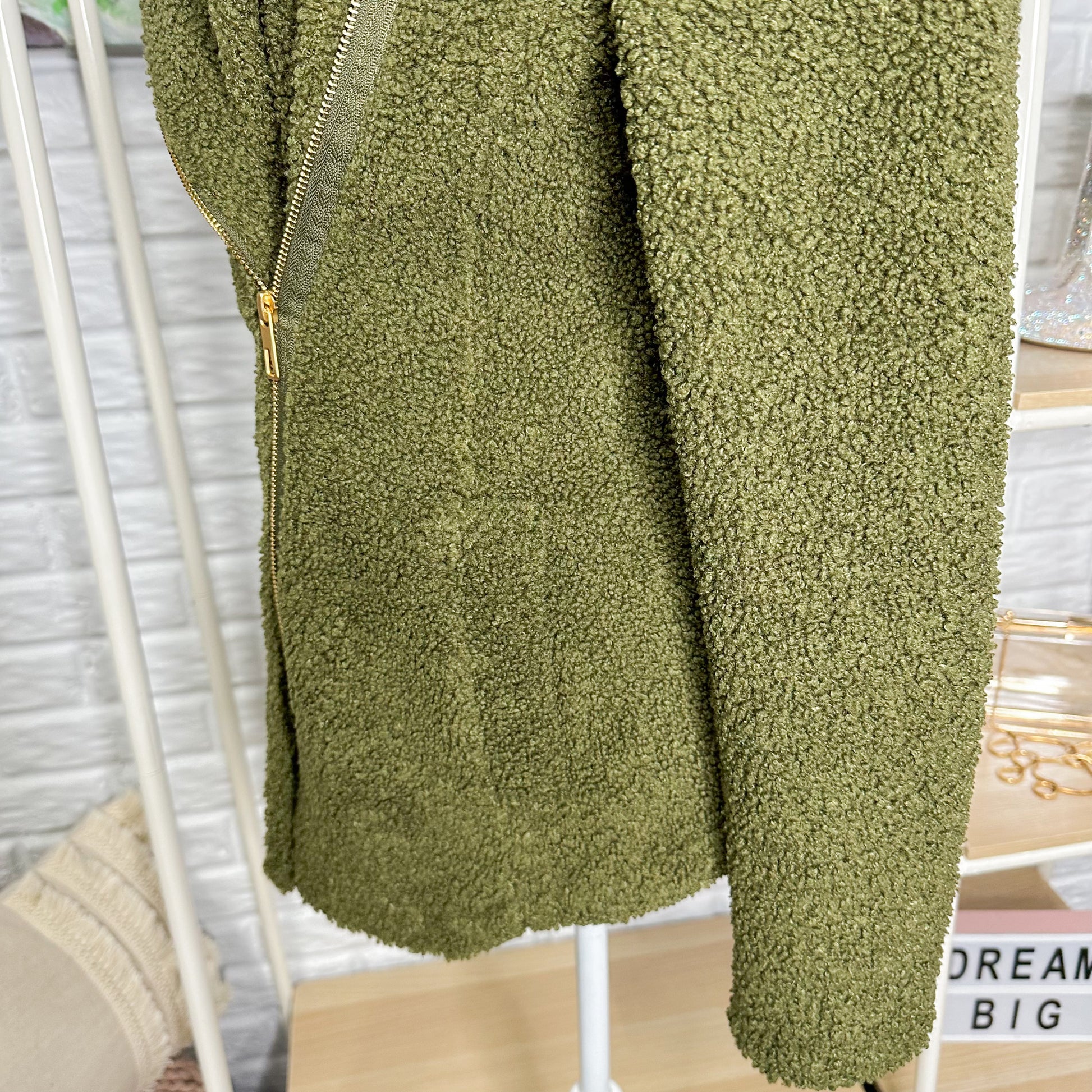 a Olive green Sherpa Teddy jacket with a zipper front and pockets.