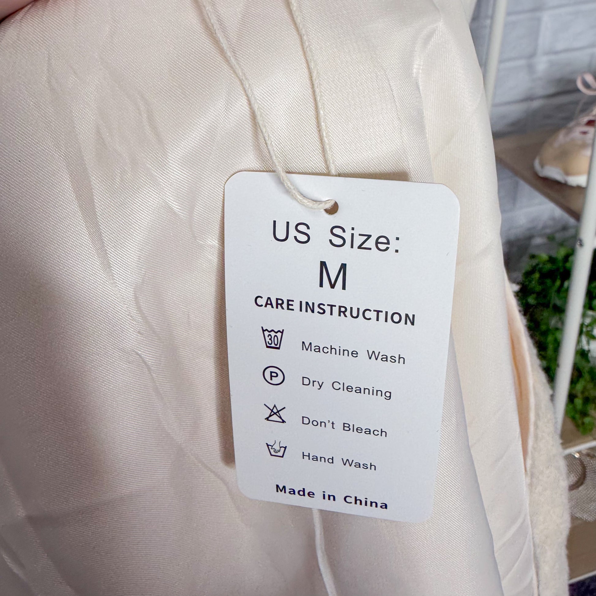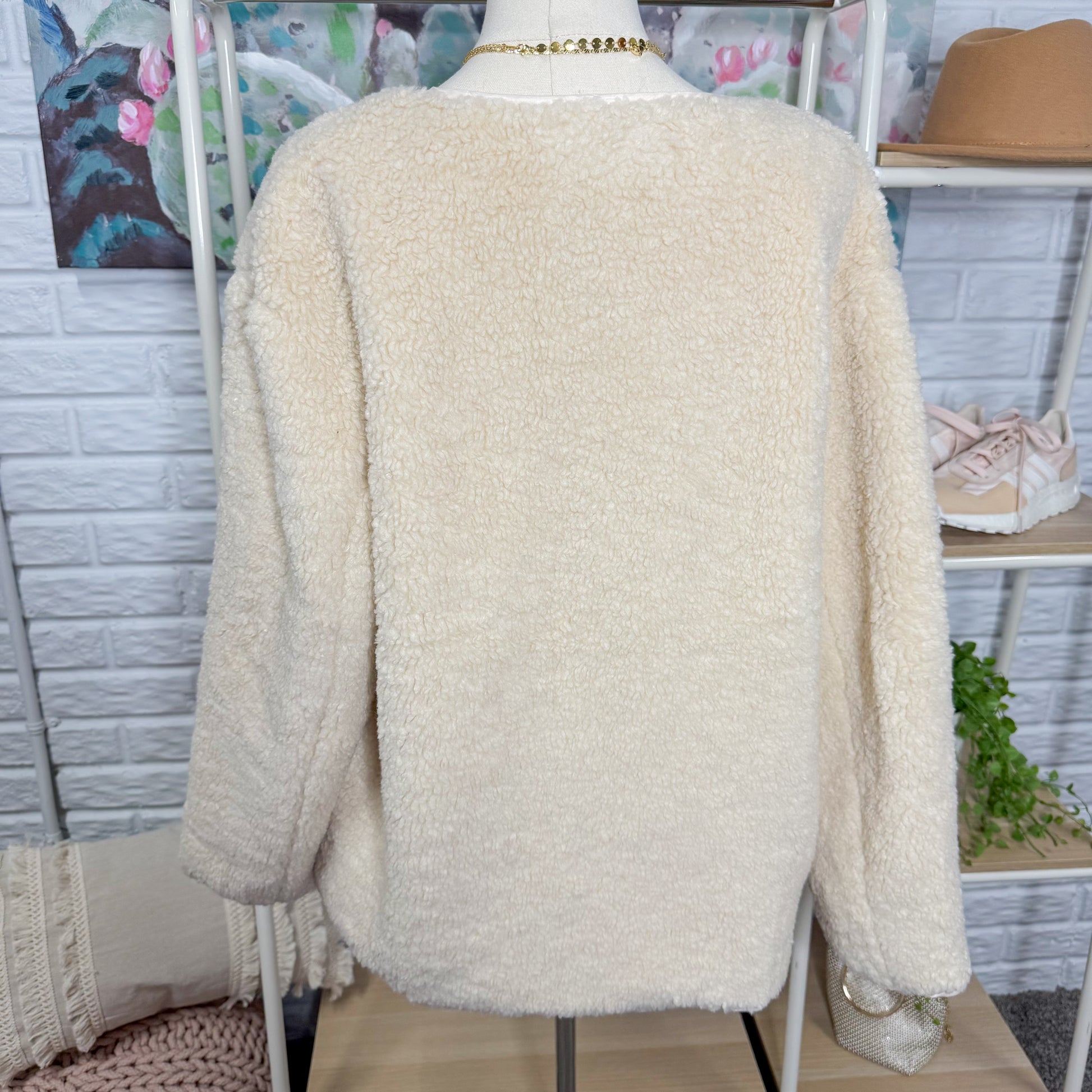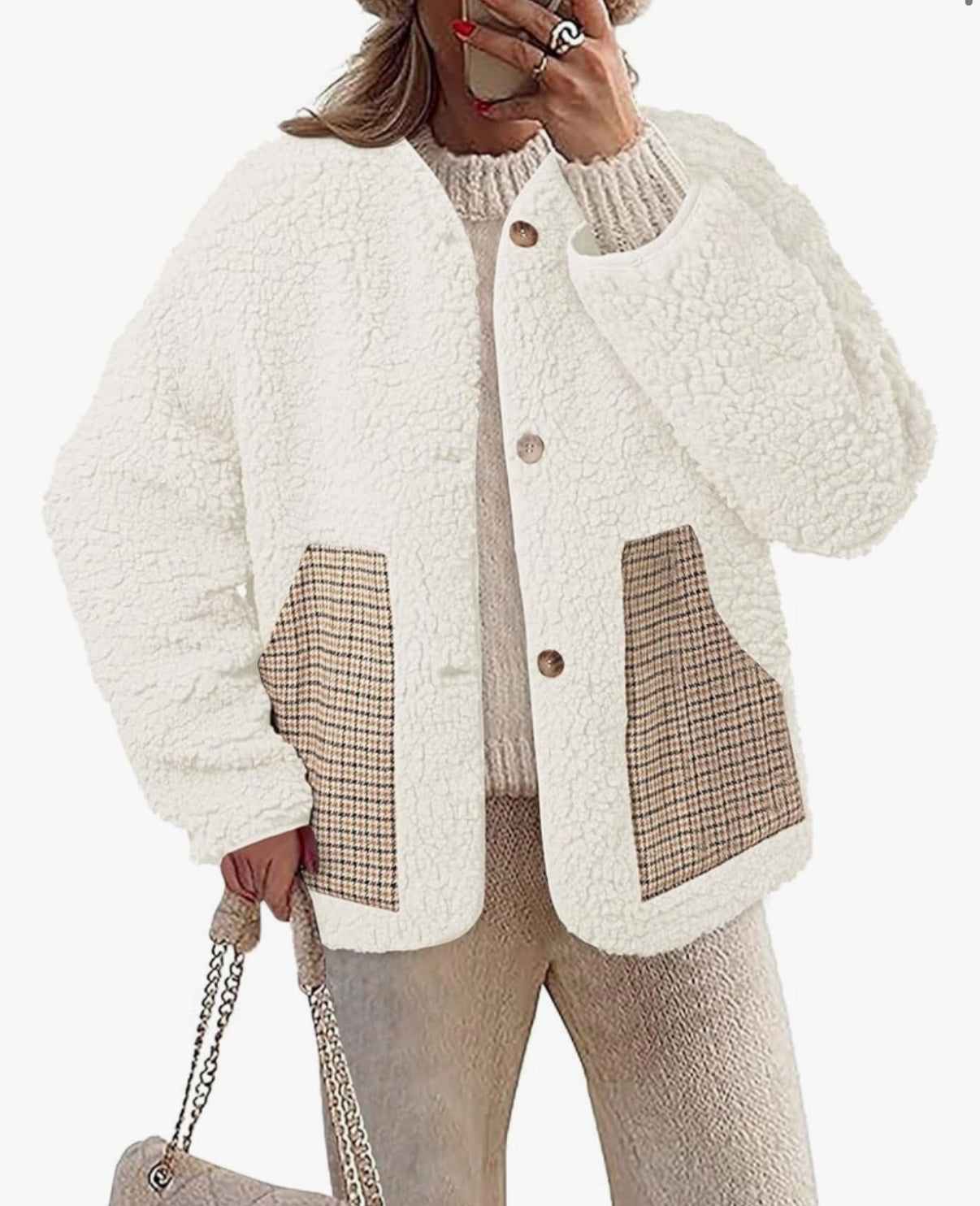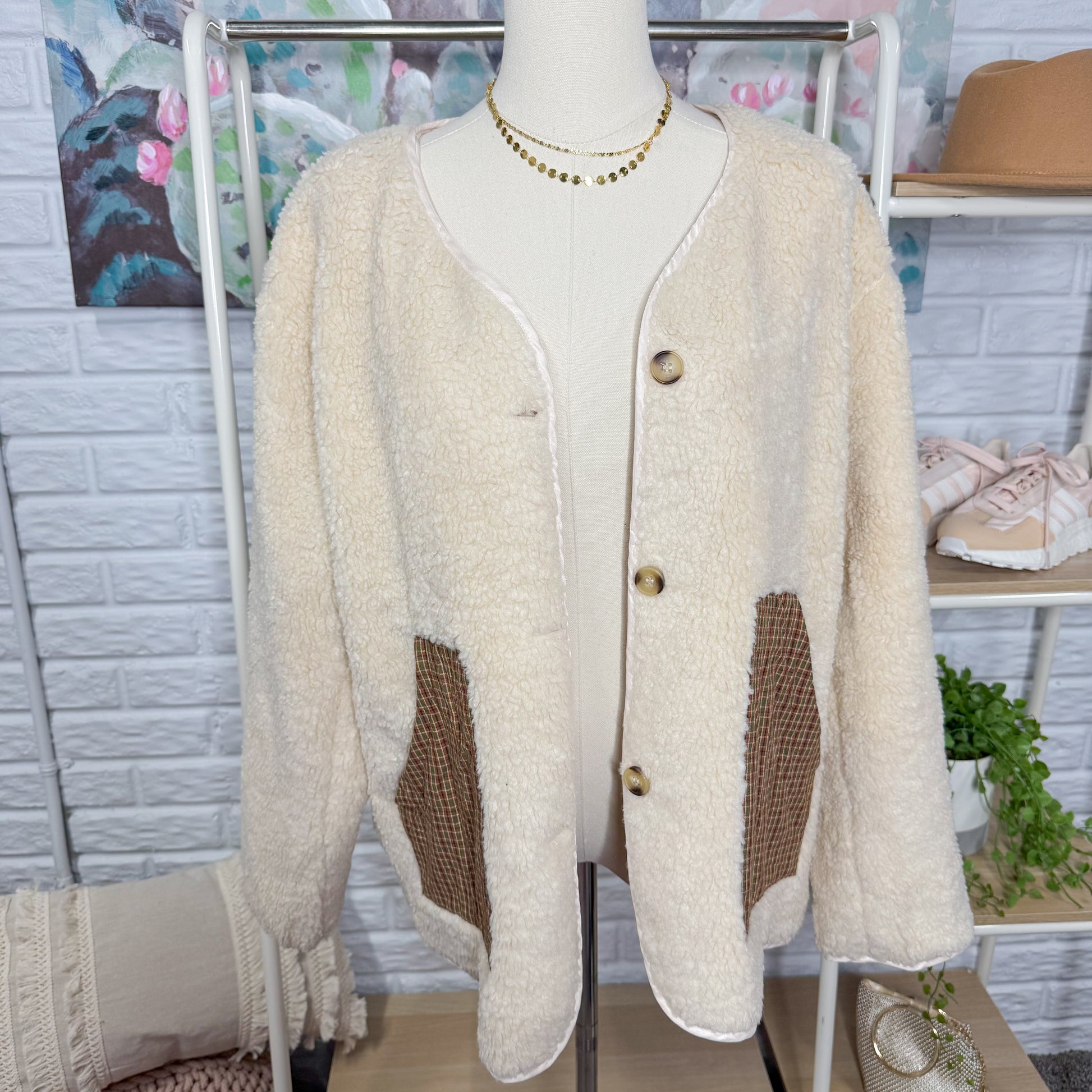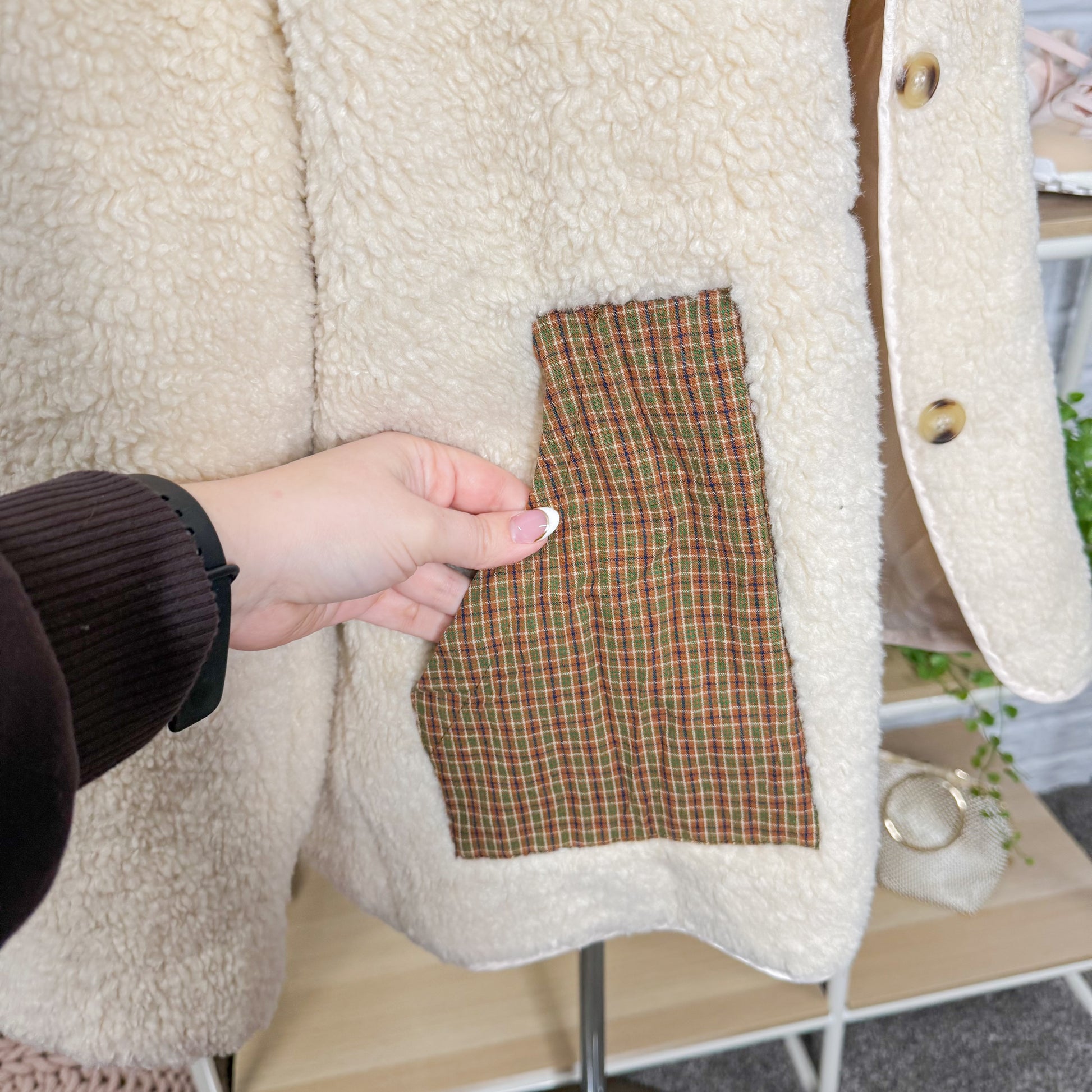 A cream Sherpa teddy oversized jacket with a button front and plaid pockets.