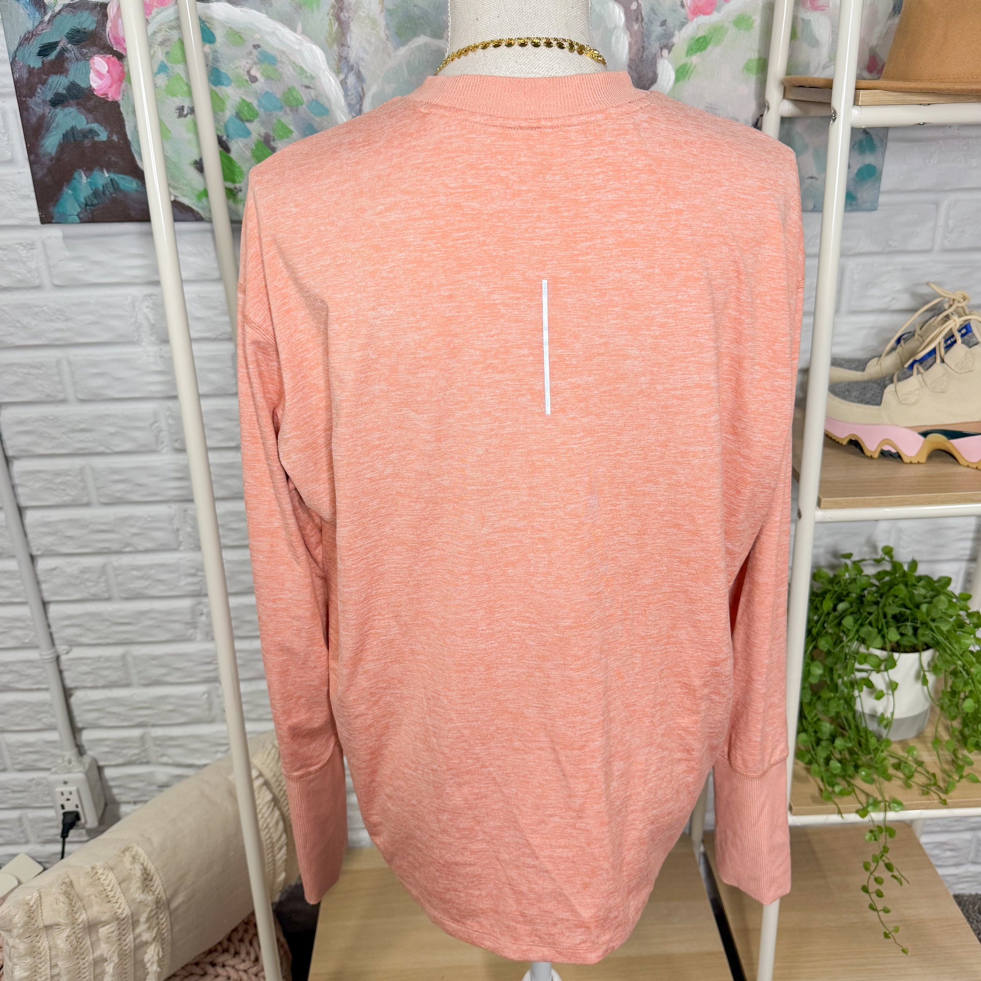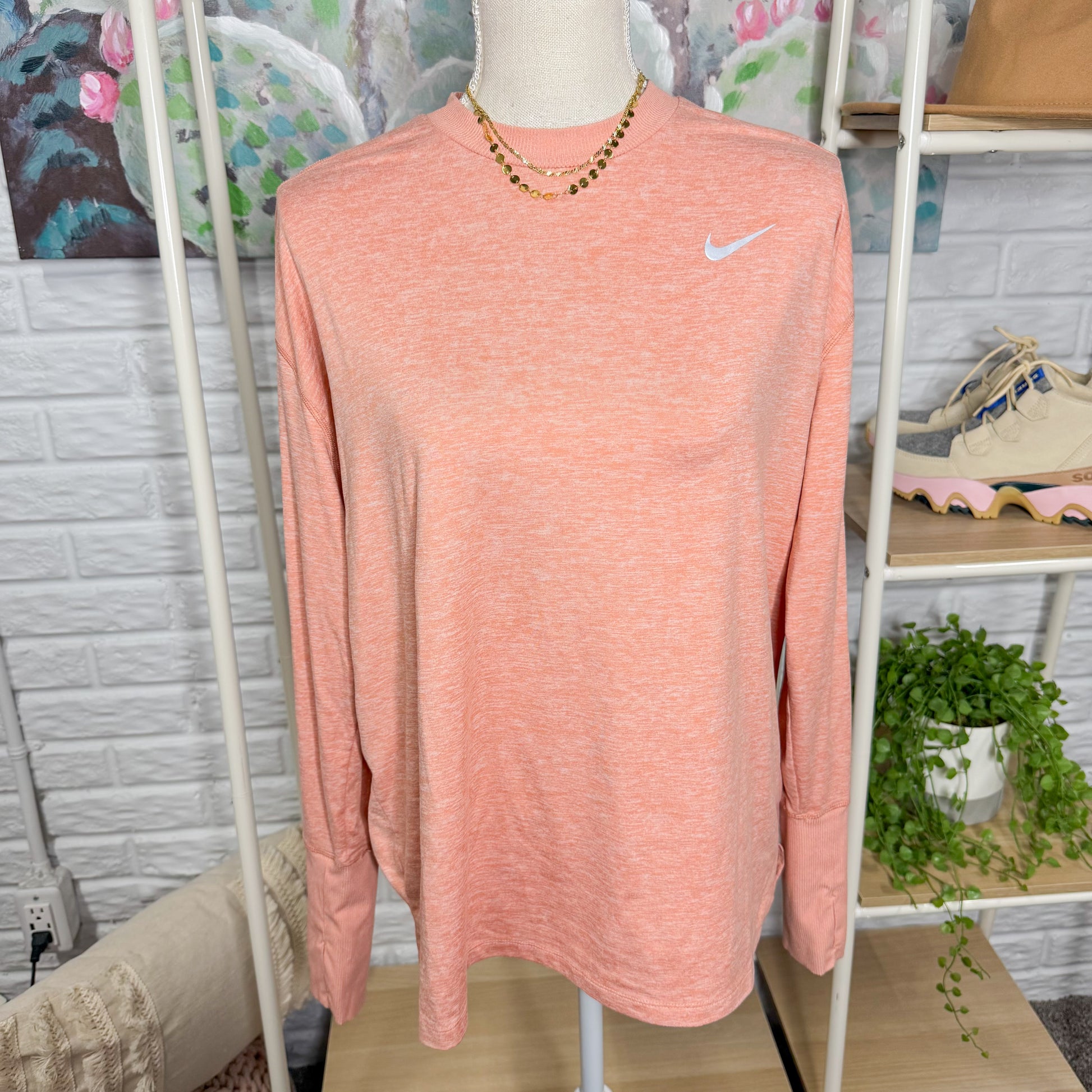 A peachy orange athletic long sleeve top with a small Nike symbol.
