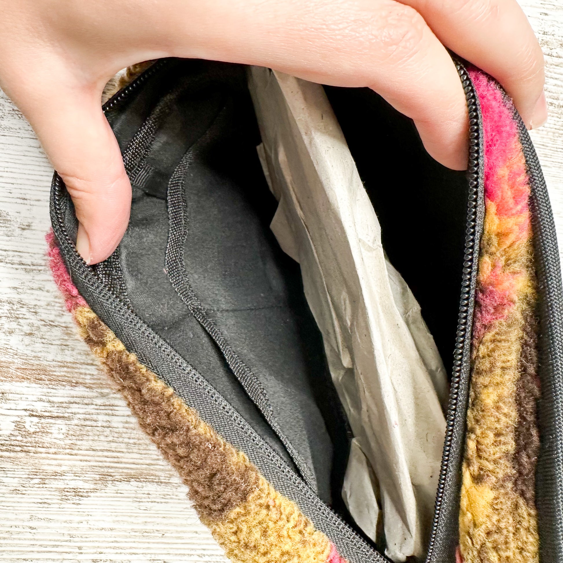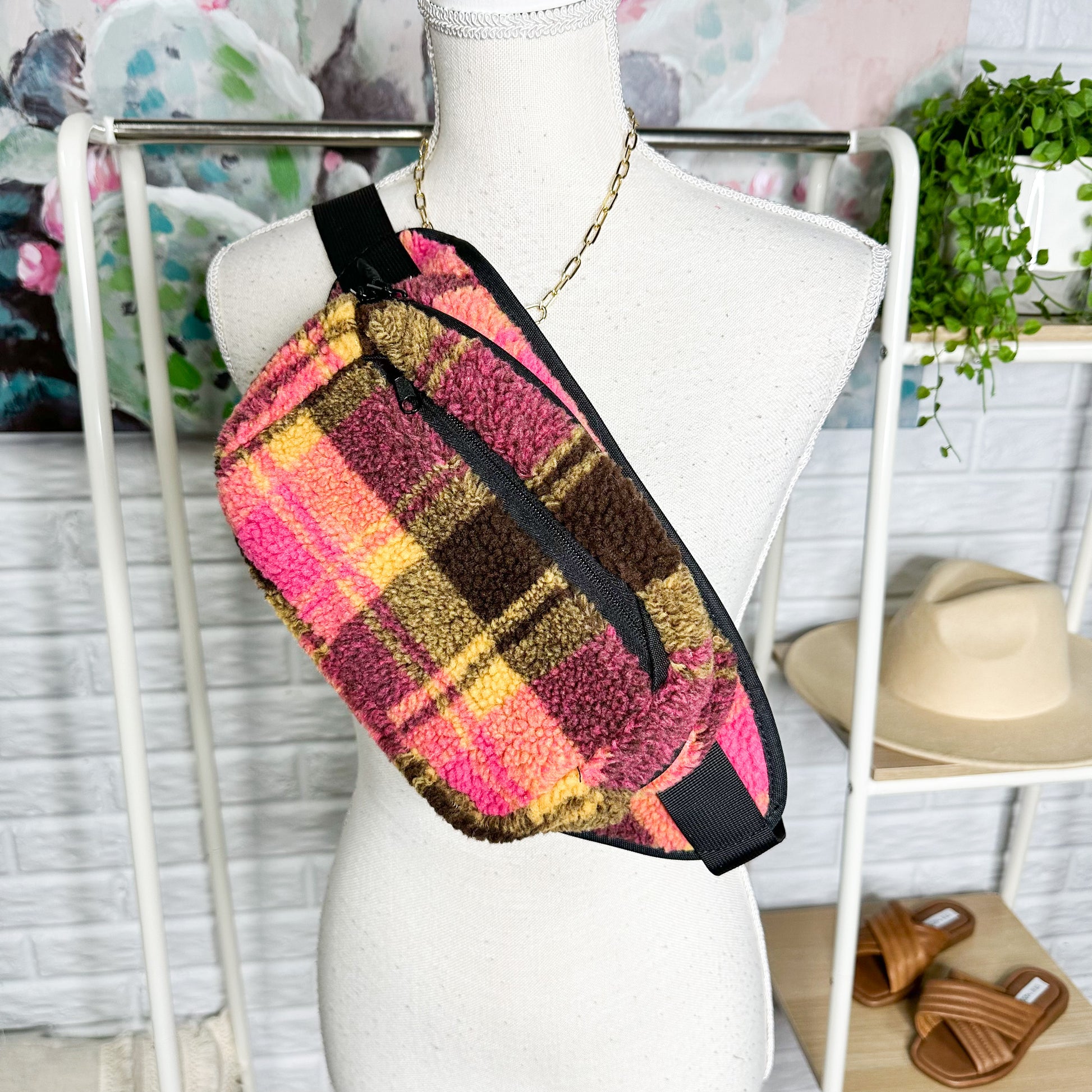 A Sherpa belt bag in black, pink, brown, and yellow plaid print.